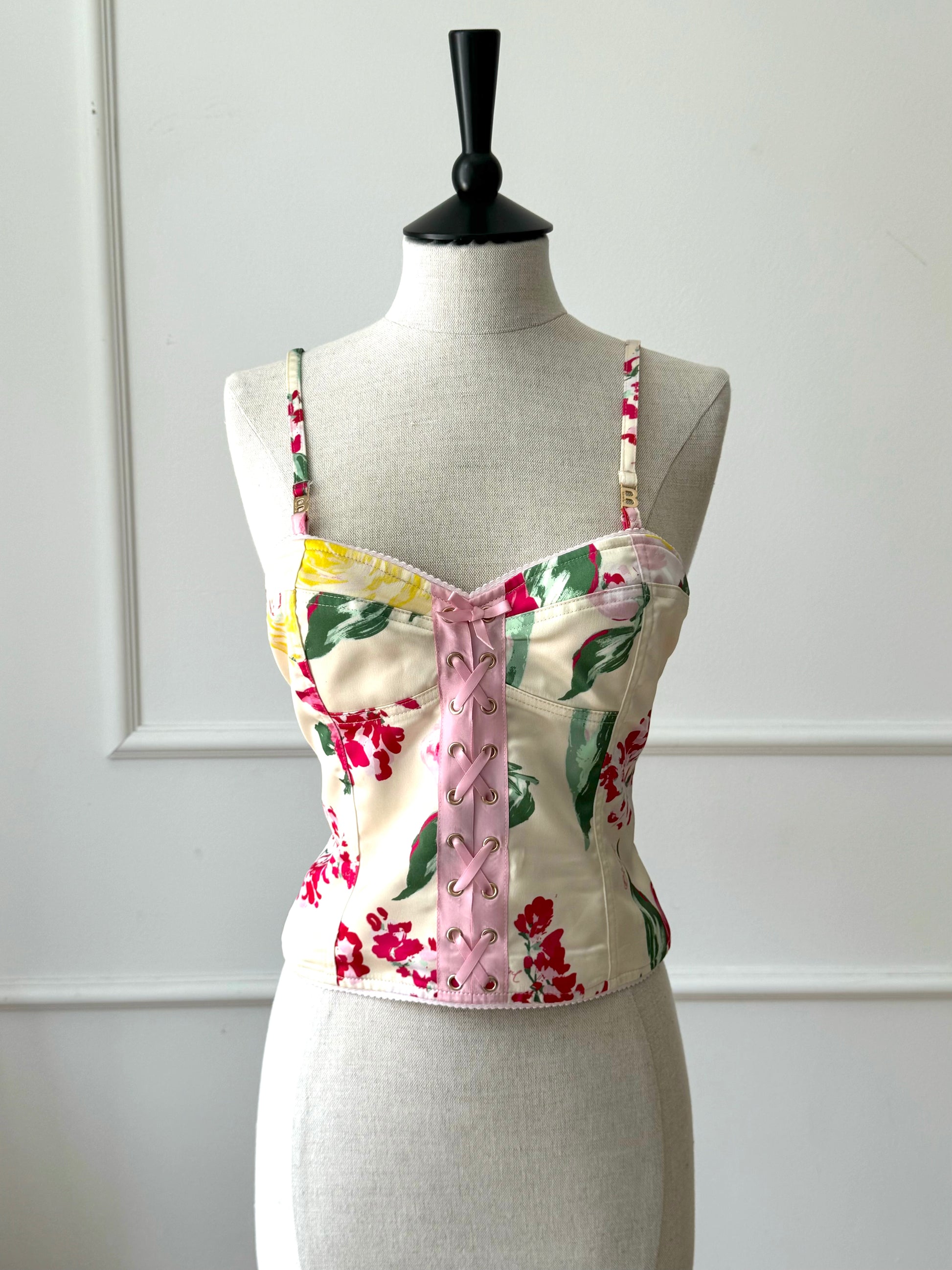 Stunning Blumarine Blugirl corset top circa 2000s in the floral, "Blugirl"-signed satin, adorned with lacy hem and a decorative front lacing. Feminine and romantic - it evokes Italian vacation and summer dates!