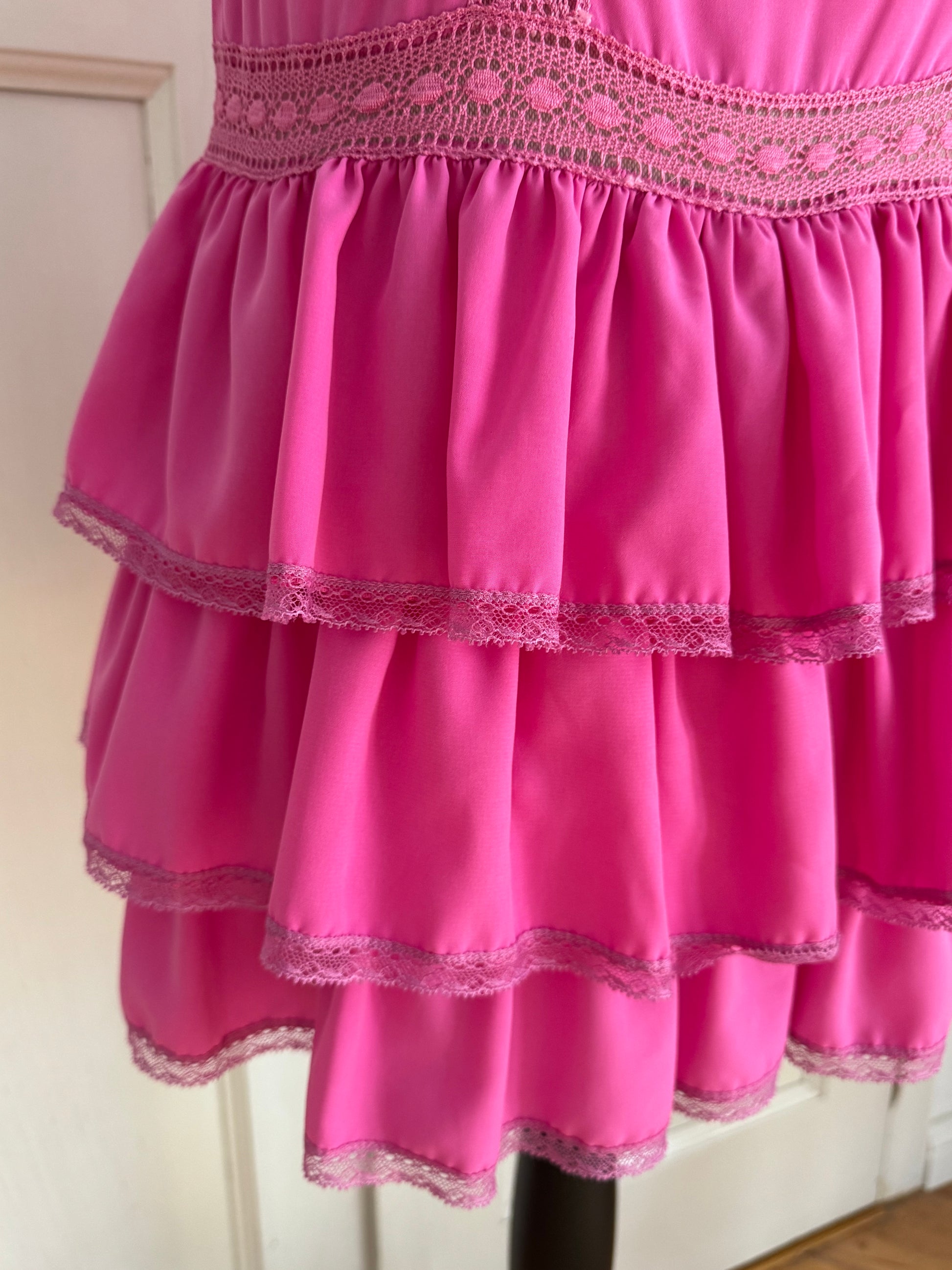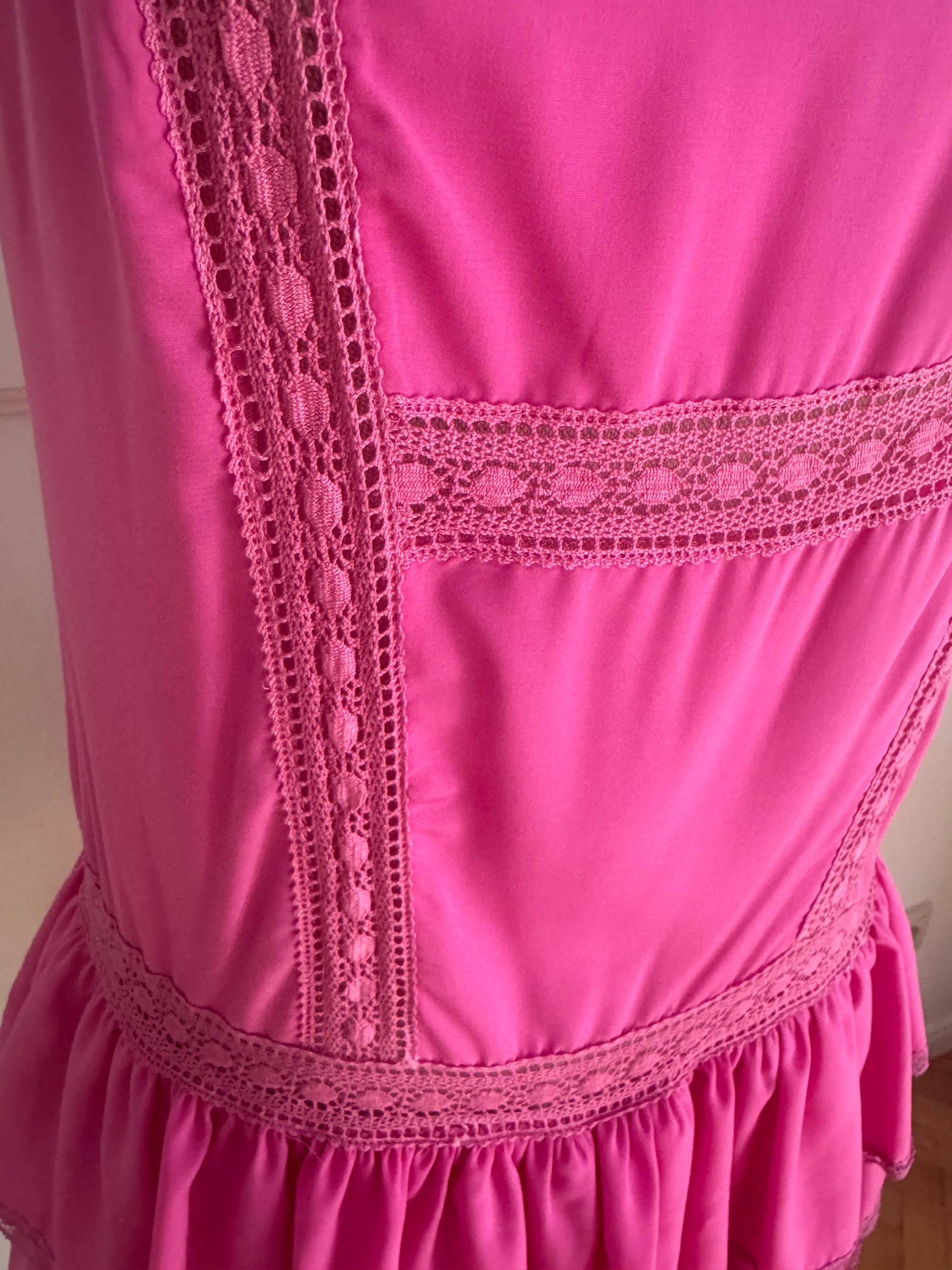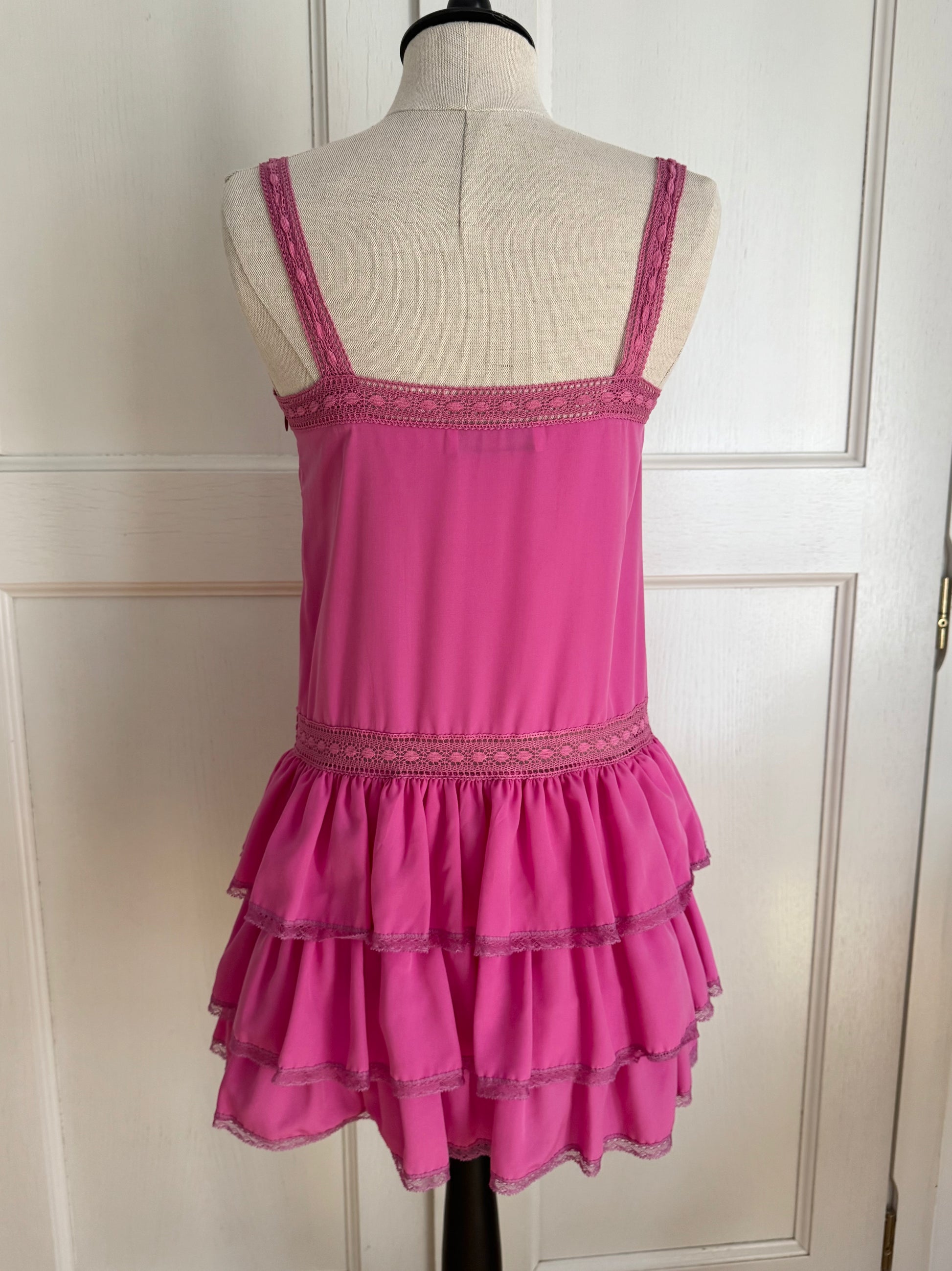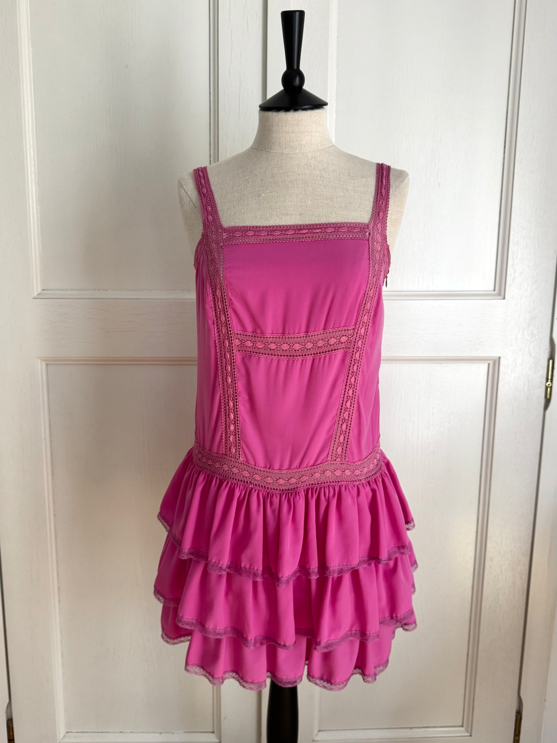 The epitome of Blumarine's girly style - stunning pink mini dress adorned with lace straps, lace inserts, and pink ruffles. Meant to be worn in the South of France in lavender fields.