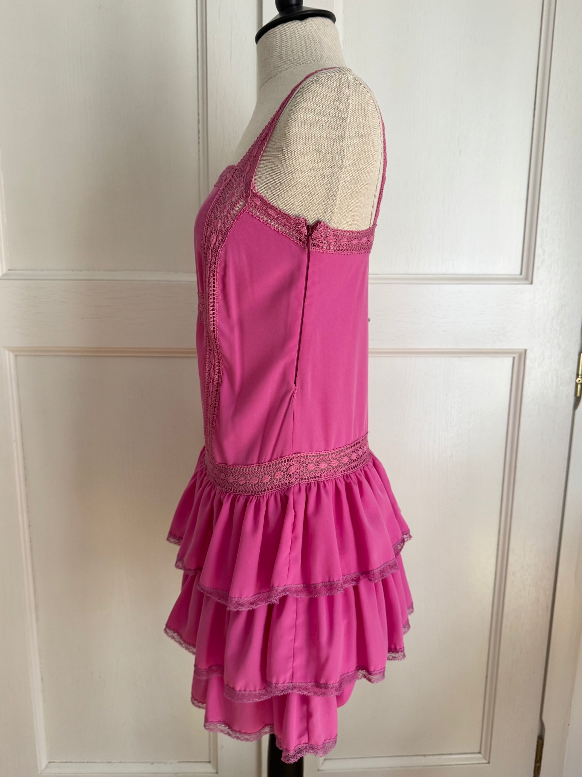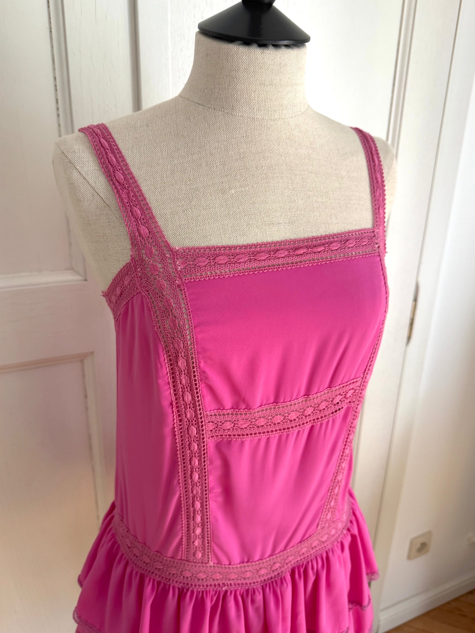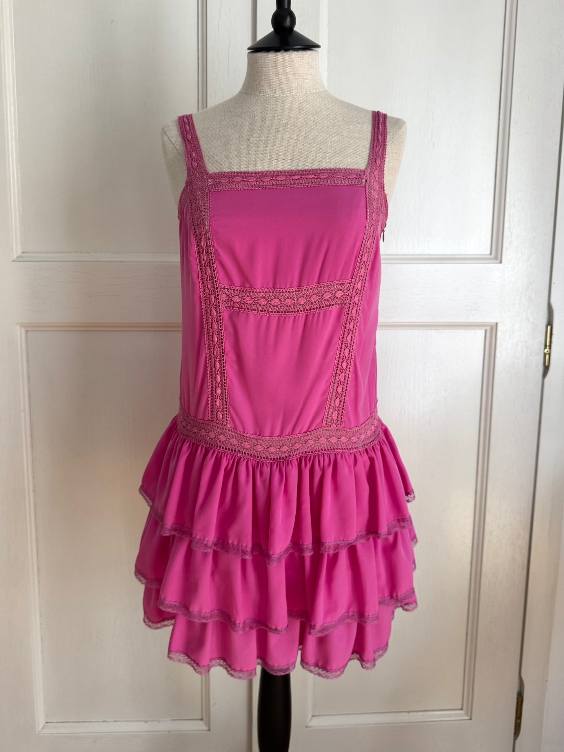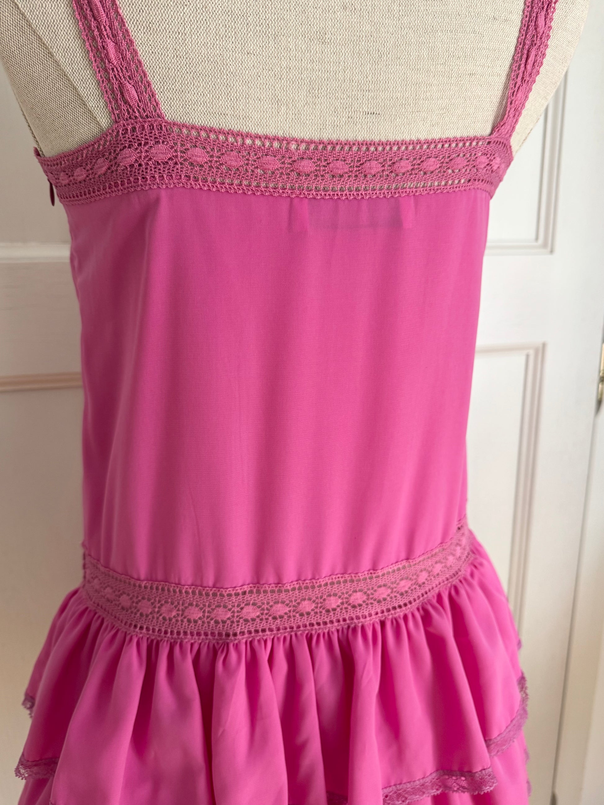 The epitome of Blumarine's girly style - stunning pink mini dress adorned with lace straps, lace inserts, and pink ruffles. Meant to be worn in the South of France in lavender fields.