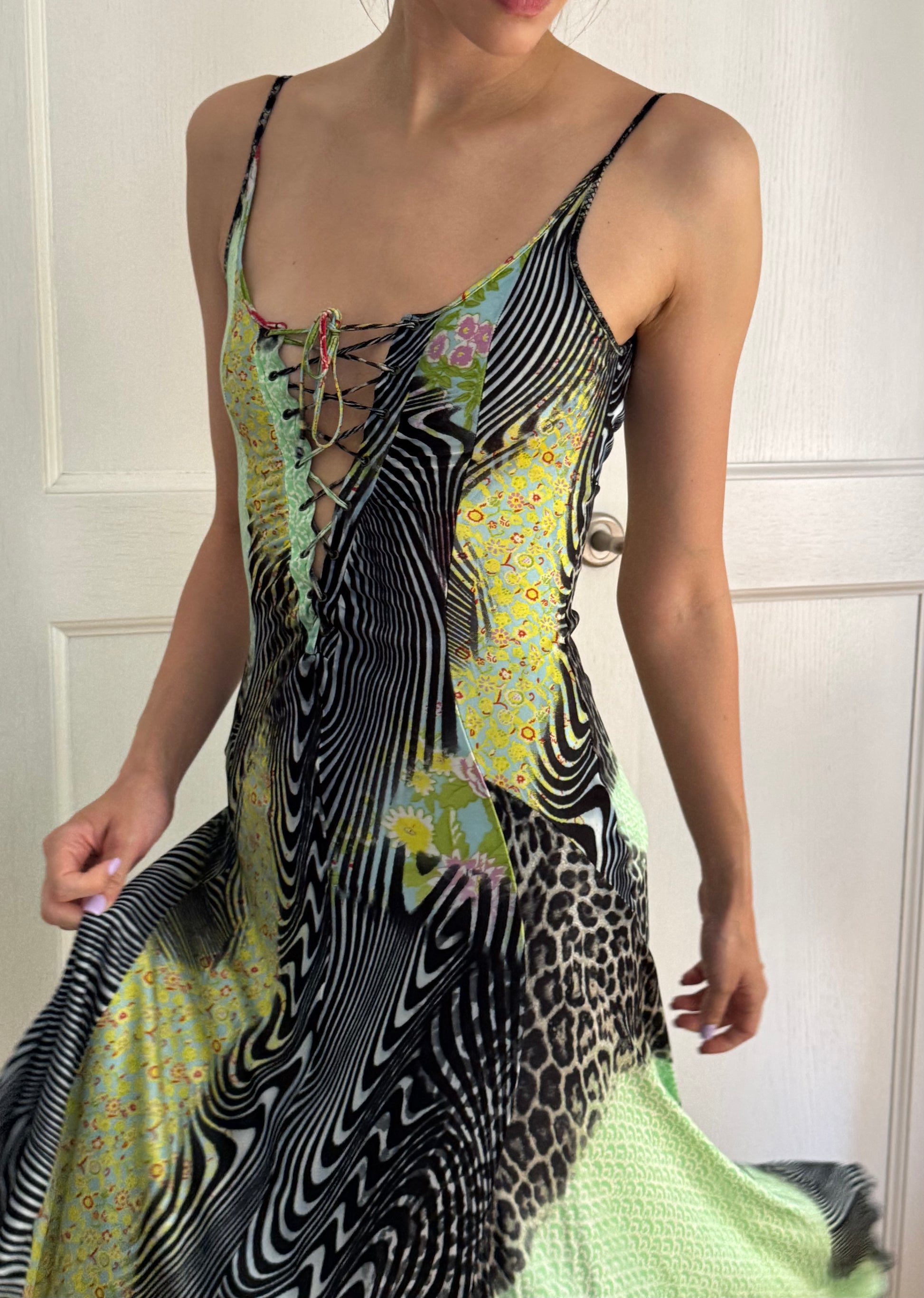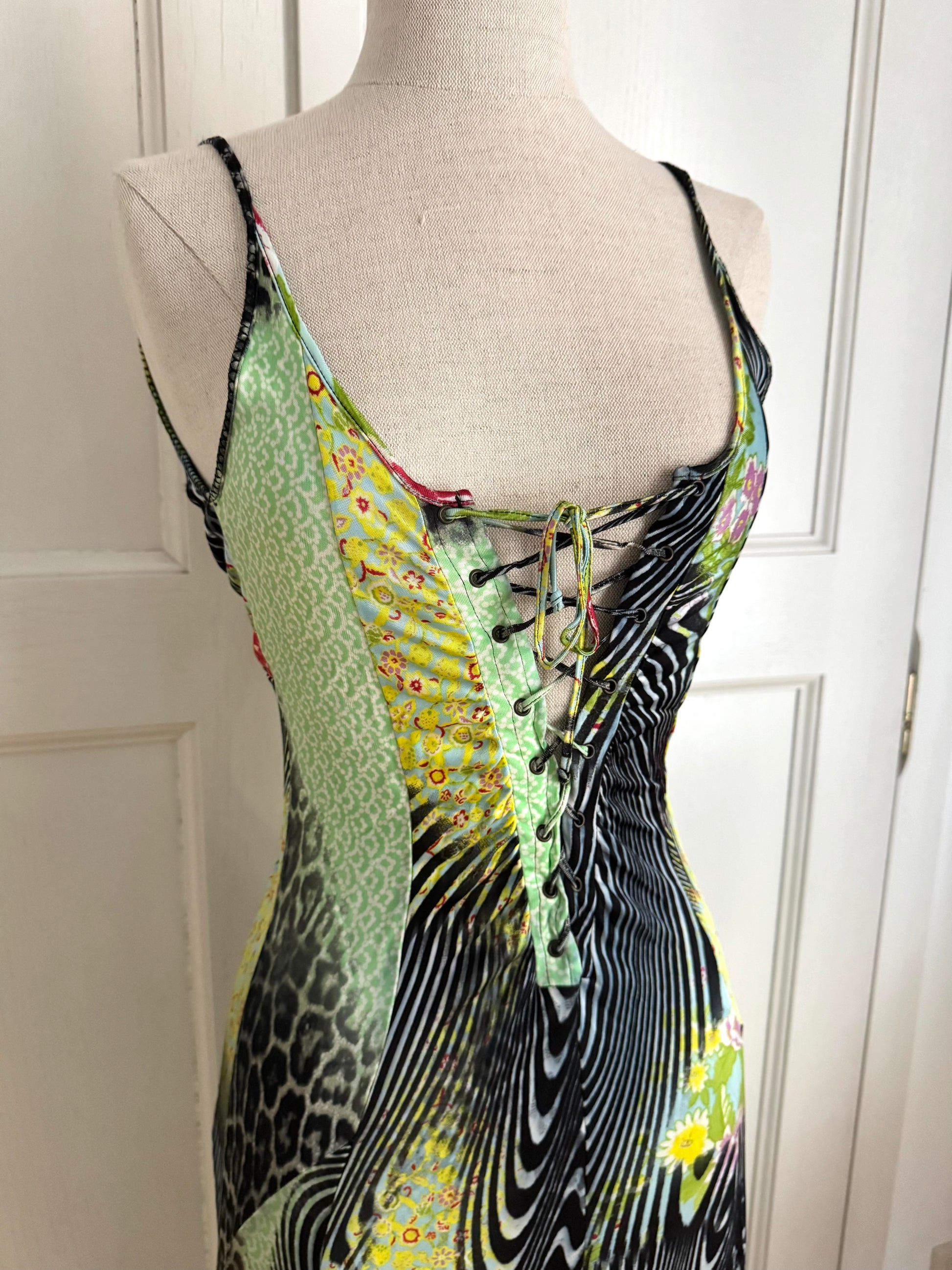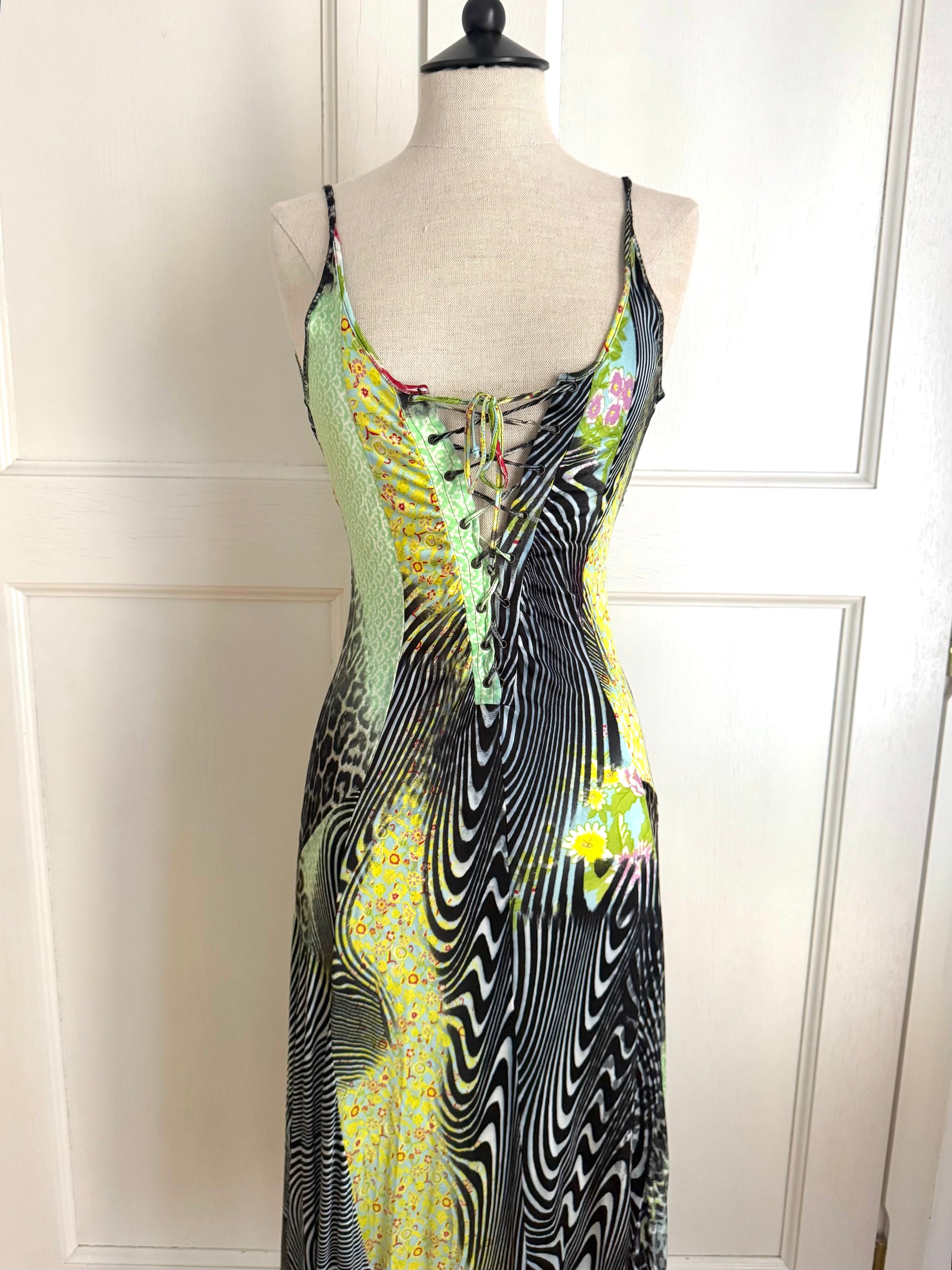 Absolutely stunning Class Cavalli dress in floral and animal print. Adorned with a lace-up back, decorative hem, a black lace décolletage, and made of the most incredibly soft viscose fabric you have ever touched. The cut of the dress and front stitching accentuates the waist and makes it extremely flattering on the body. Designed to be worn with the black lace at the front but putting it the other way gives you even more alluring look (see the photos). Created to turn heads.
