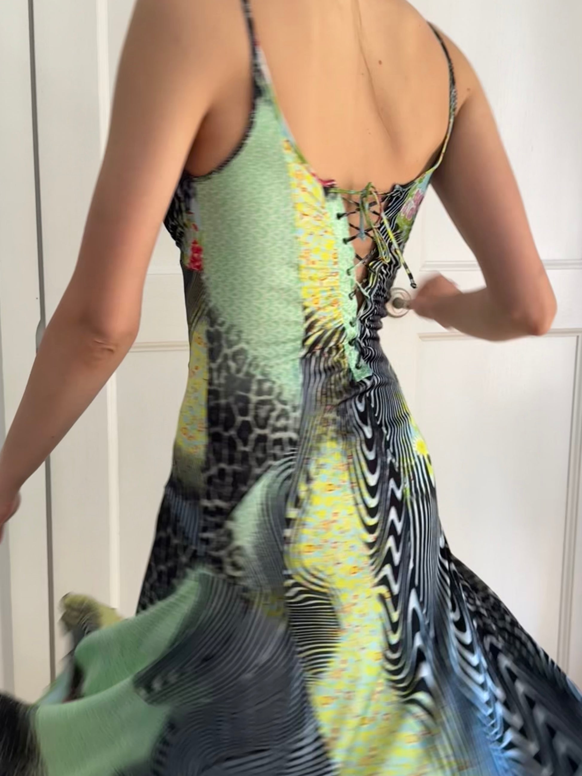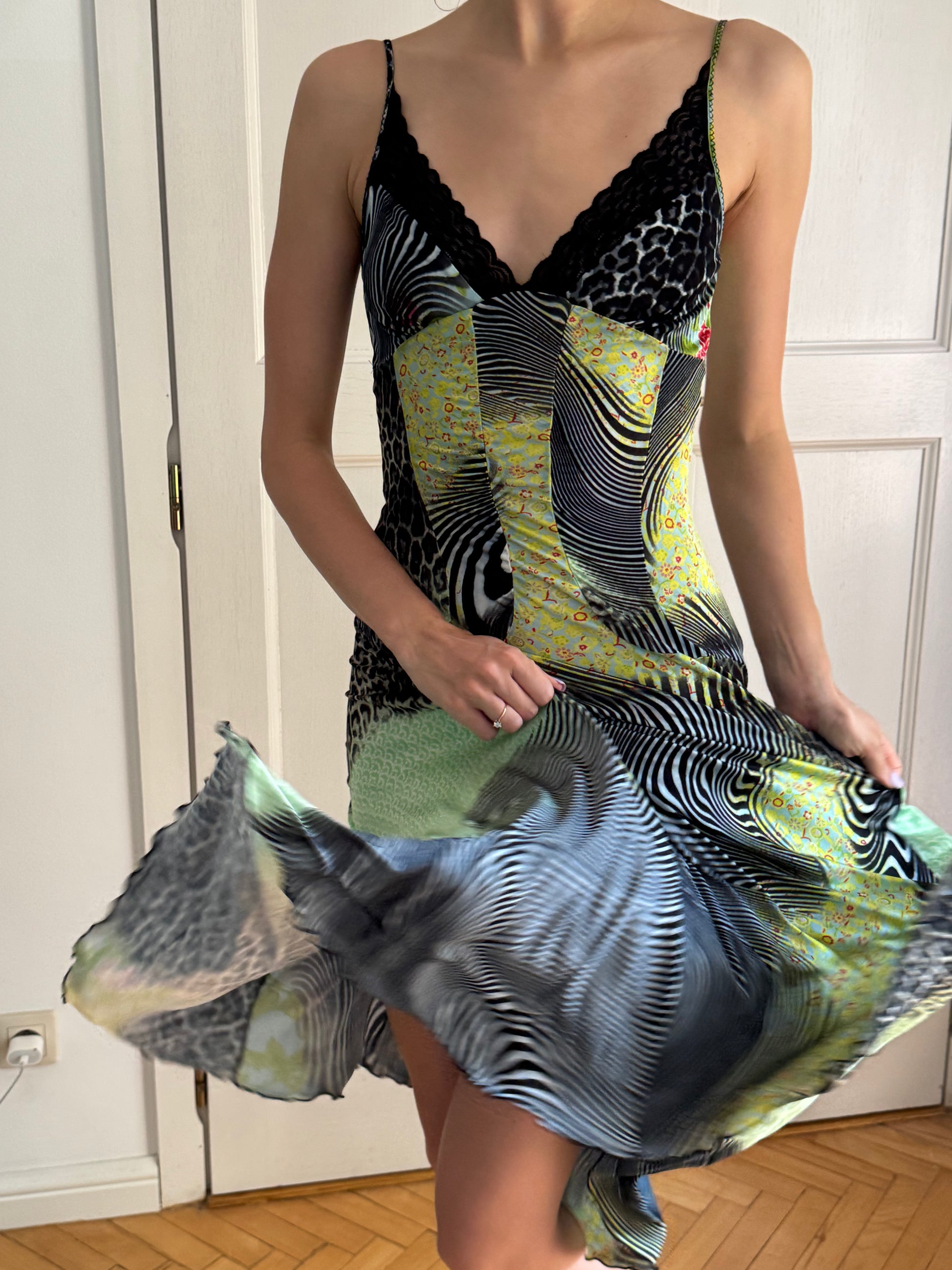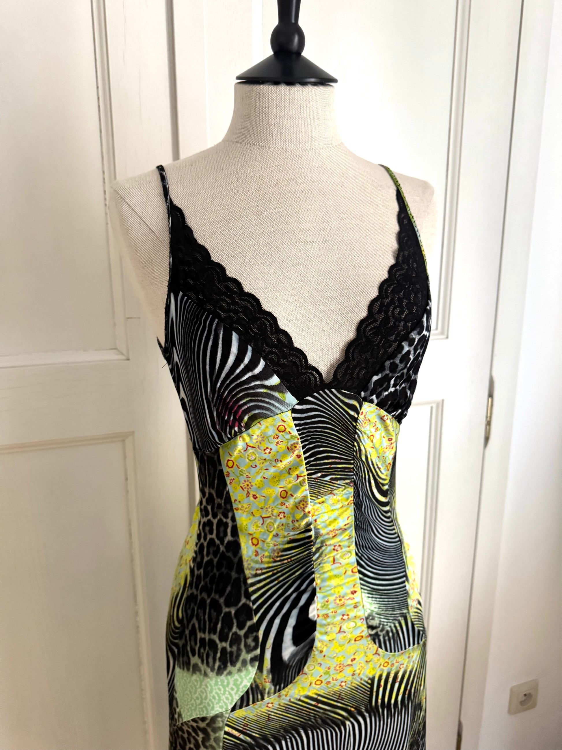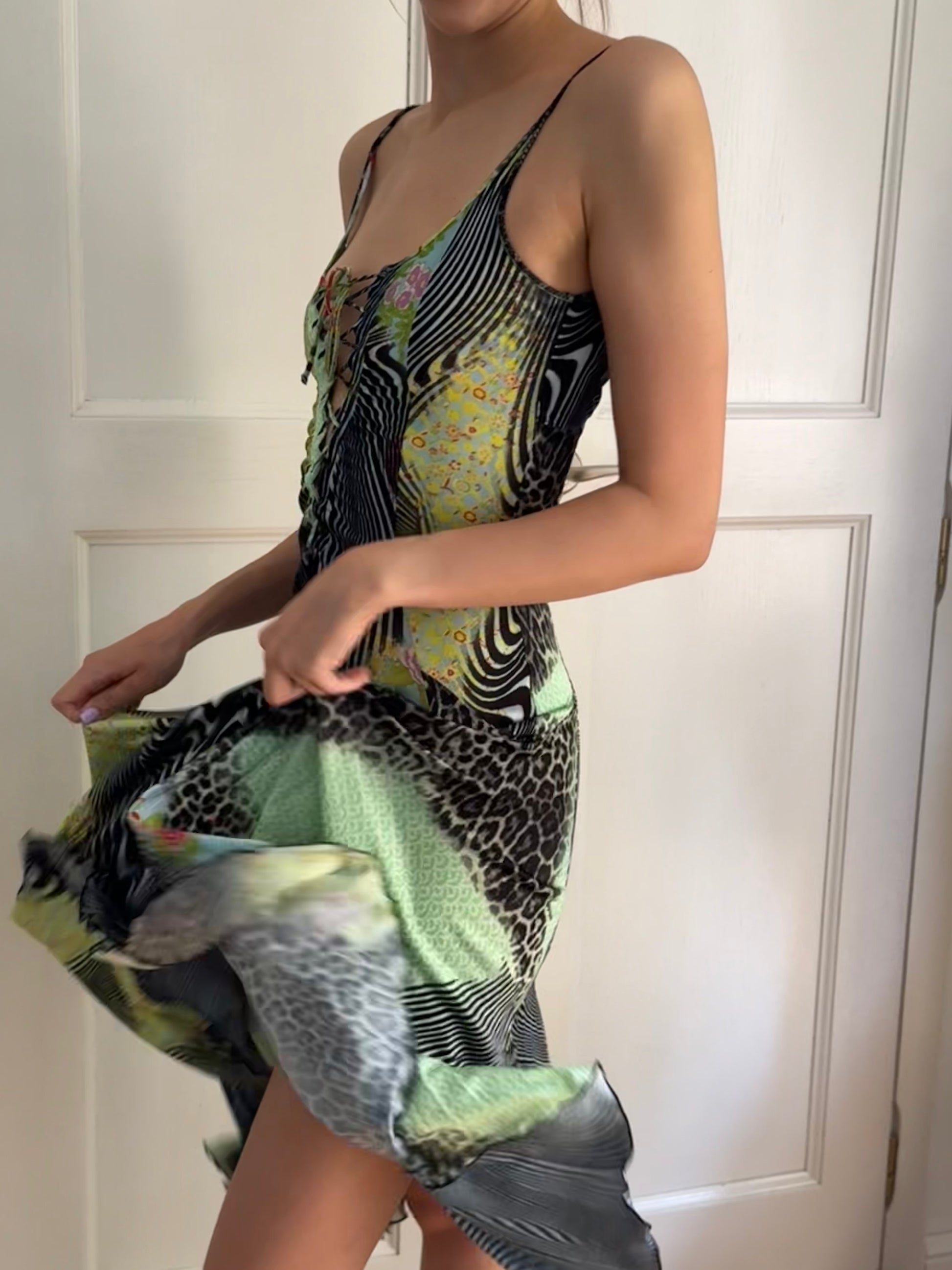 Absolutely stunning Class Cavalli dress in floral and animal print. Adorned with a lace-up back, decorative hem, a black lace décolletage, and made of the most incredibly soft viscose fabric you have ever touched. The cut of the dress and front stitching accentuates the waist and makes it extremely flattering on the body. Designed to be worn with the black lace at the front but putting it the other way gives you even more alluring look (see the photos). Created to turn heads.