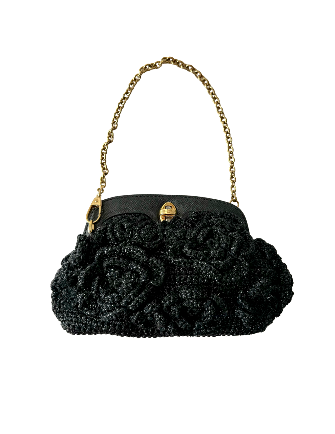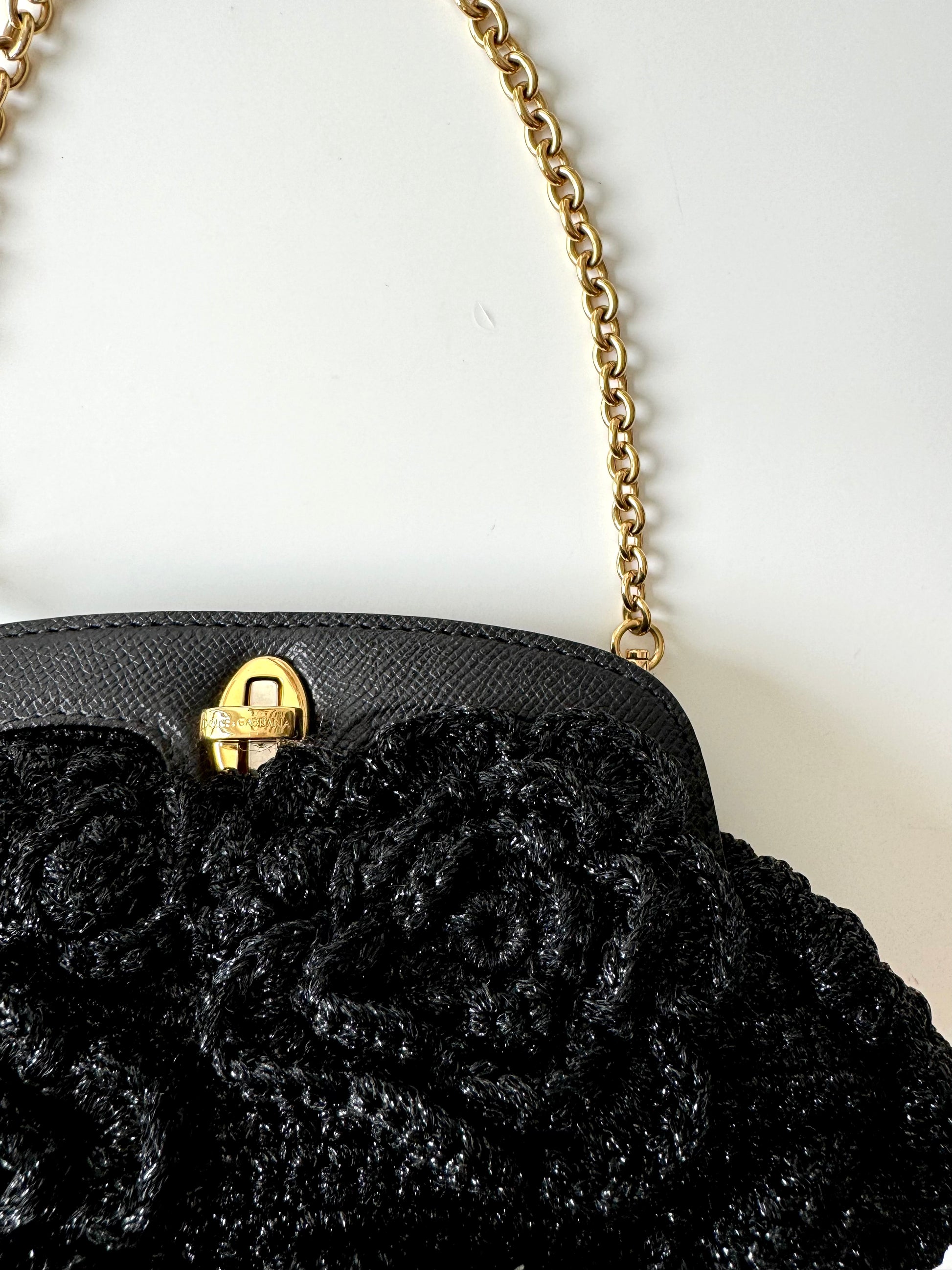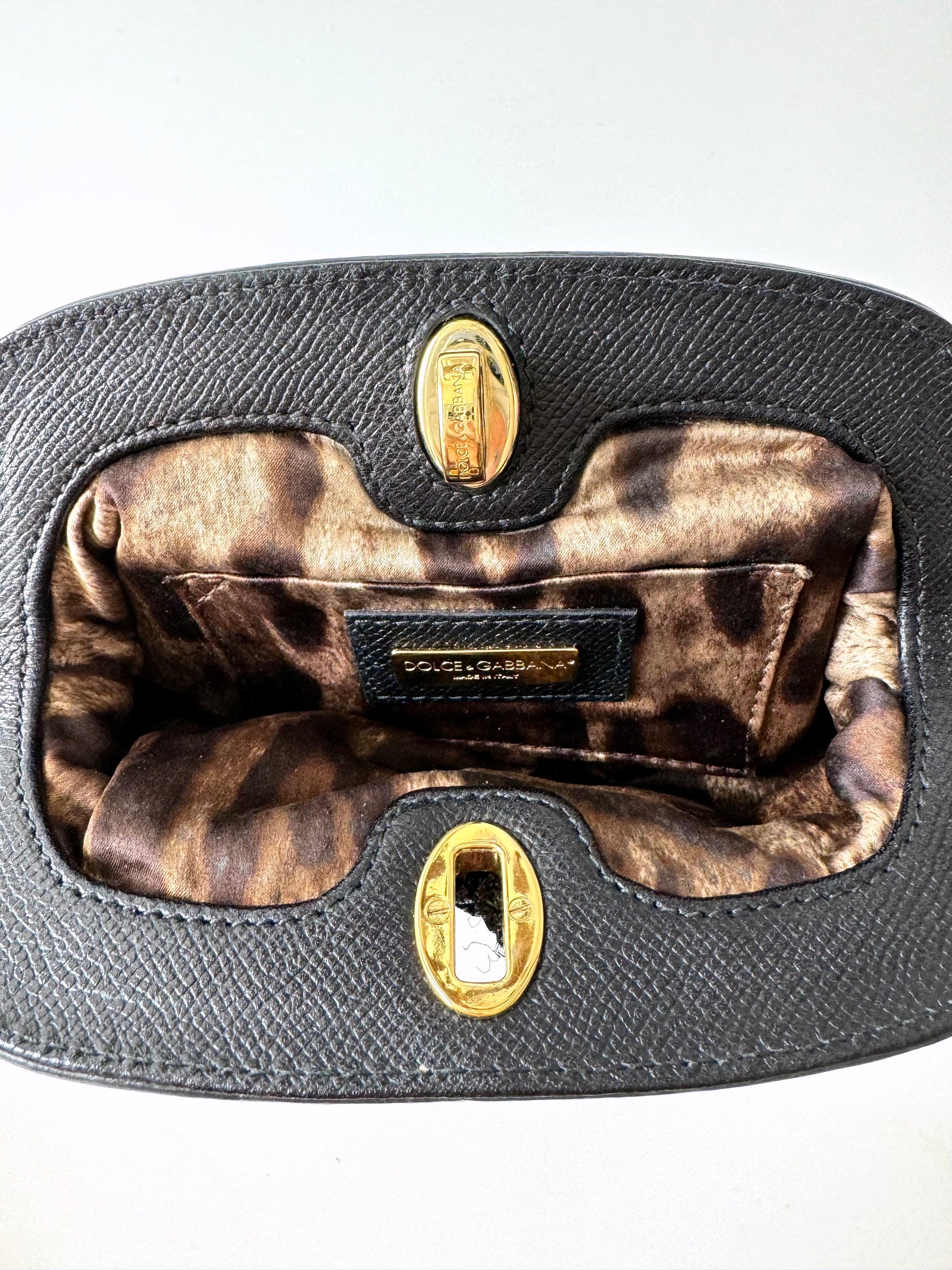 Stunning DG bag in vintage style that's simply made for strolling around streets of Palermo like Sophia Loren or Monica Bellucci. The purse in classic DG aesthetic is adorned with black roses, gold, DG-signed hardware, and an animal print lining. Take it with you on your next Dolce Vita trip!