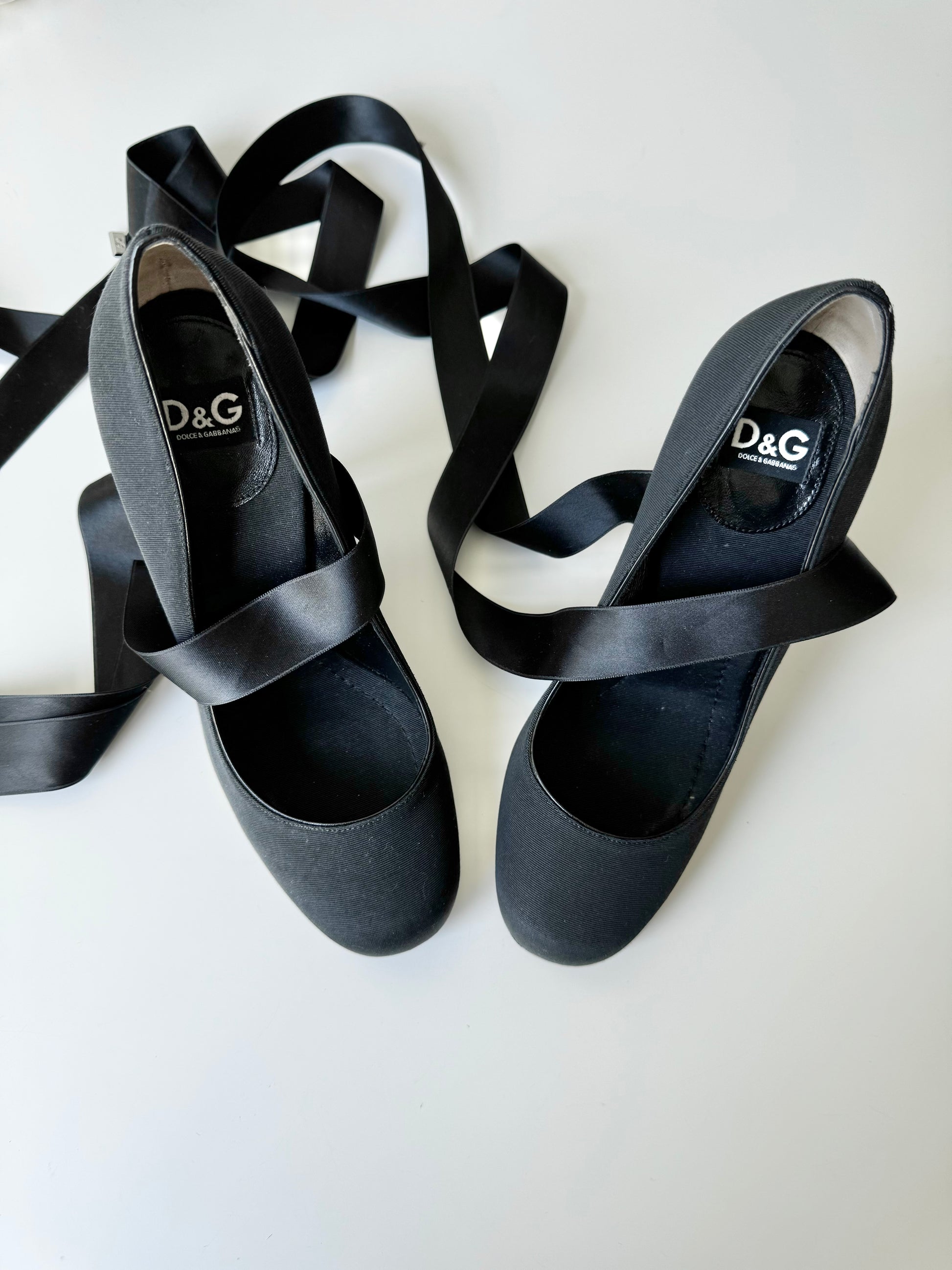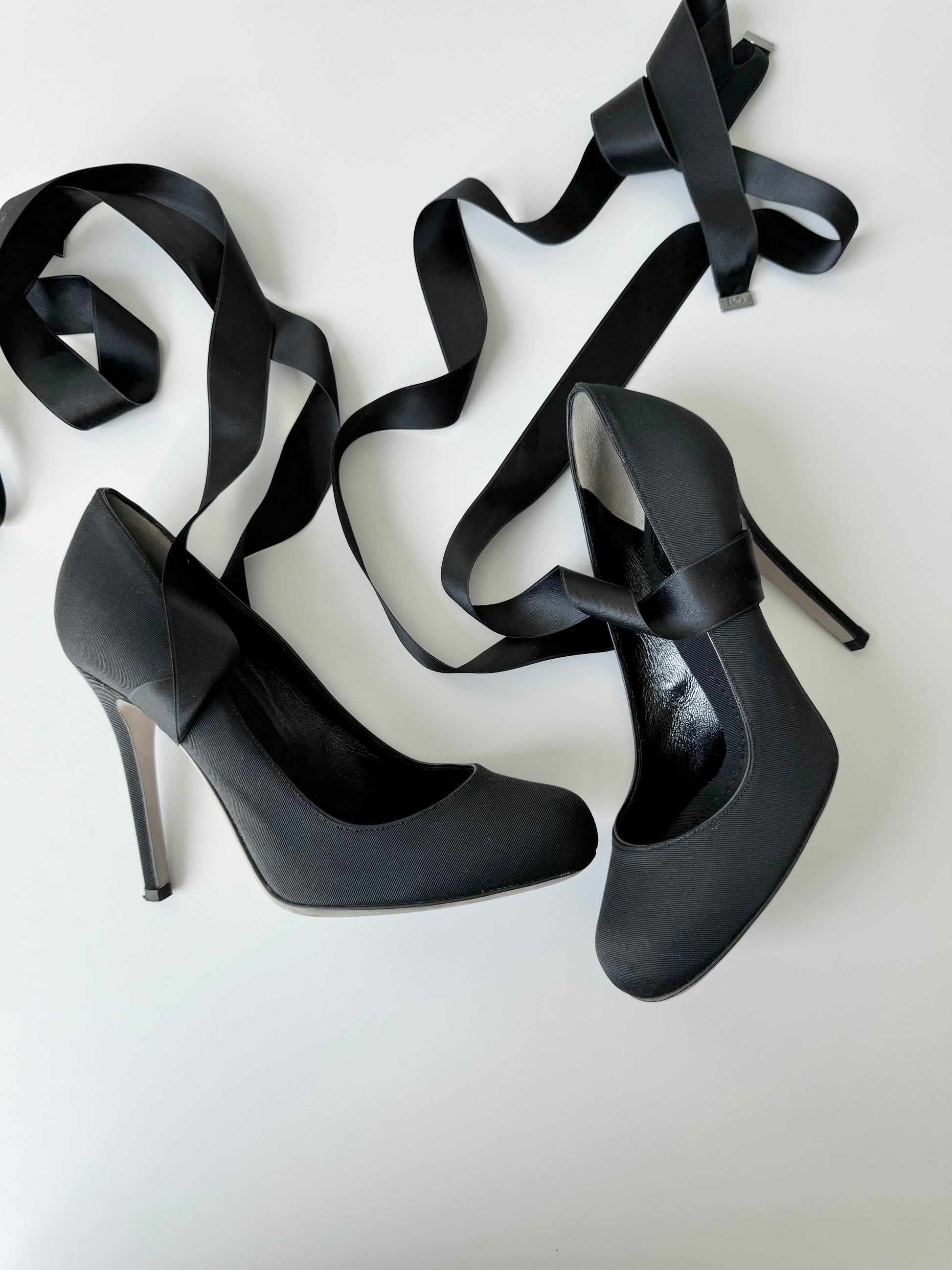 Stunning black pumps by D&G with satin ribbons. Classic style with a twist. Very feminine and perfect for both elegant and more y2k ballet core outfits. Sold with complementary dust bag.