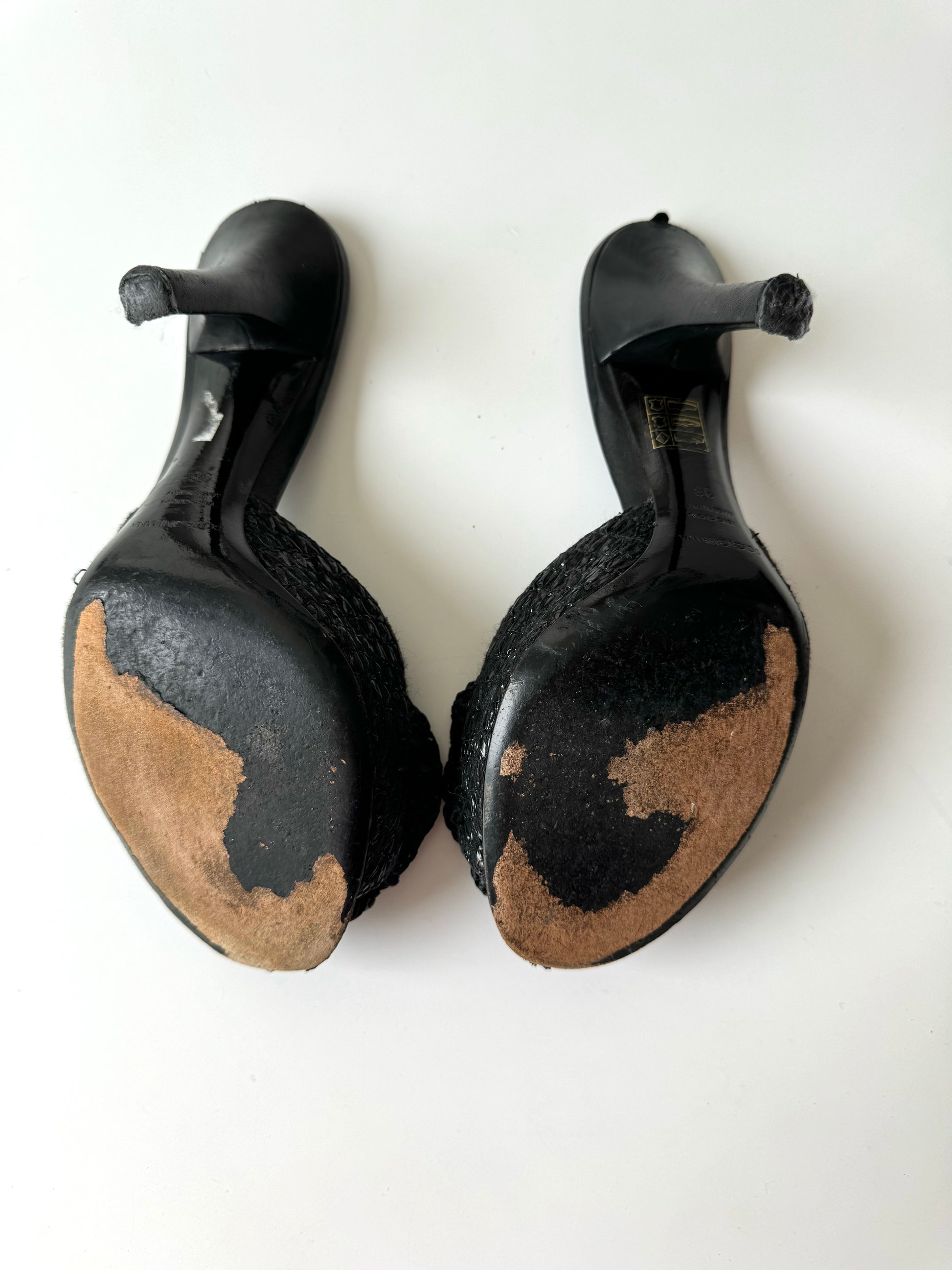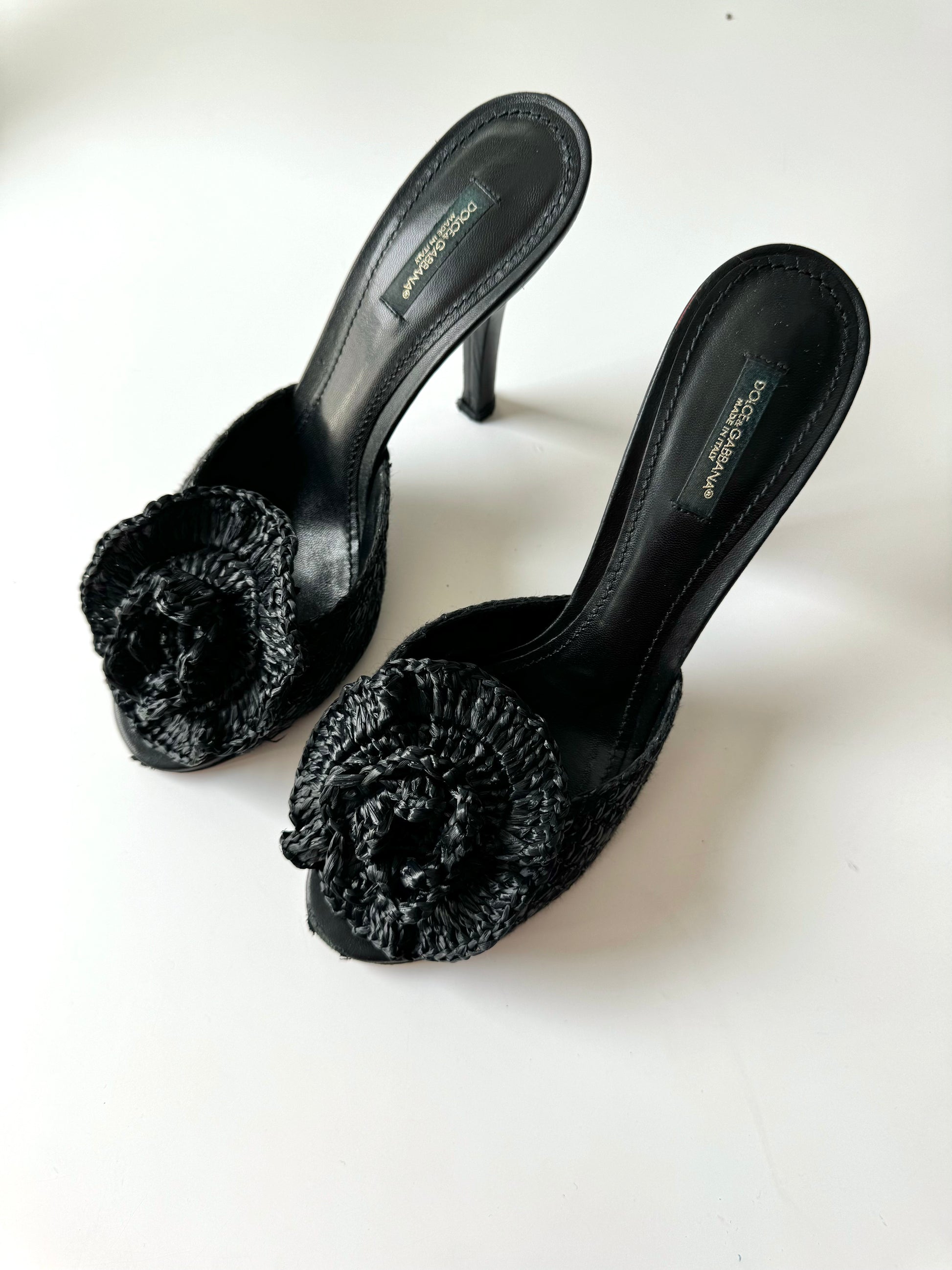 Absolutely stunning Dolce and Gabbana peep-toe mules adorned with a black raffia-like rose. The epitome of the 90s D&G Sicilian aesthetic. Meant to be treasured forever.