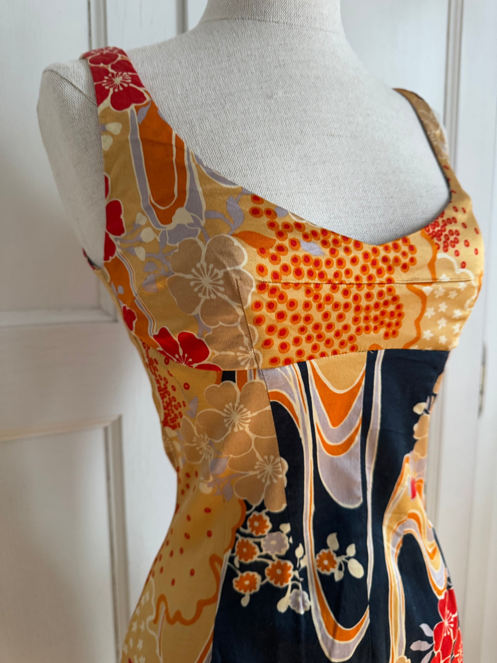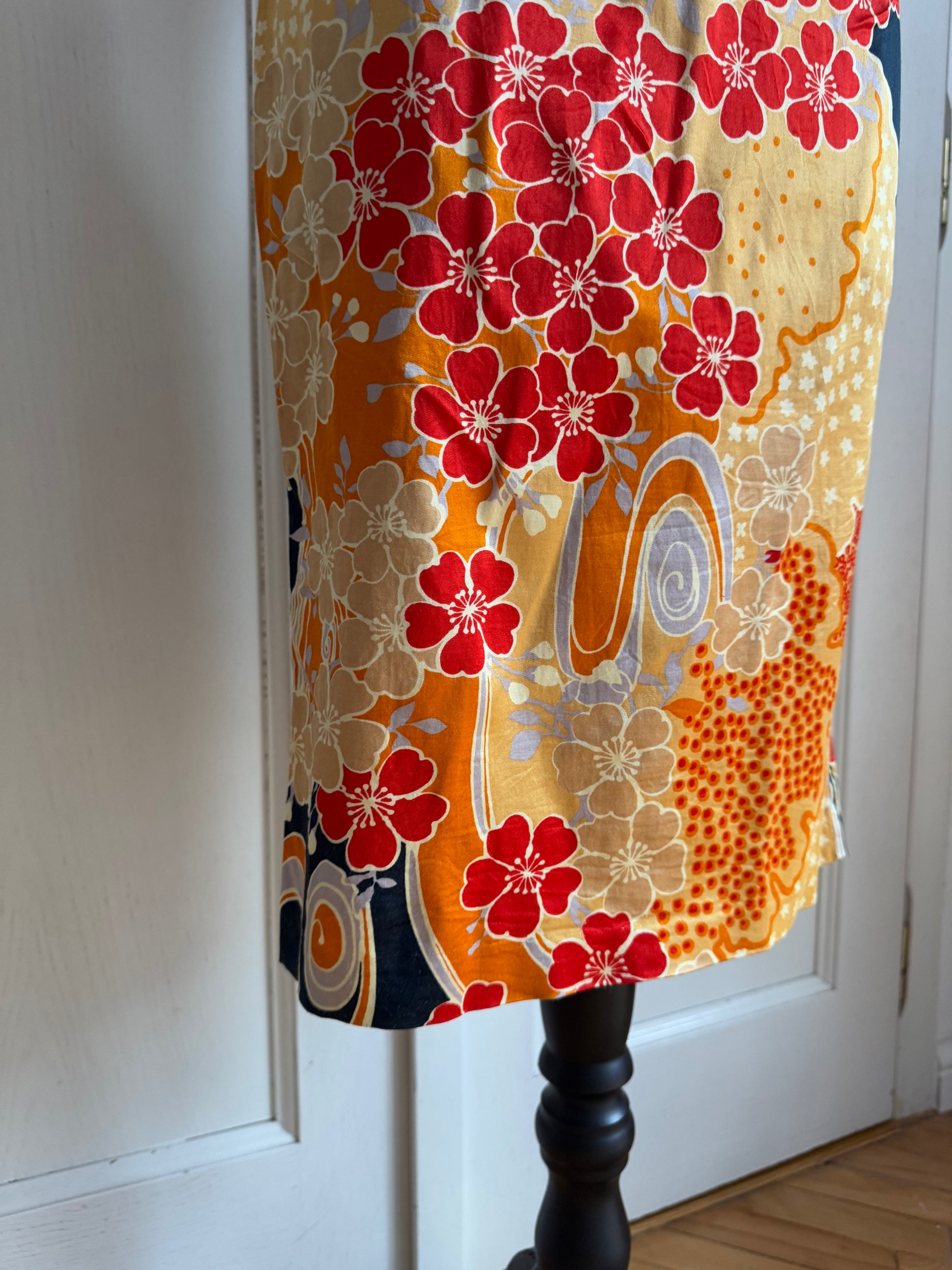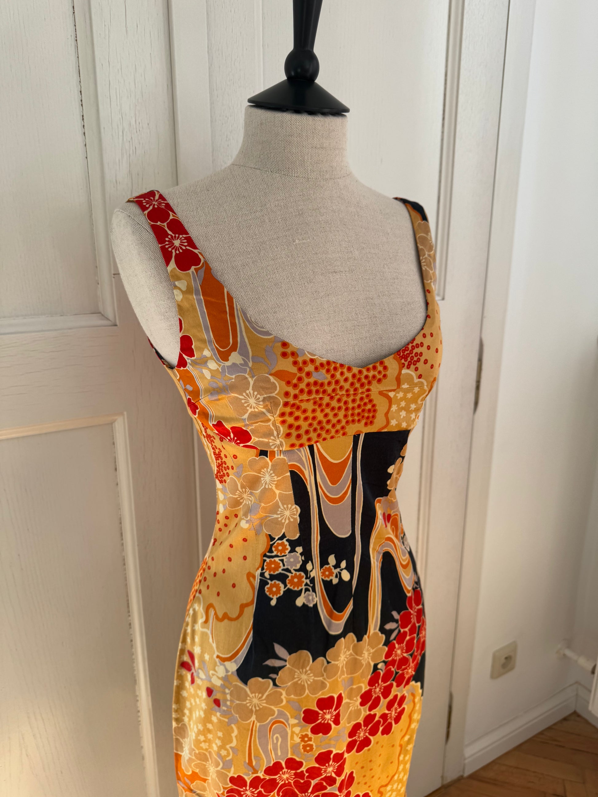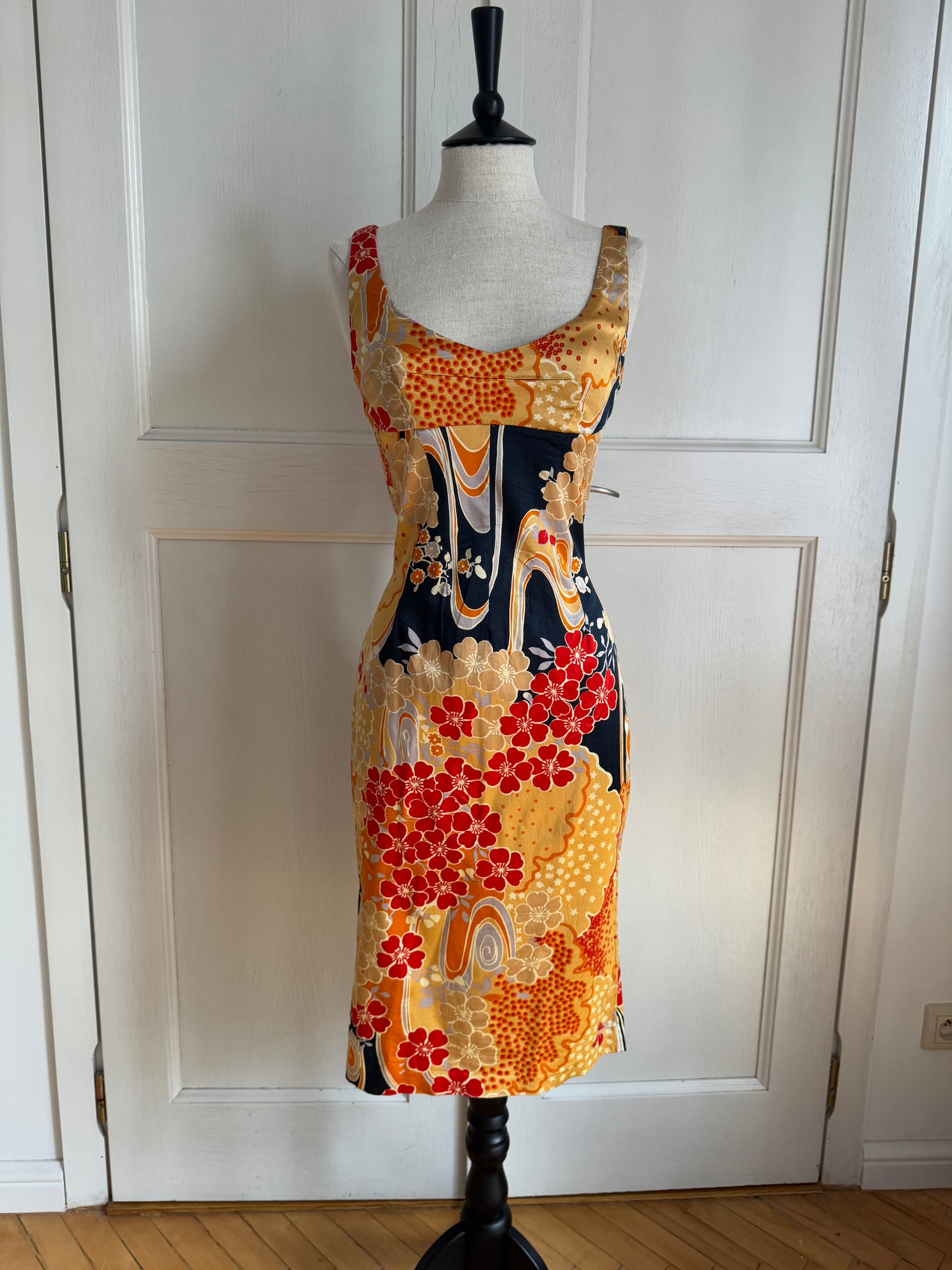 Gorgeous D&G dress circa 2000s with an oriental flower motifs and golden, satiny fabric. Shades of gold and orange look especially stunning against tanned and dark skin. Dress from the same collection was worn by Leomie Anderson.