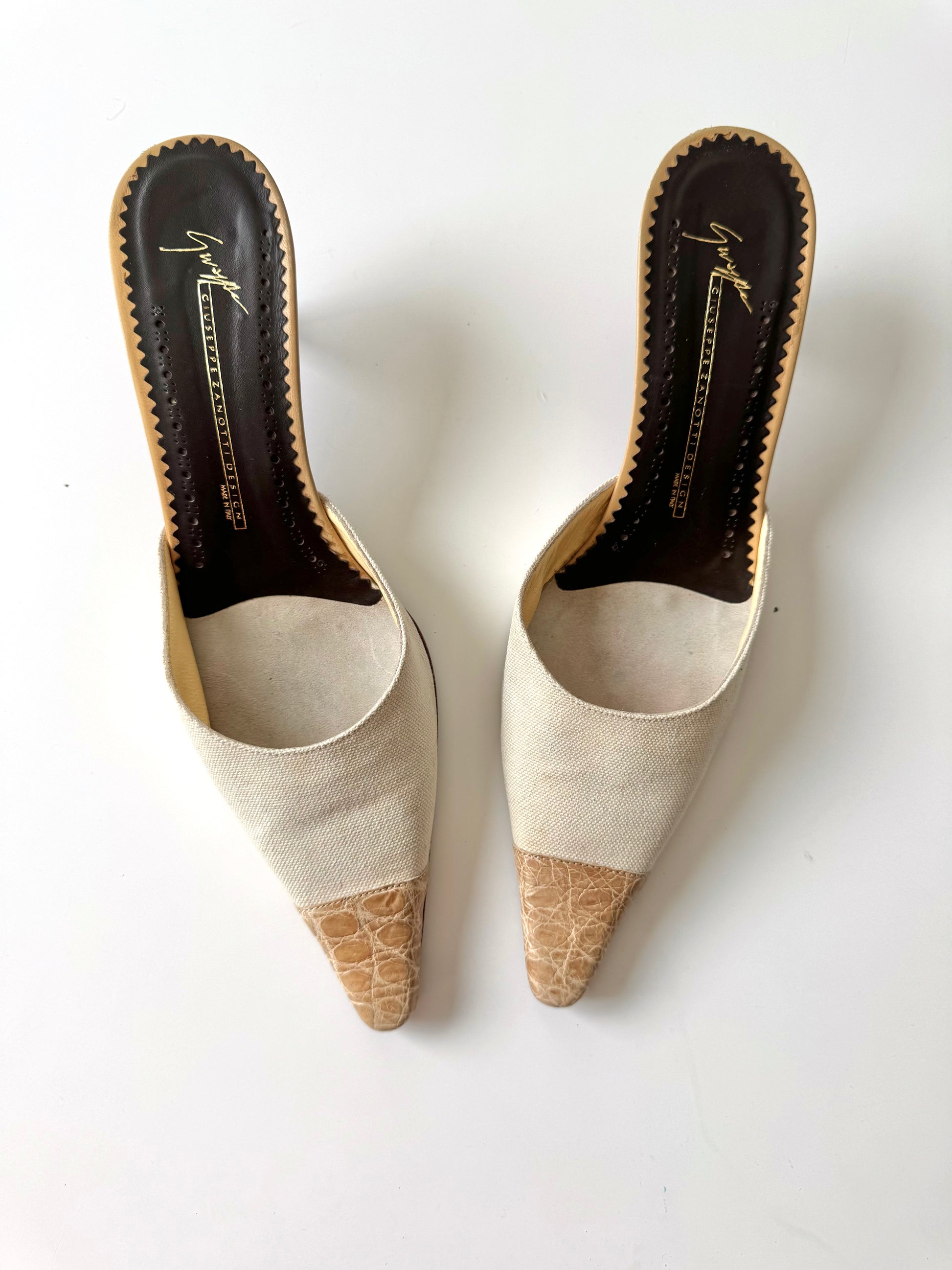 Classic Italian mules from a luxury designer Giuseppe Zanotti in ecru canvas and beige leather. Perfect for going on a summer fruit market or strolling around little Italian streets! Sold with a complimentary dust bag.