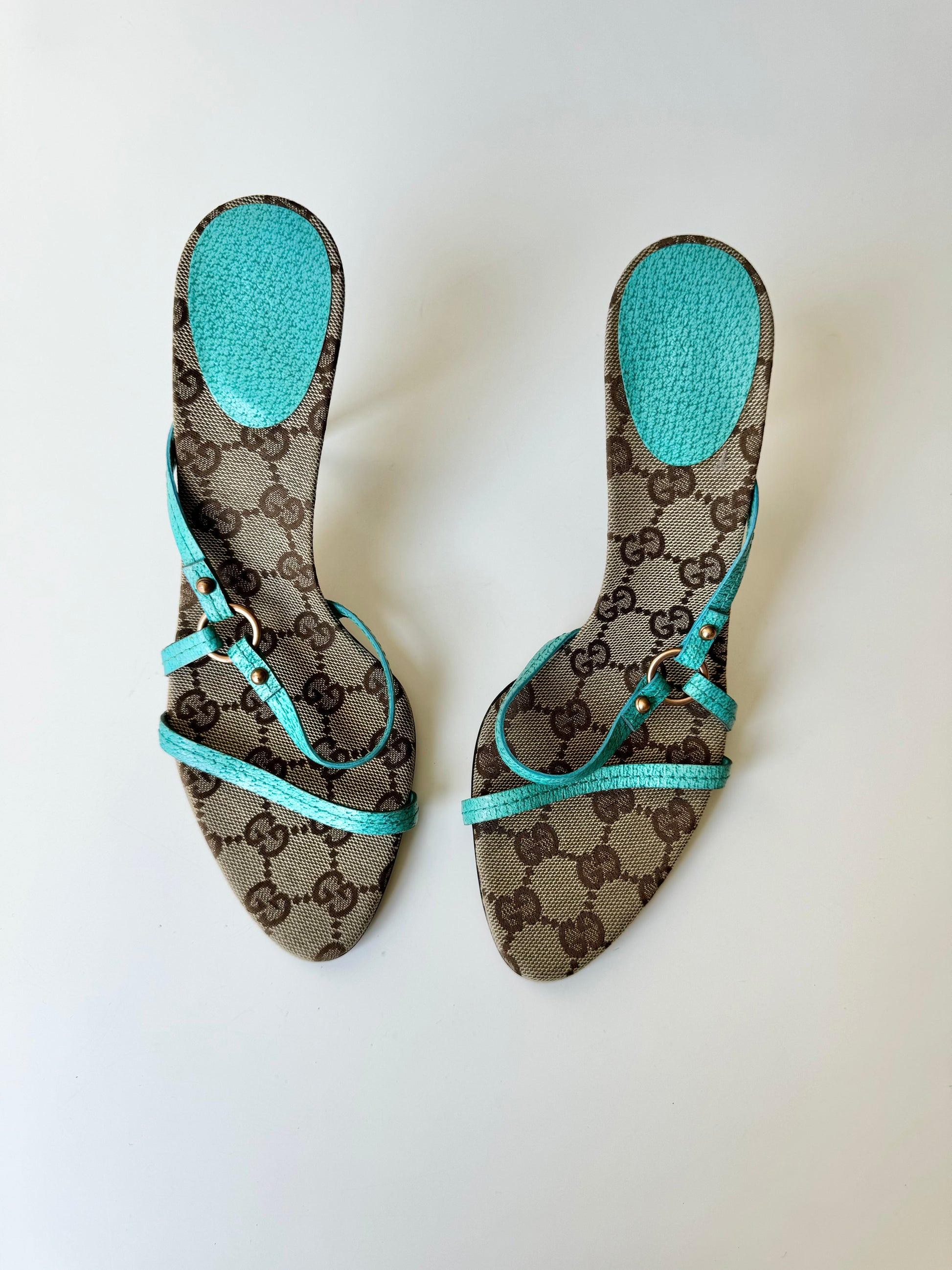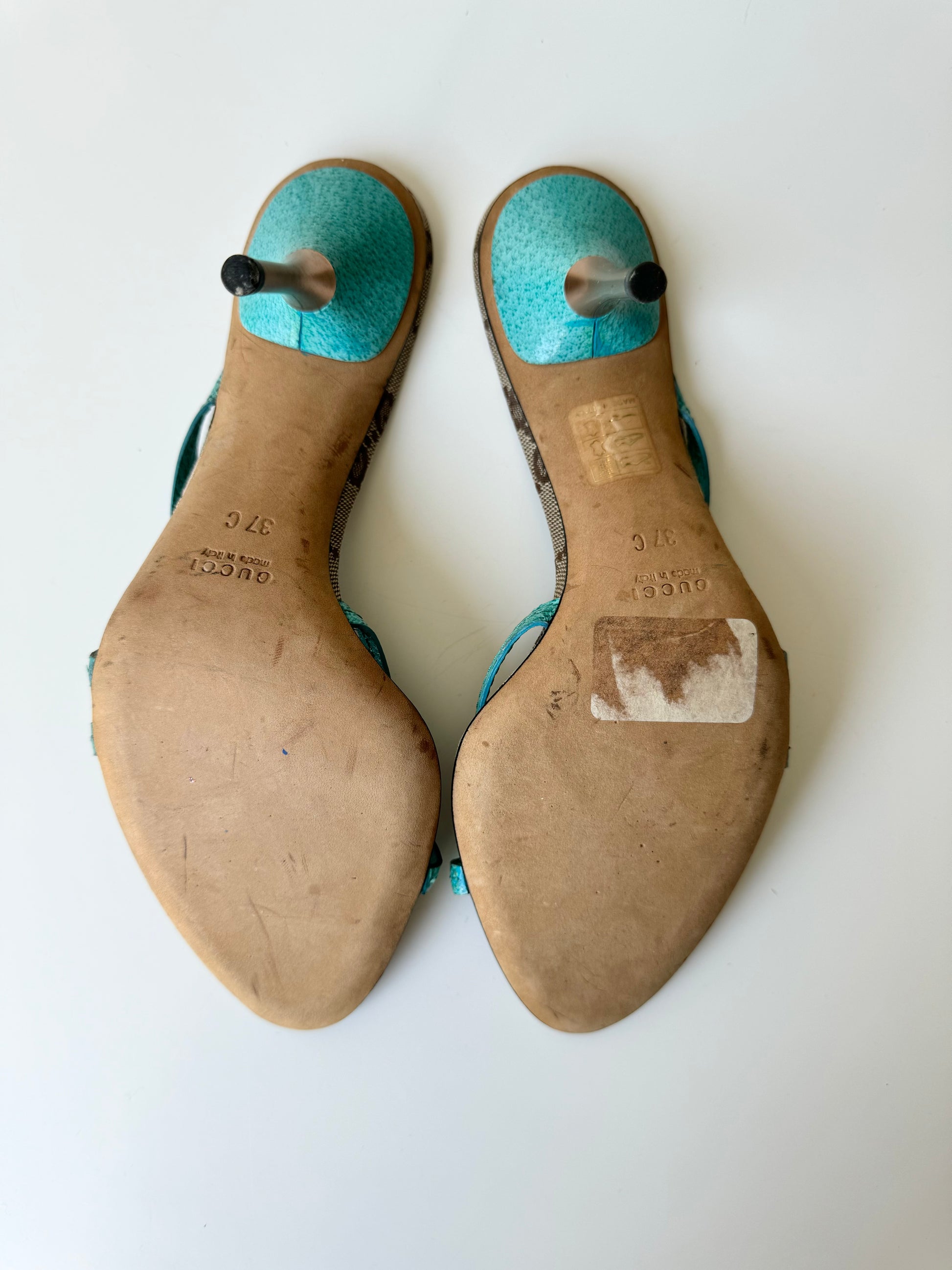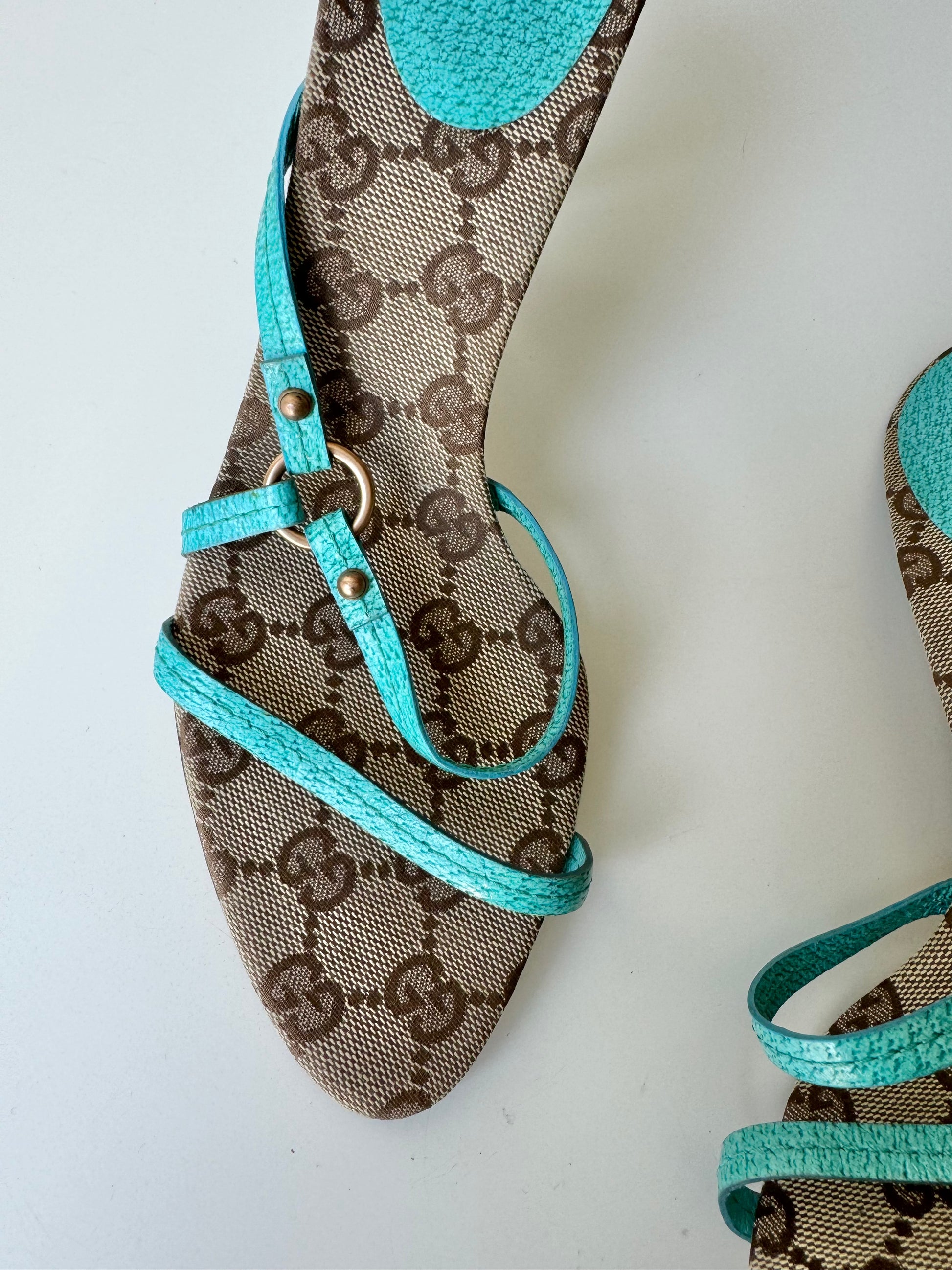 Beautiful Gucci strappy sandals by the legendary Tom Ford, circa 2000s. Made of turquoise leather straps, metal decorative elements, and Gucci monogram canvas. Very modern and sexy - the epitome of the Tom Ford for Gucci era, famously worn by Addison Rae (see photos).