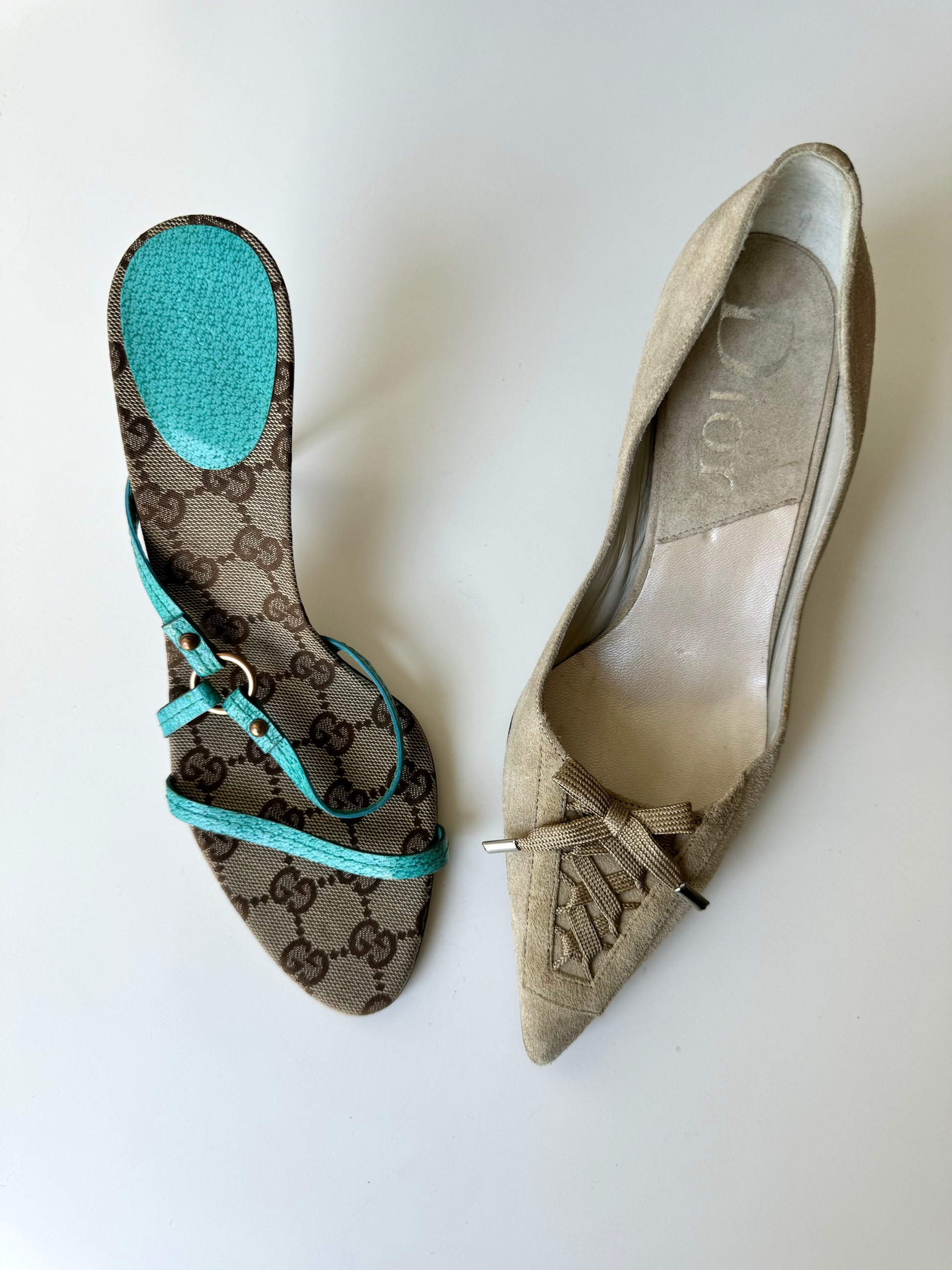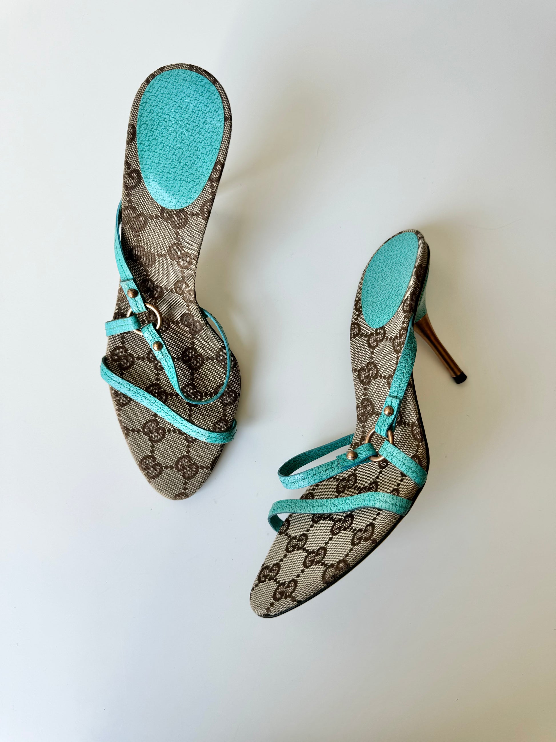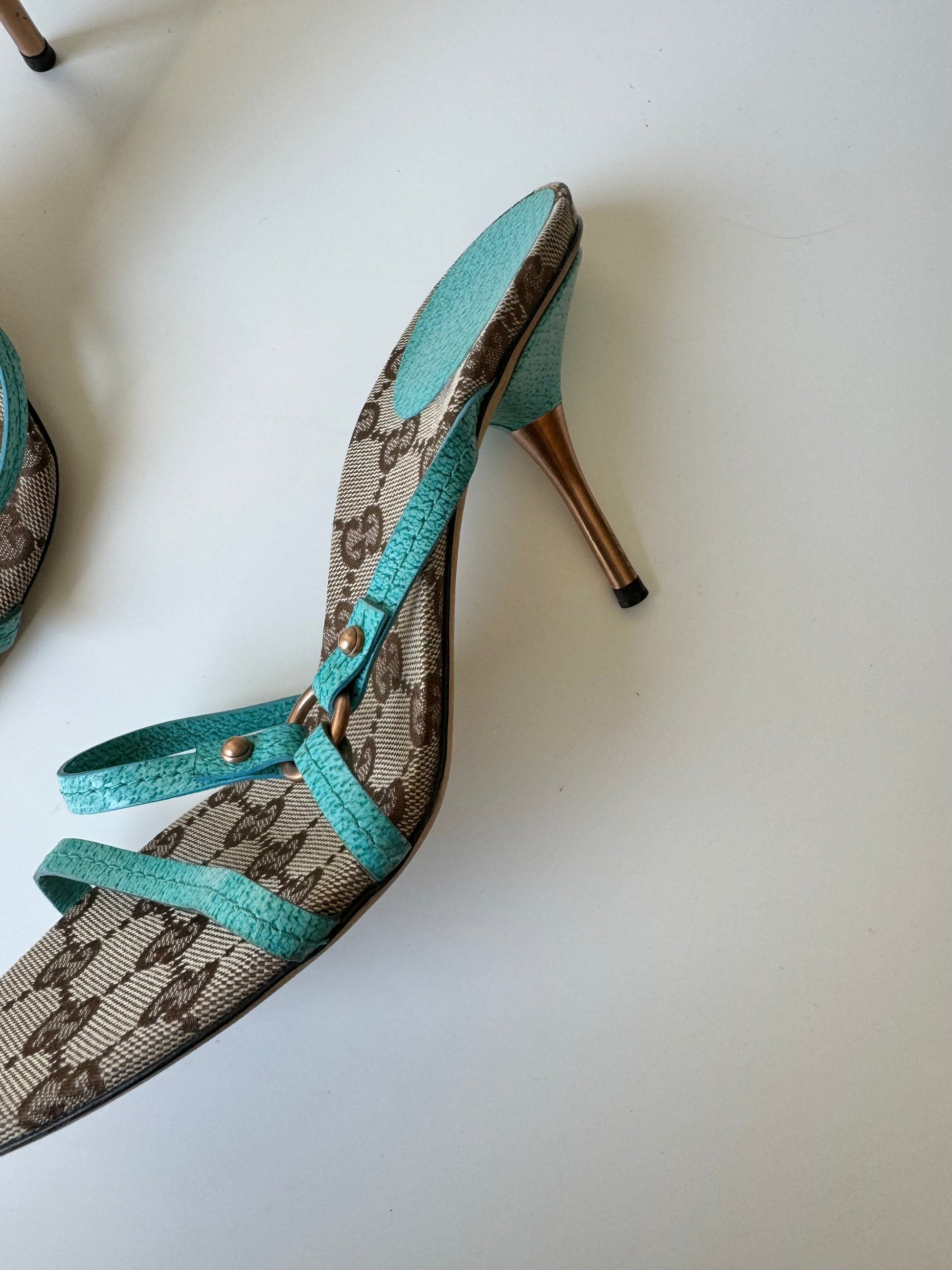 Beautiful Gucci strappy sandals by the legendary Tom Ford, circa 2000s. Made of turquoise leather straps, metal decorative elements, and Gucci monogram canvas. Very modern and sexy - the epitome of the Tom Ford for Gucci era, famously worn by Addison Rae (see photos).