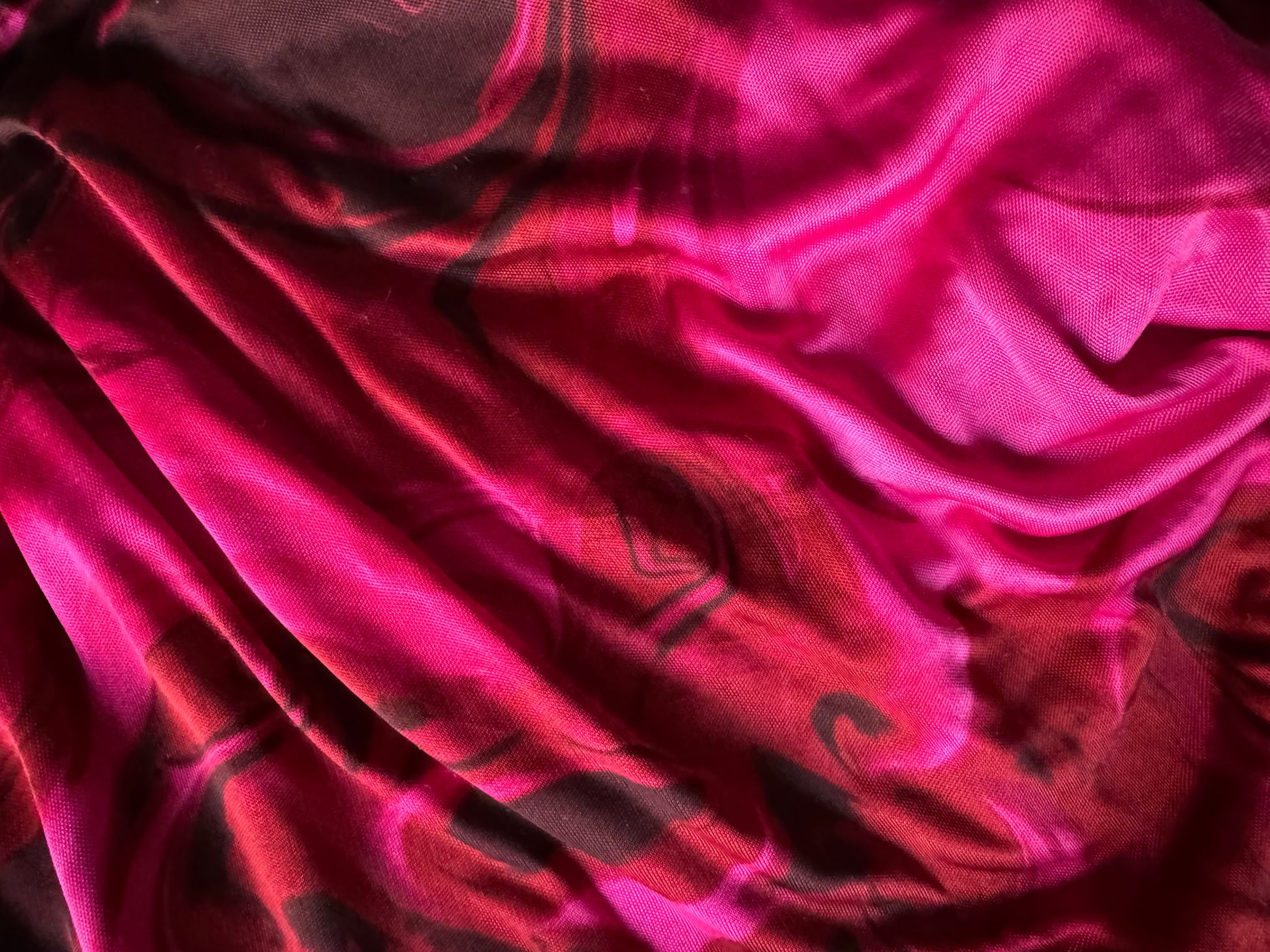 Iconic Gucci by Tom Ford skirt with a lava pattern in vibrant fuchsia. Top in the same pattern and color way was worn by Samatha Jones in Sex and The City series. Sultry cut with a high leg slit and a decorative ruching make it a very feminine piece. Looks absolutely stunning when paired with a black shirt - meant to be treasured forever. Â