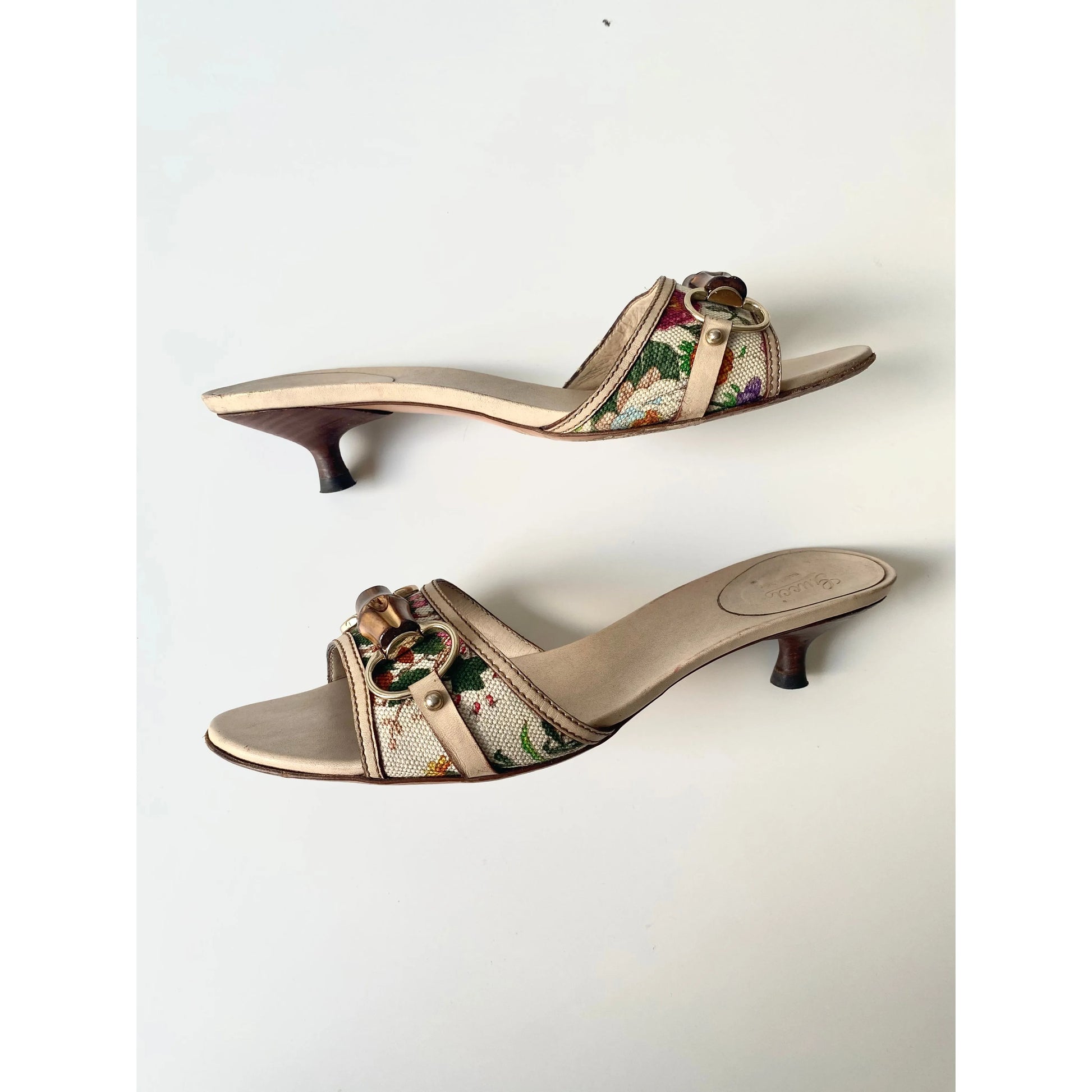 Stunning vintage Gucci mules with iconic wooden horsebit and floral canvas. An absolute staple in your spring-summer wardrobe! Professionally cleaned before shipping.