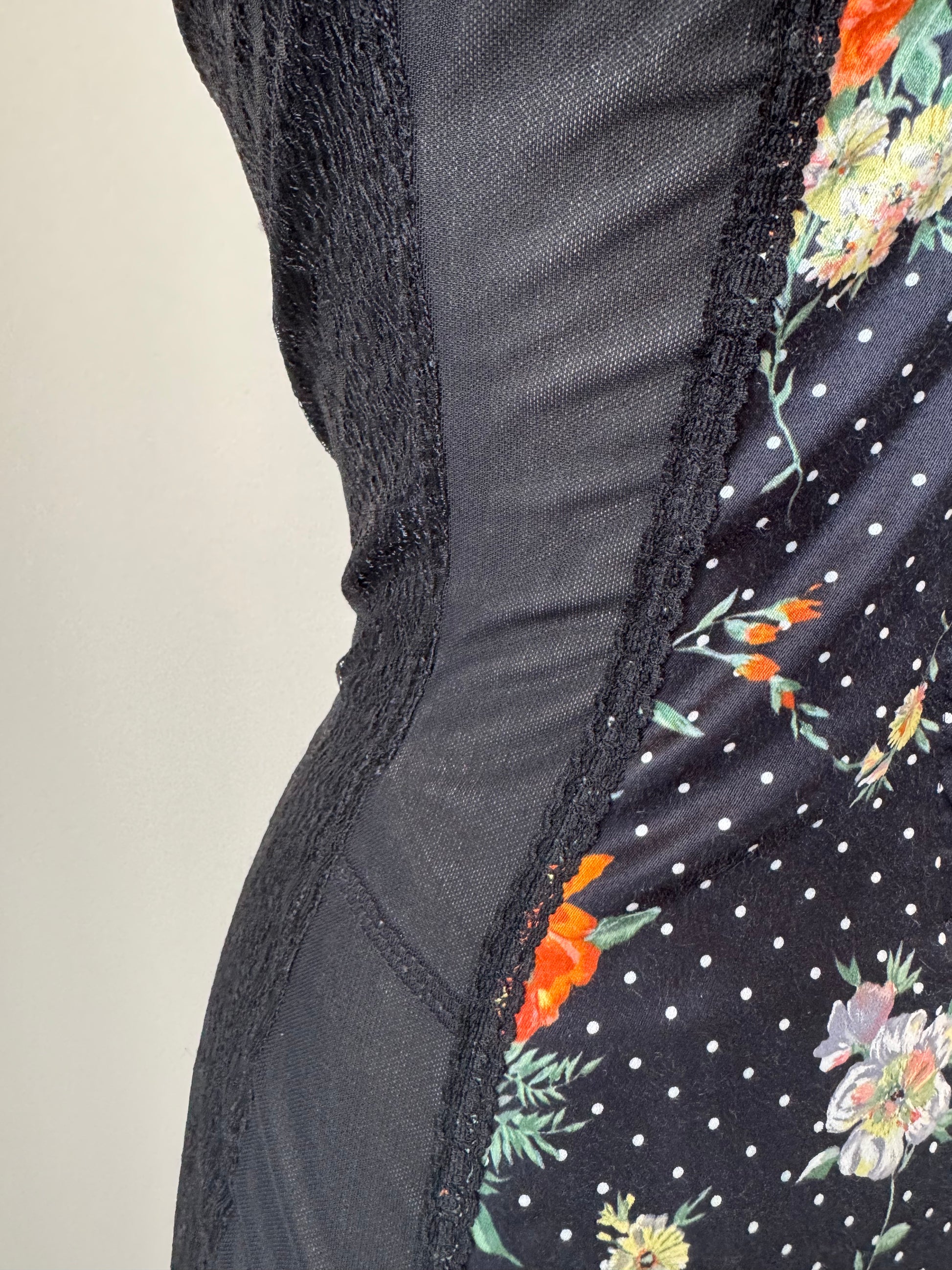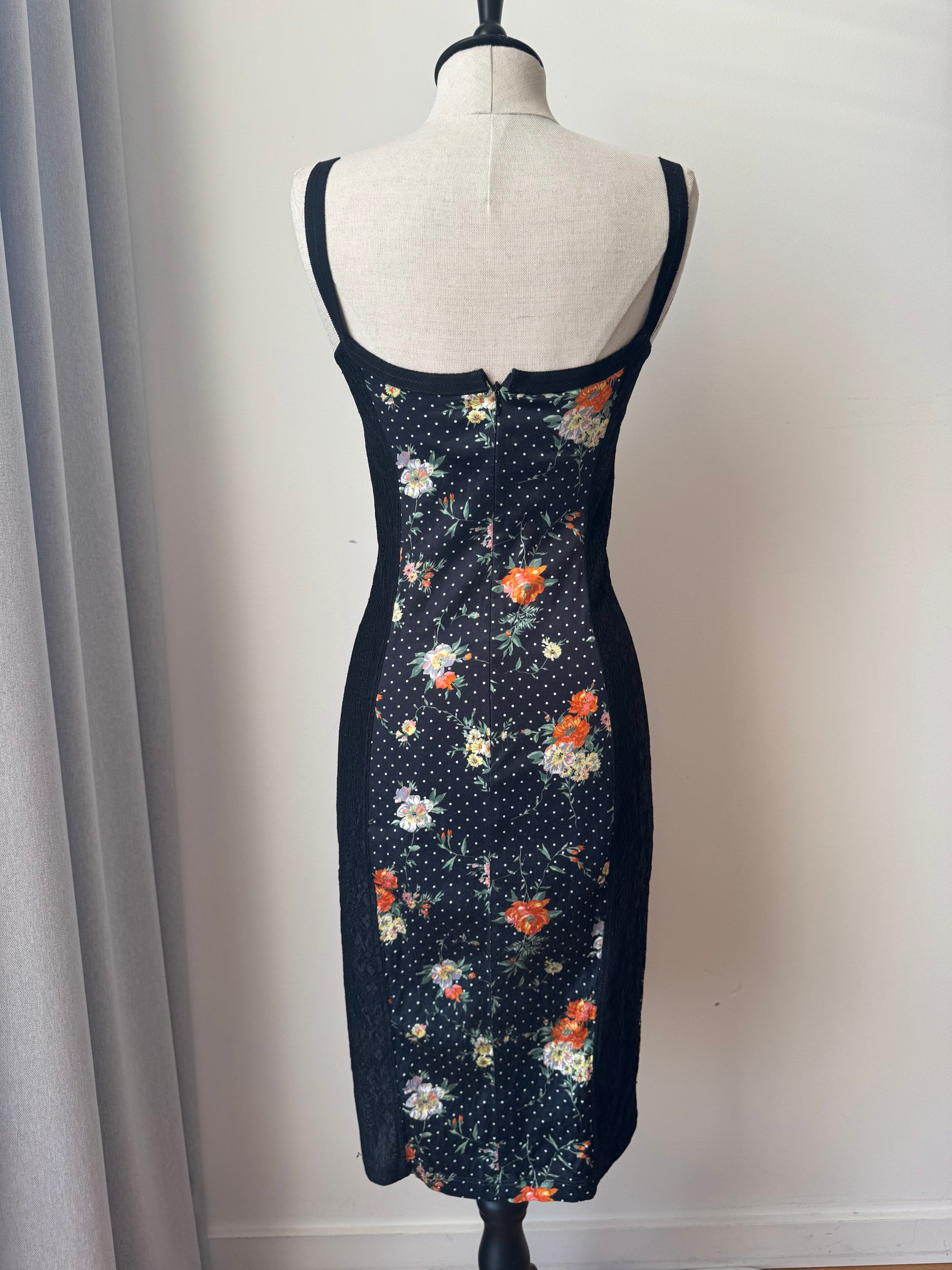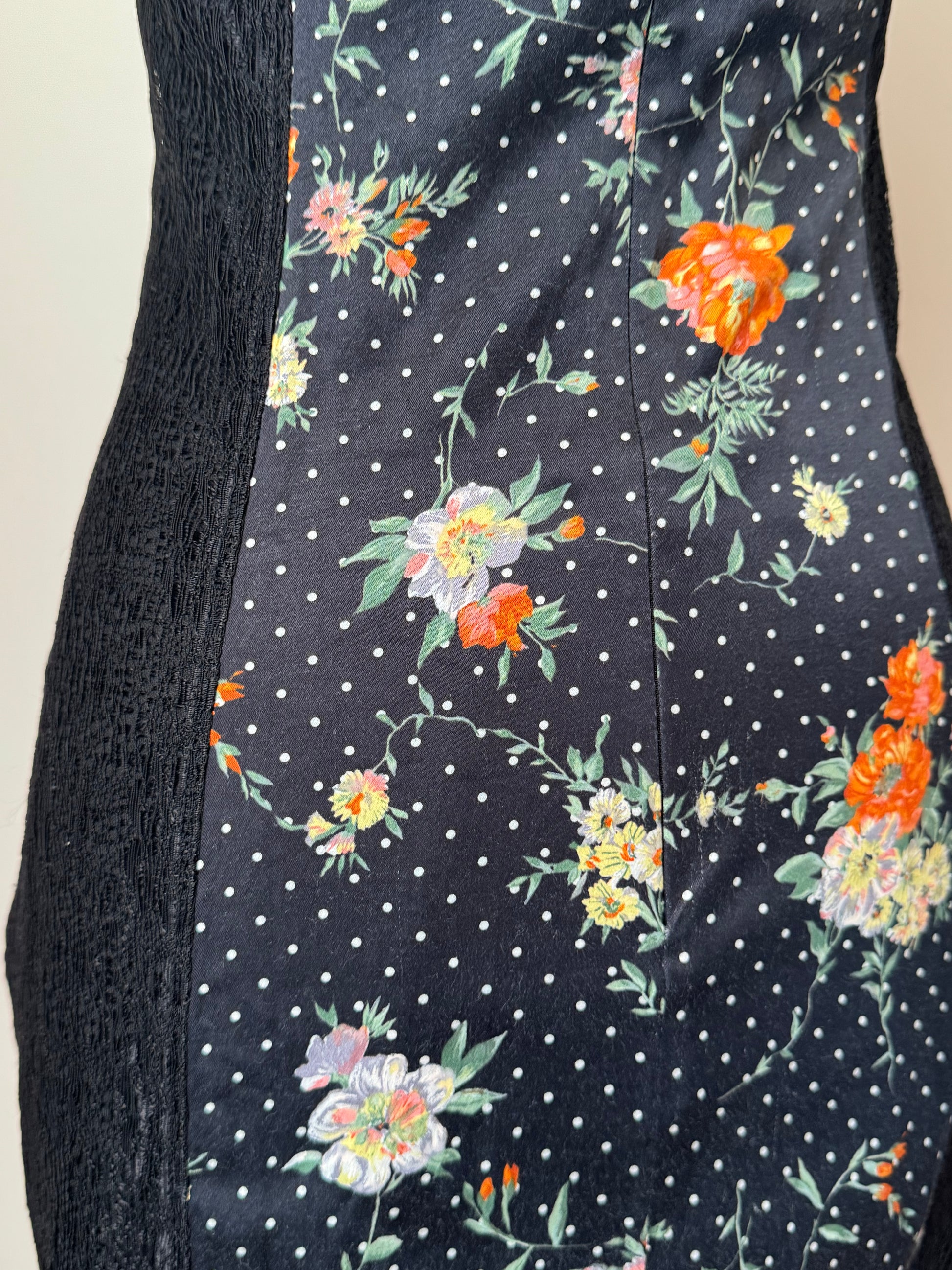Absolutely stunning bodycon dress, worn by Megan Fox and Laura Harrier, and designed circa early 2000s. Satiny floral fabric and mesh and lace inserts make it extremely flattering on the body and evoke Italian femme-fatales like Sophia Loren or Monica Bellucci. Very Dolce Vita - meant to be treasured forever!