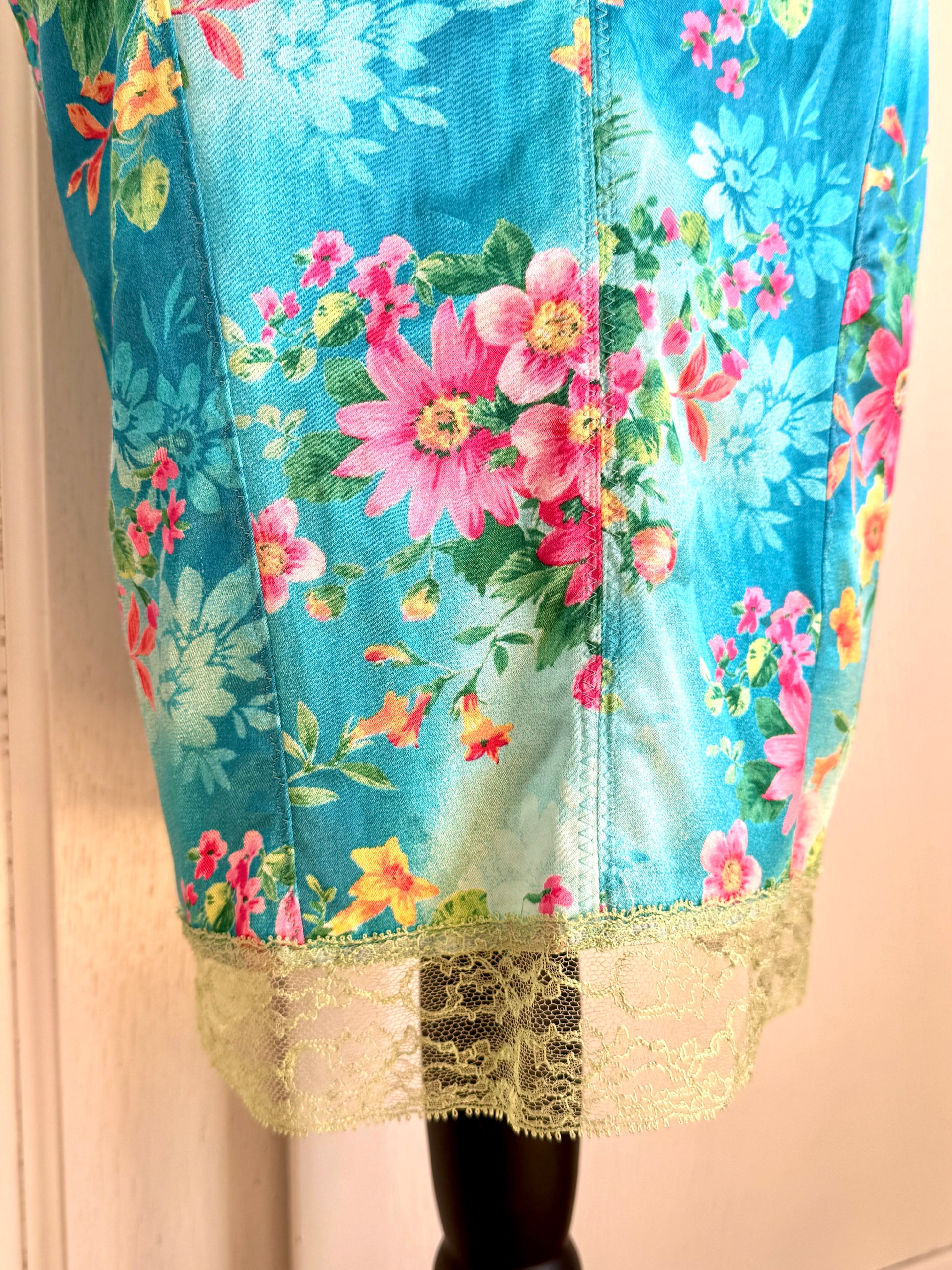 Absolutely stunning D&G dress from the 2005 Spring / Summer collection in a tropical, vibrant colors that look gorgeous against sun-kissed skin. Adorned with a green lace panels and a satin rose at the décolletage it's a true one of its kind statement piece that contours the body into a perfect hourglass shape - stunning for both beach parties and summer dates. Meant to be treasured forever.
