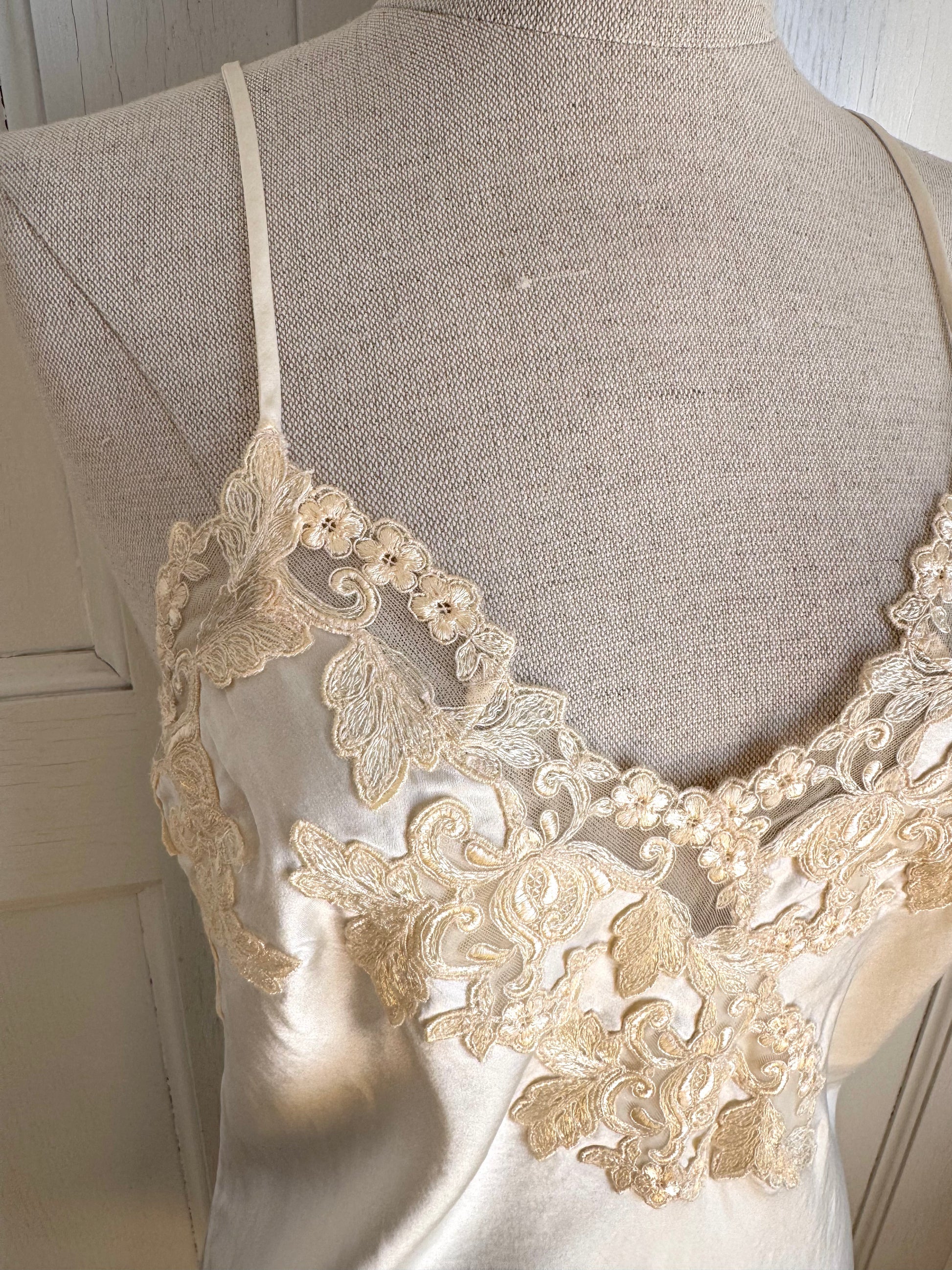 The iconic vintage slip by the famous Italian brand La Perla, crafted from a silk blend. Smooth satin fabric, silky to the touch, finished with ecru lace along the décolletage and at the bottom. The epitome of Italian craftsmanship: stunning floral details and a fluid fabric that drapes beautifully and hugs the body in all the right places. Perfect as a getting-ready slip for a Bride or for sipping your morning coffee with an Amalfi Coast view. Gorgeus against sun-kissed skin. A timeless piece meant to be treasured forever.