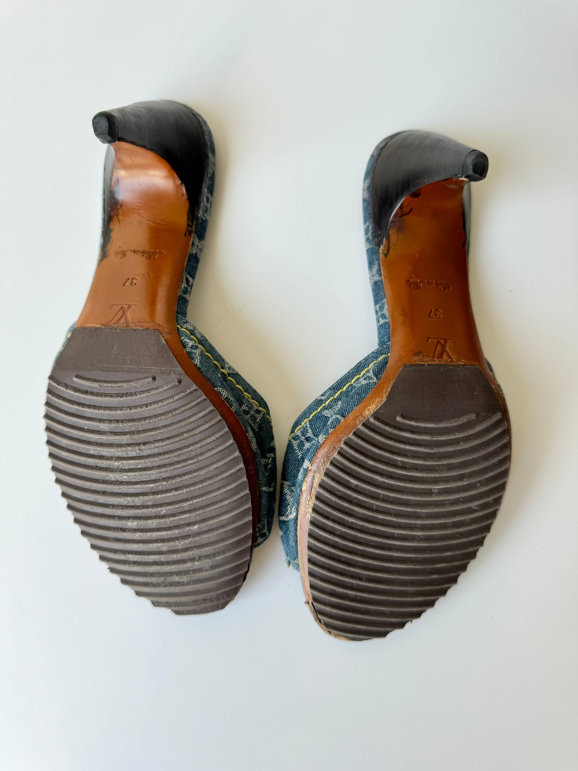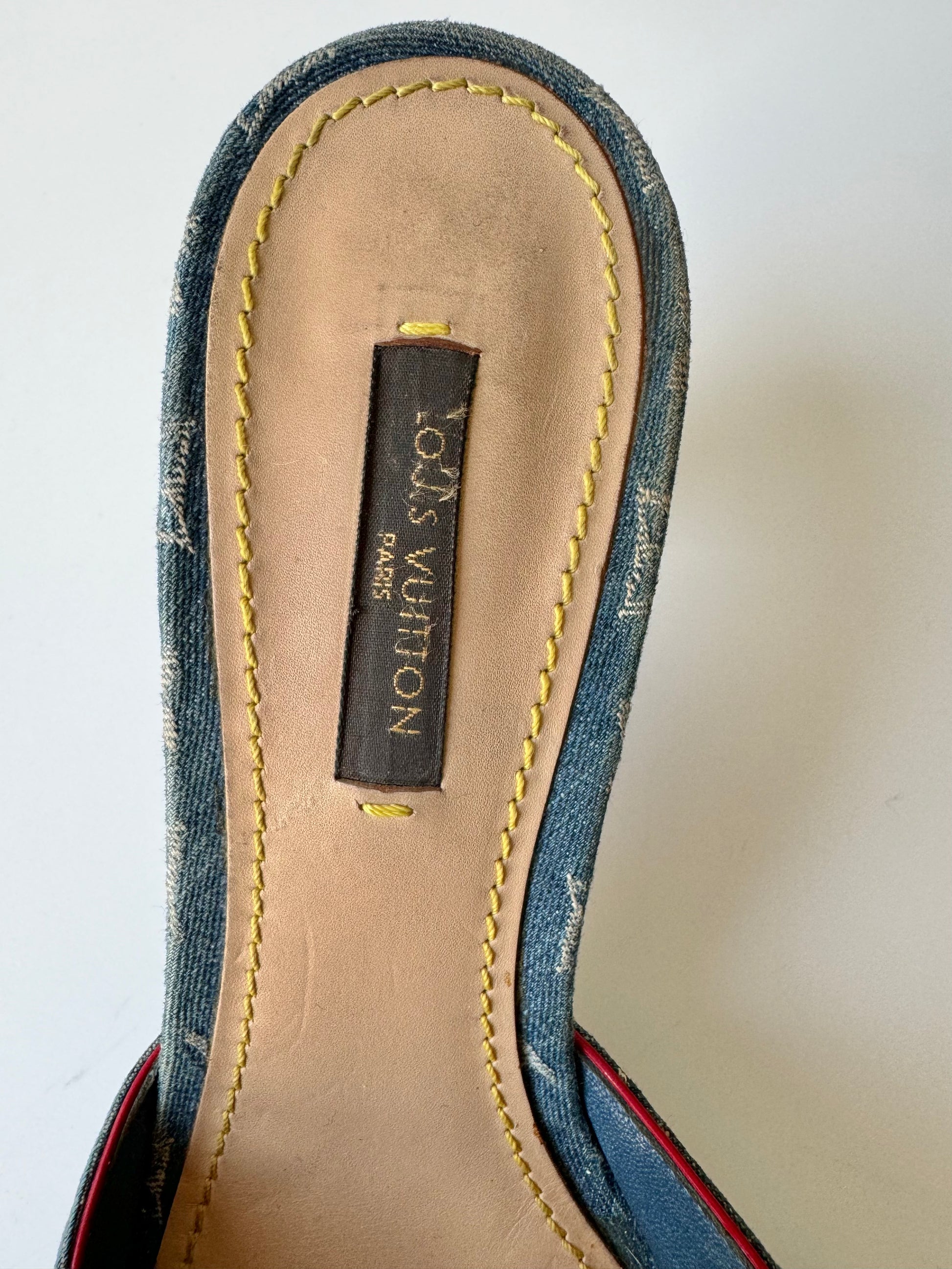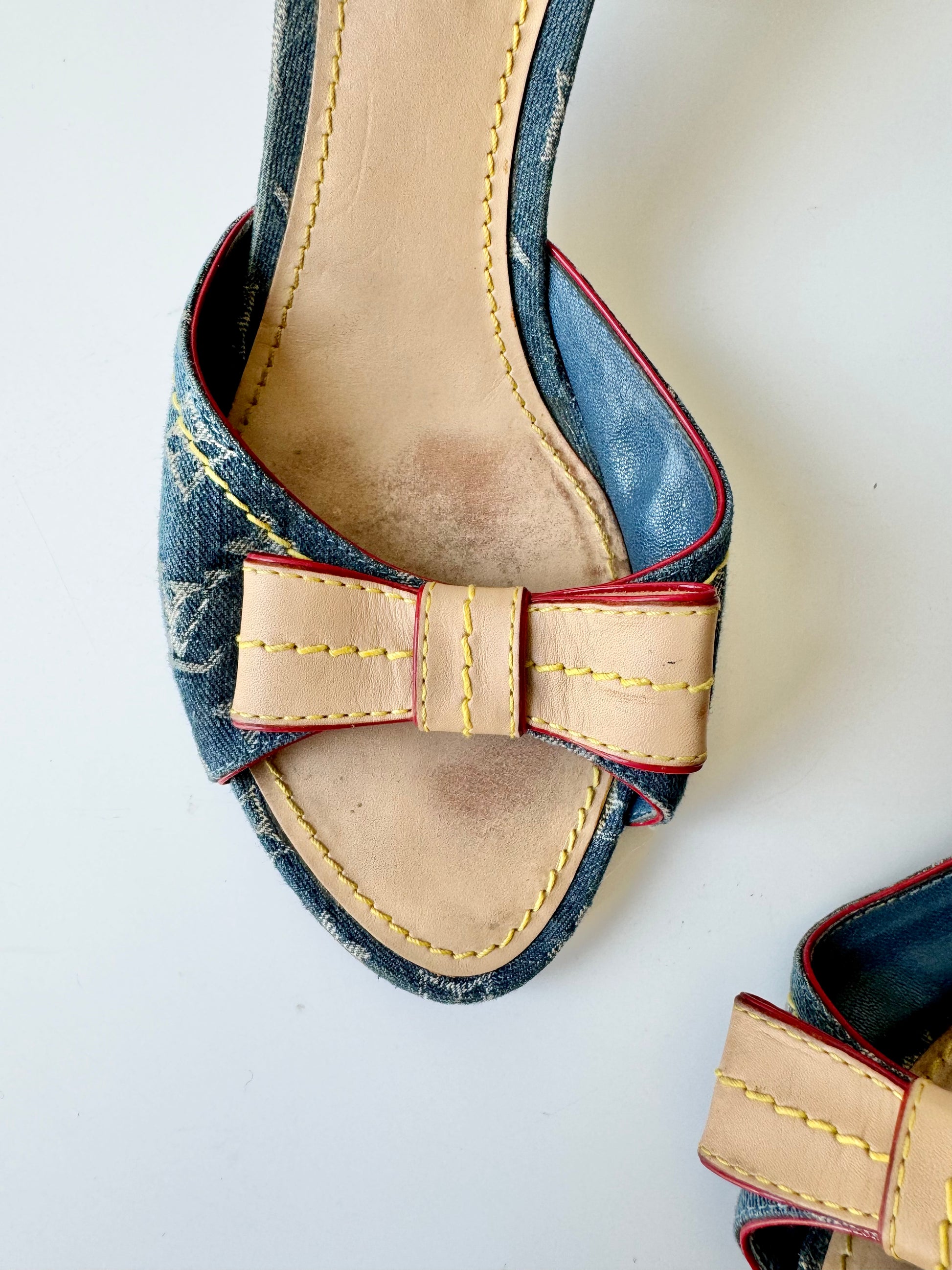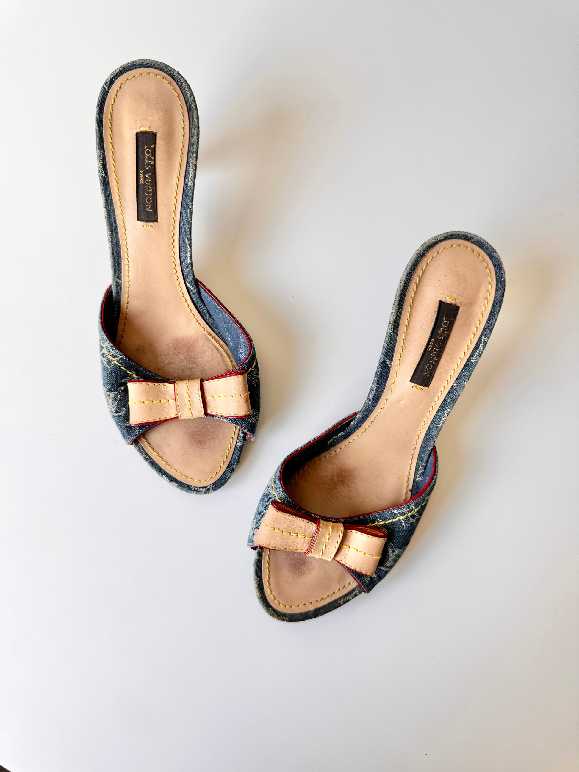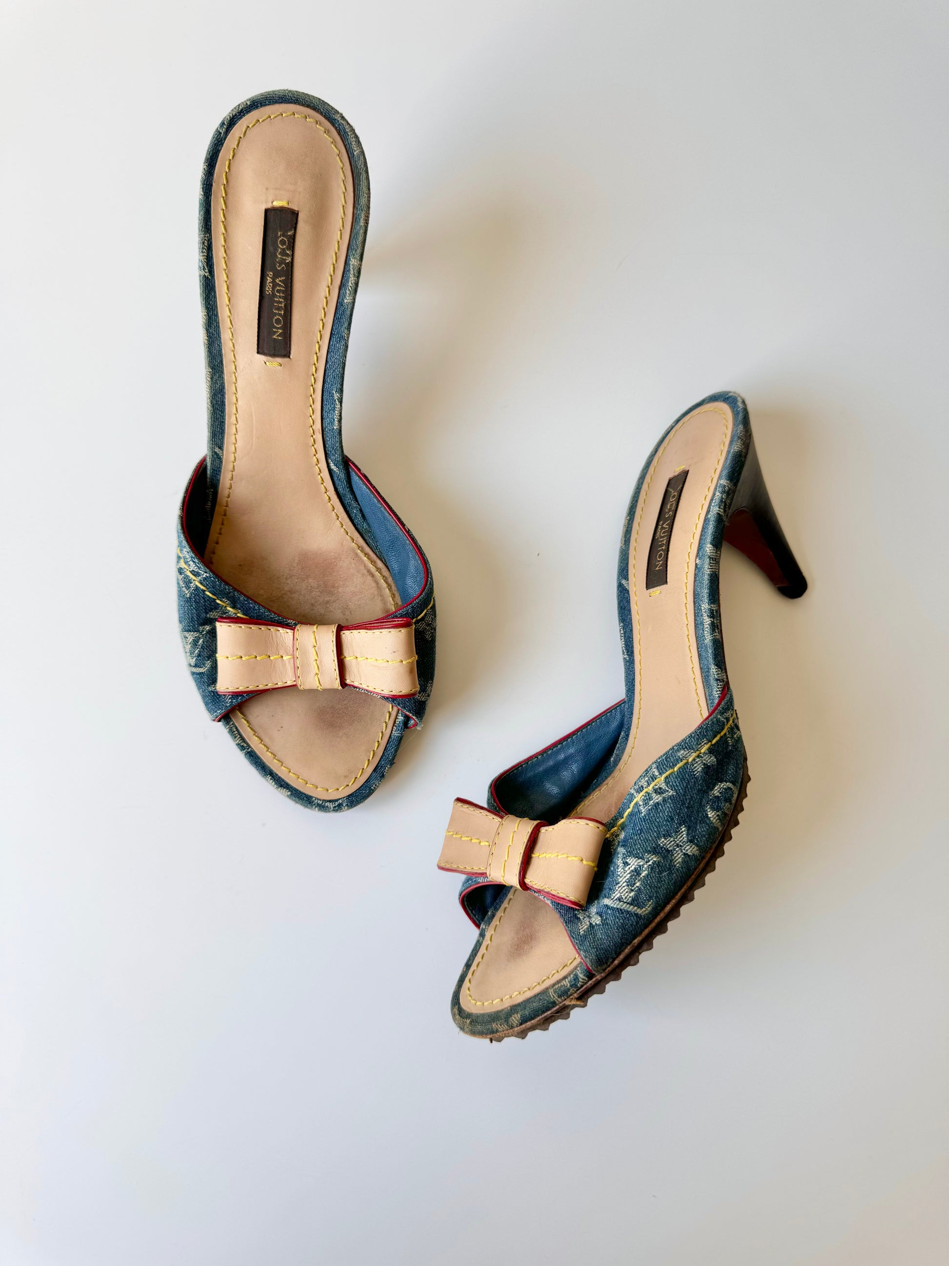 Stunning LV mules with a denim monogram, leather bow, and a signature mustard stitching. Introduced circa 2000s, these heels are one of the most recognizable Louis Vuitton styles of the 2000s and an epitome of y2k style. Meant to be treasured forever!