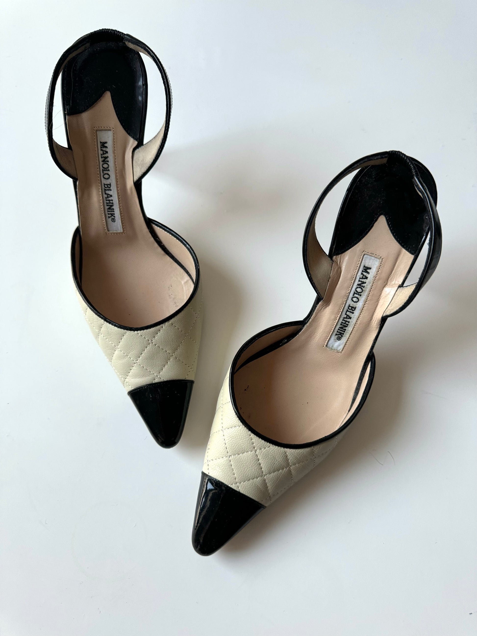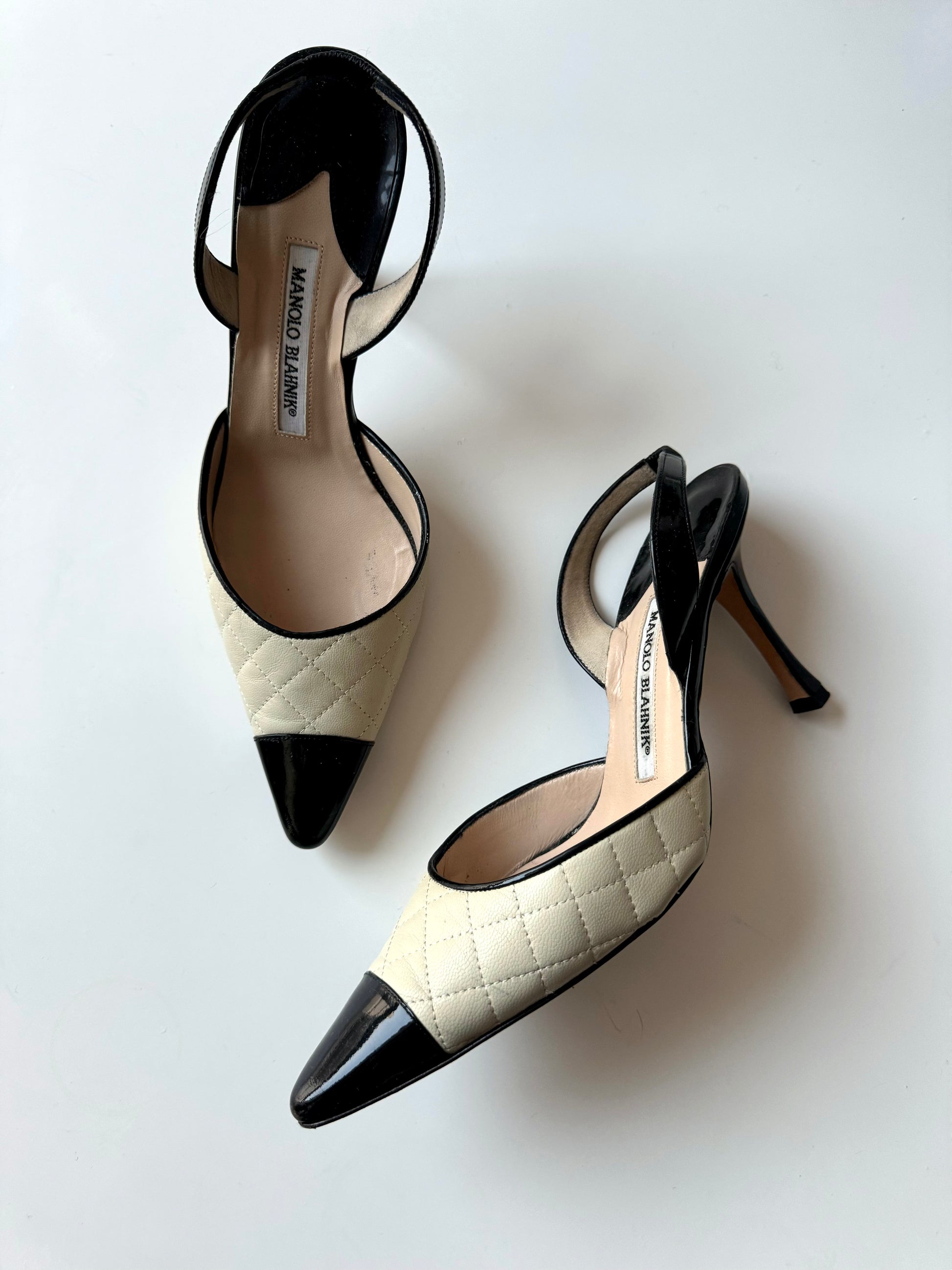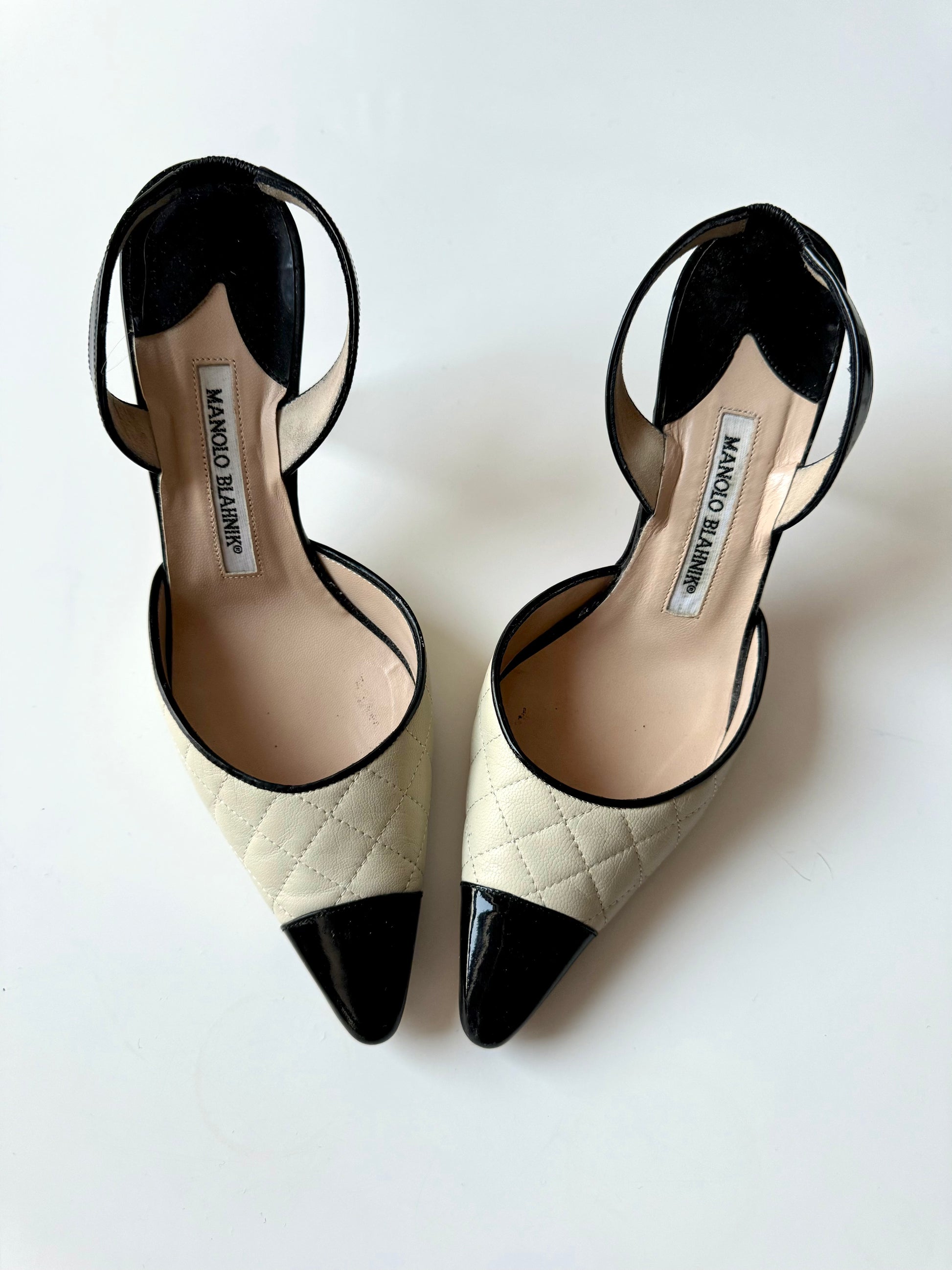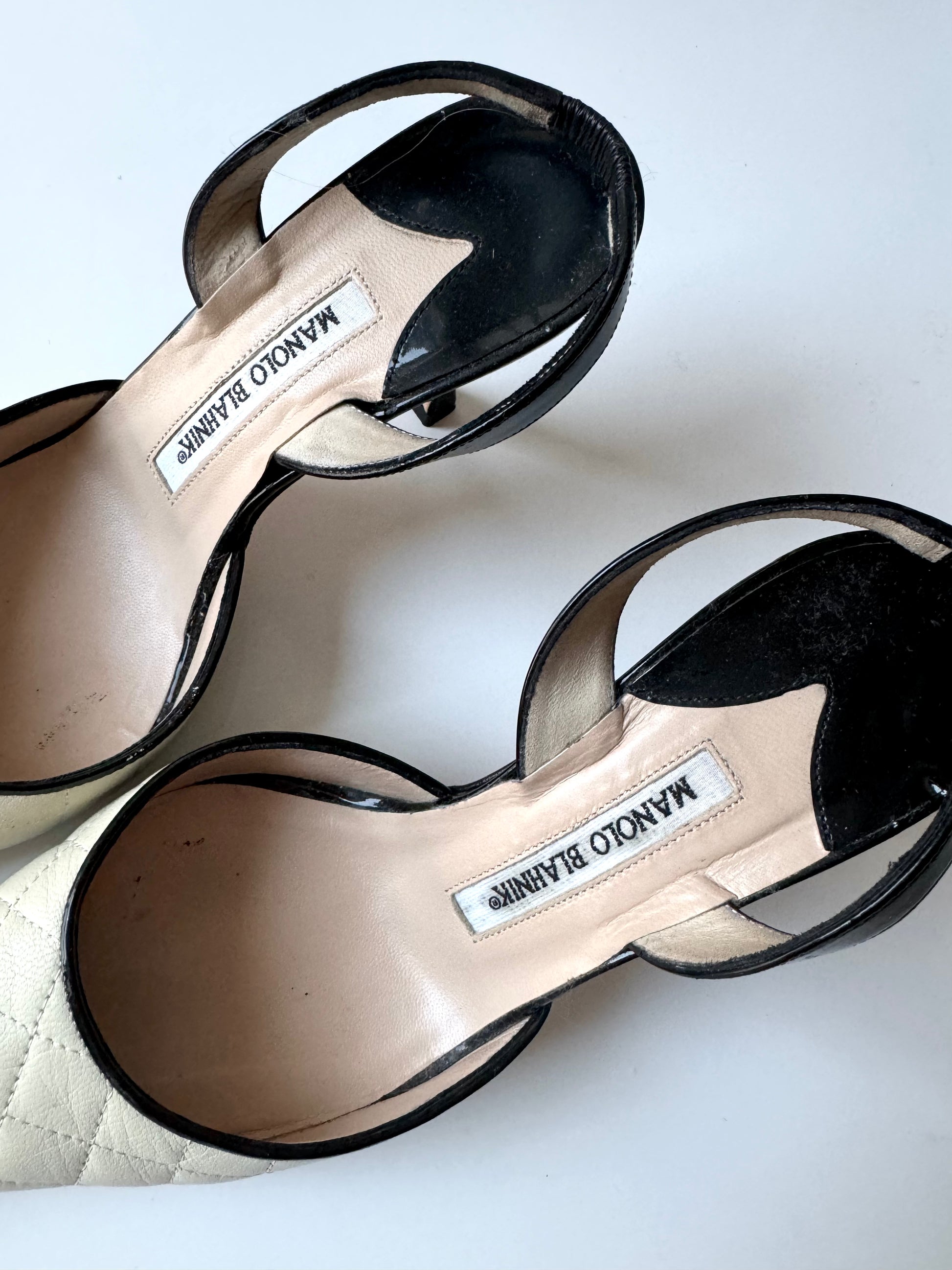 Stunning bicolor slingbacks by Manolo Blahnik. Absolutely gorgeous heels decorated with quilted cream leather and black patent tip. A classic style with a twist - something to be cherished forever!