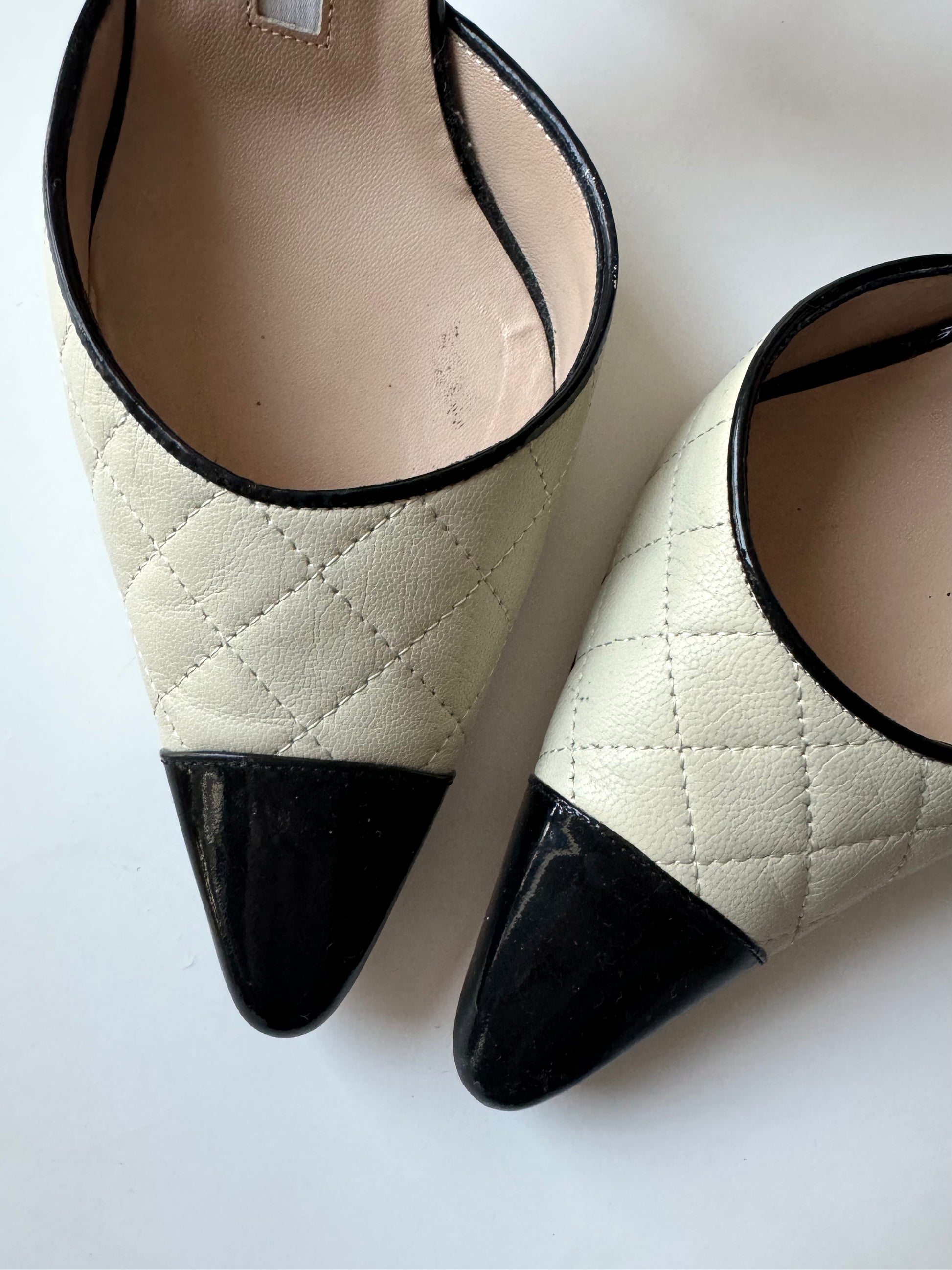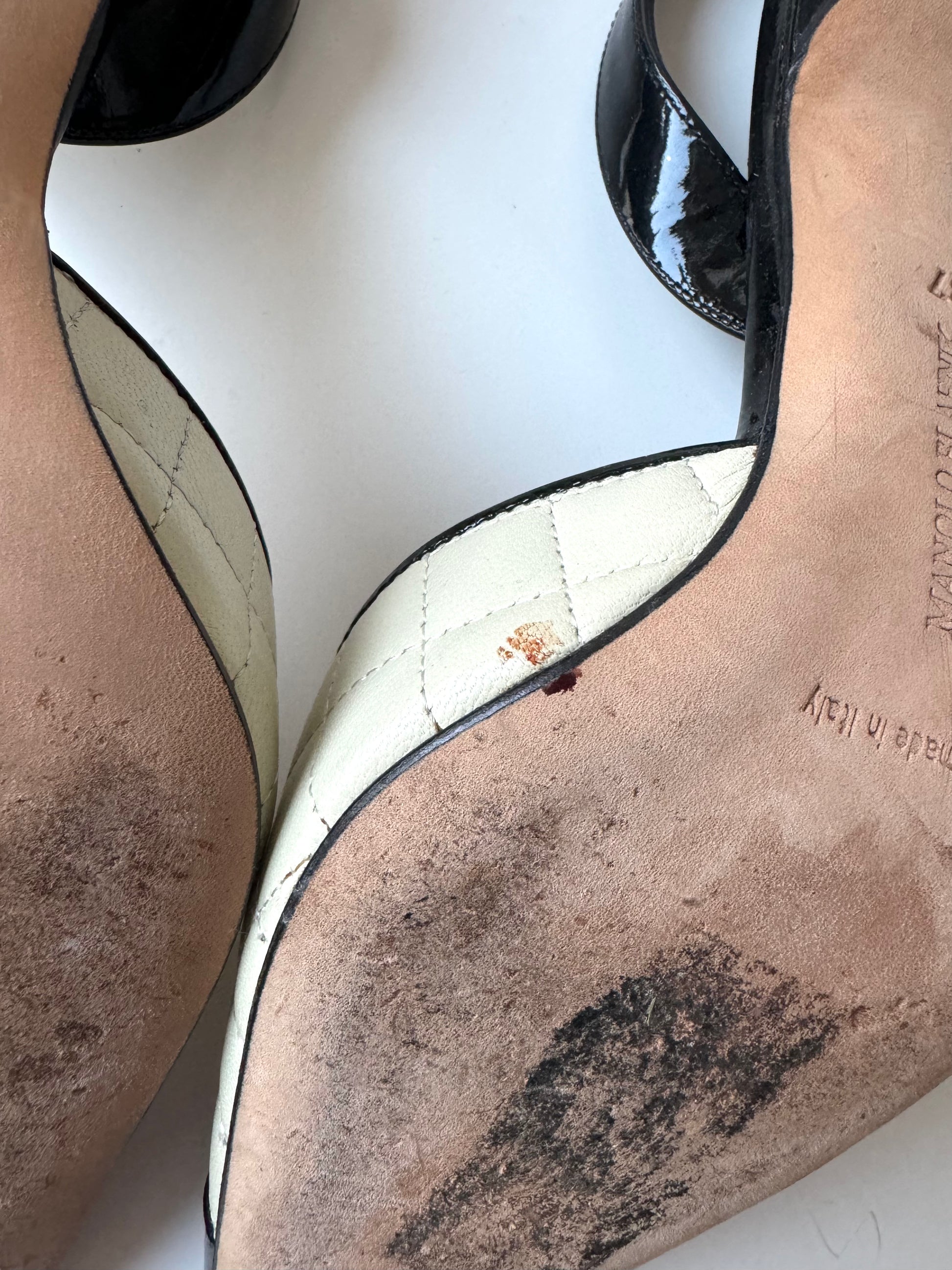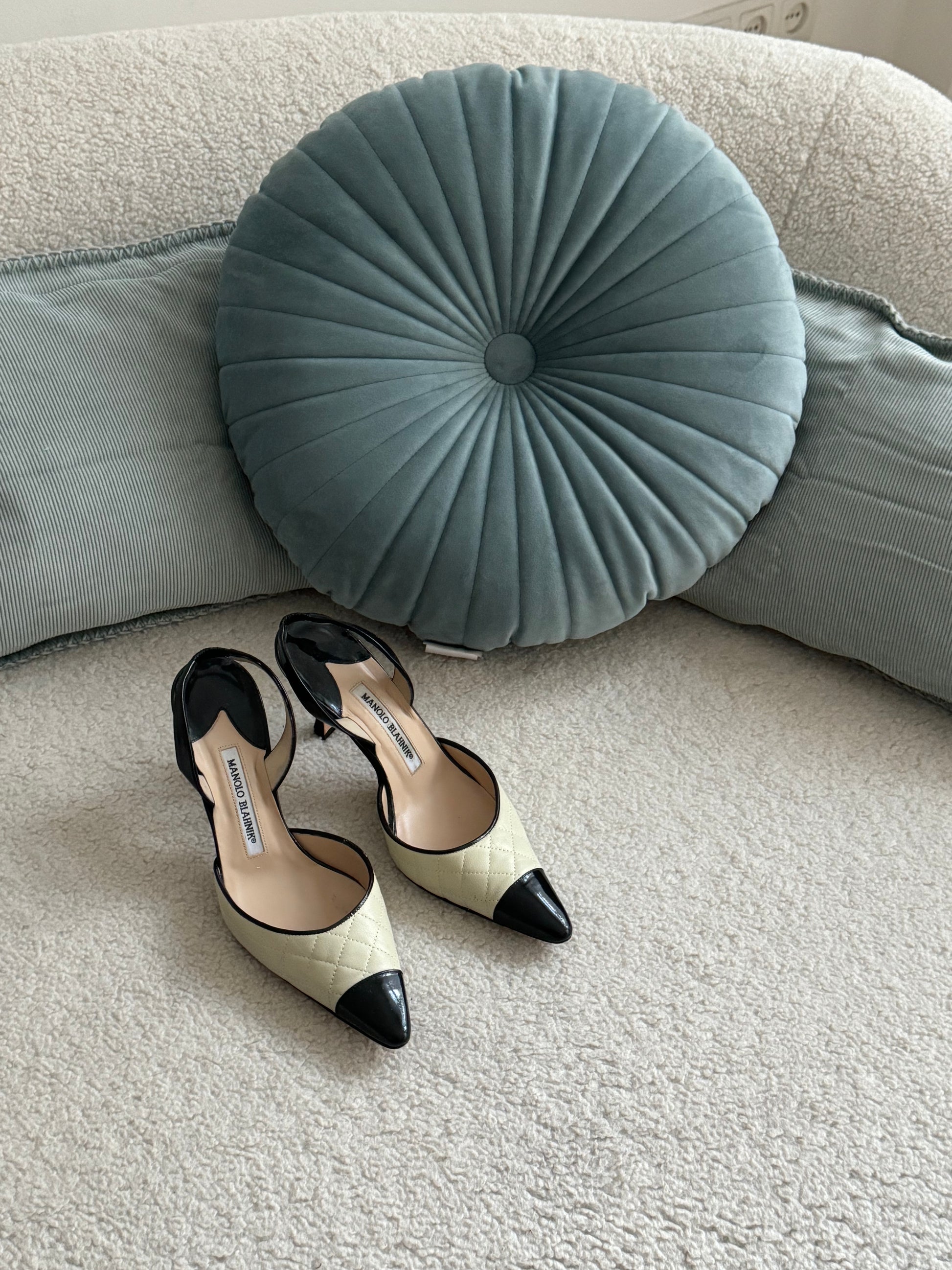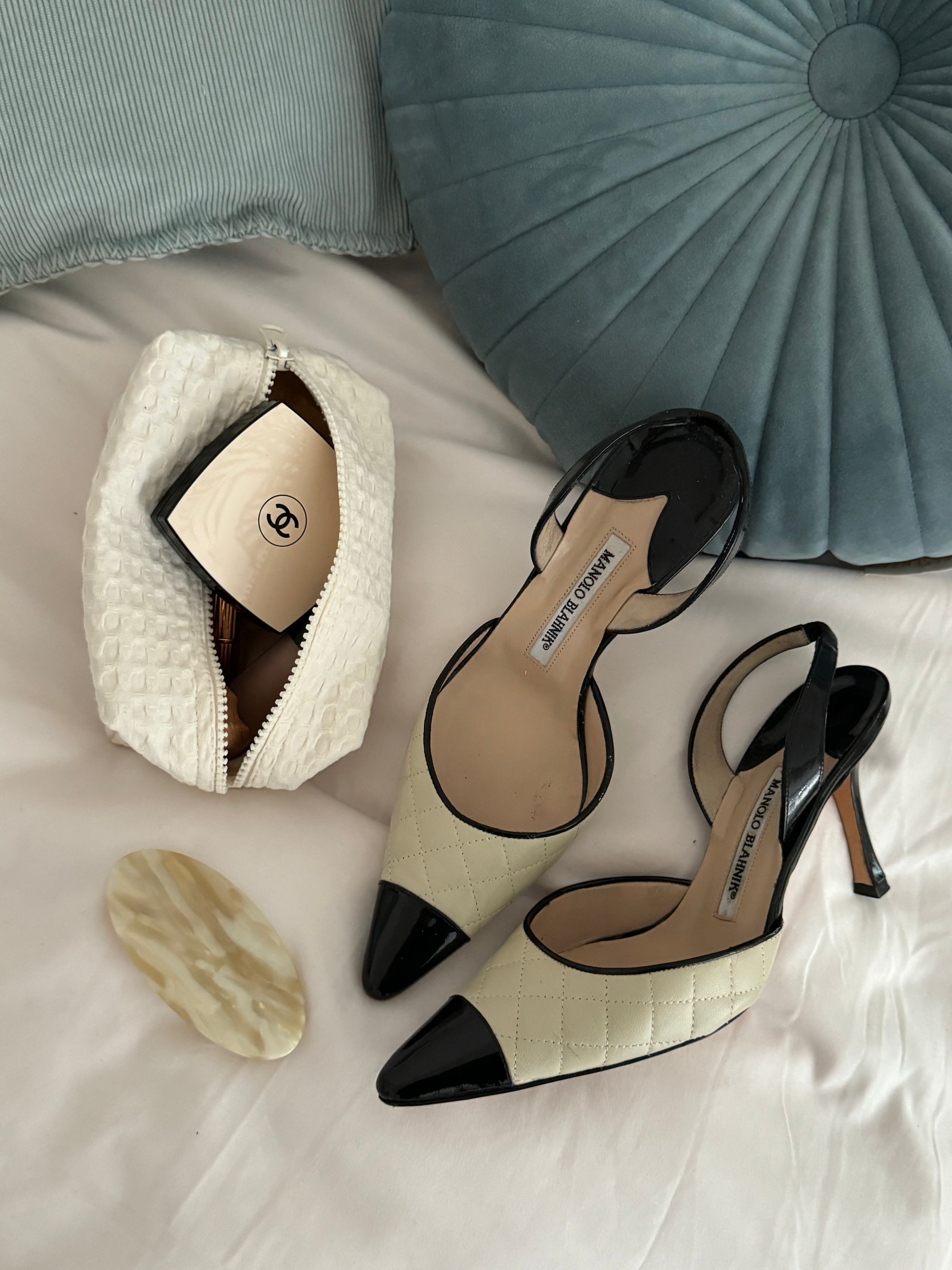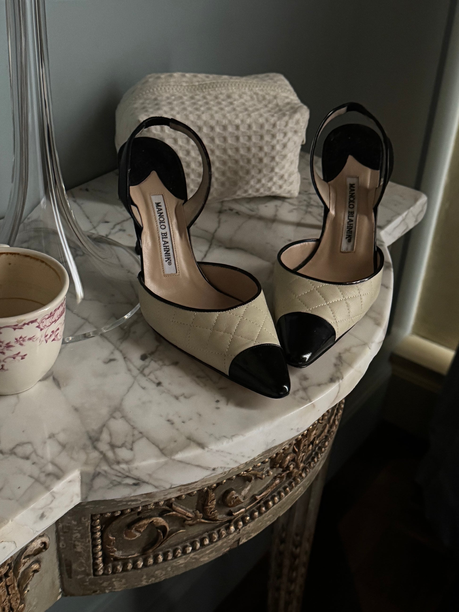 Stunning bicolor slingbacks by Manolo Blahnik. Absolutely gorgeous heels decorated with quilted cream leather and black patent tip. A classic style with a twist - something to be cherished forever!