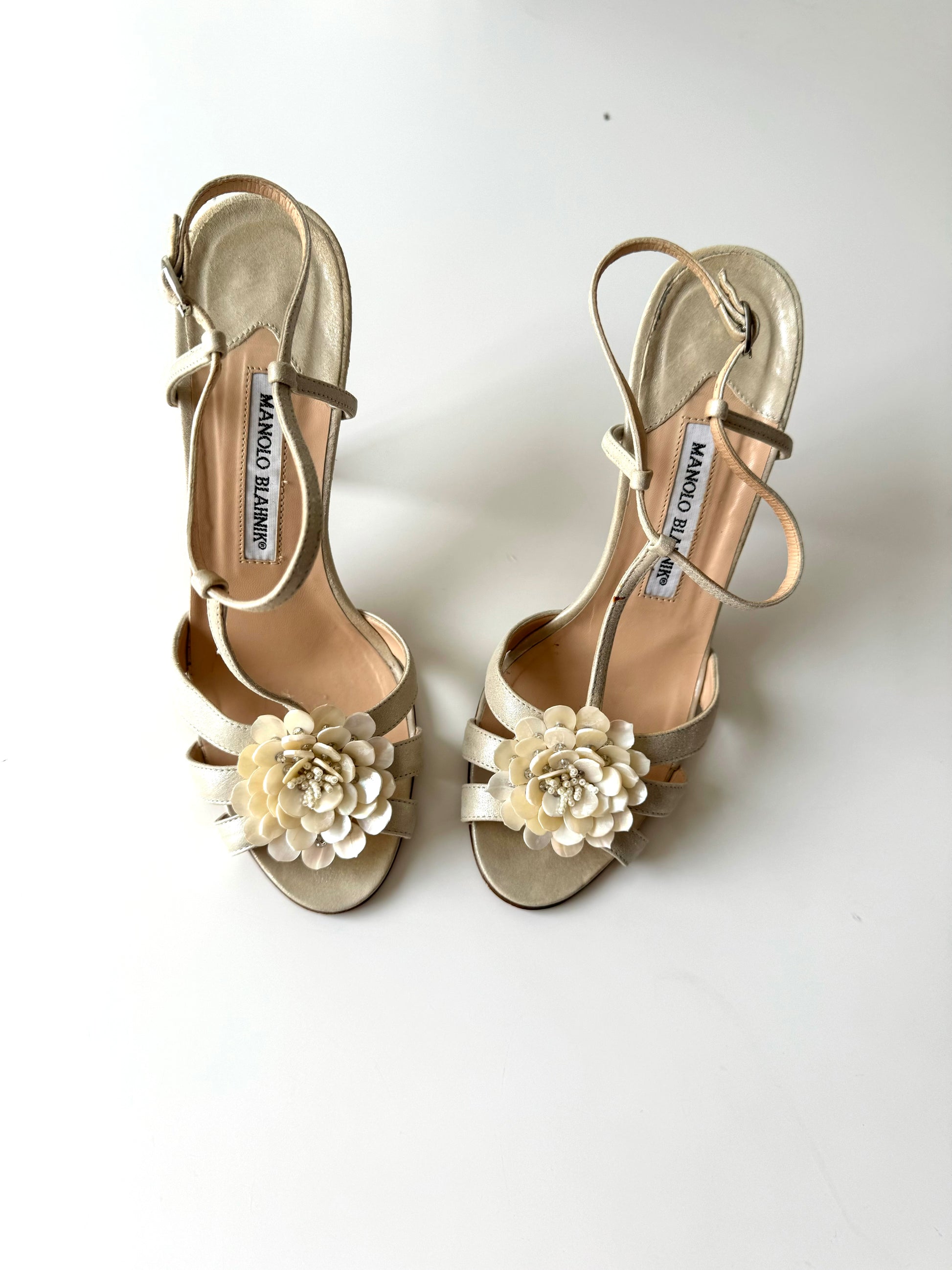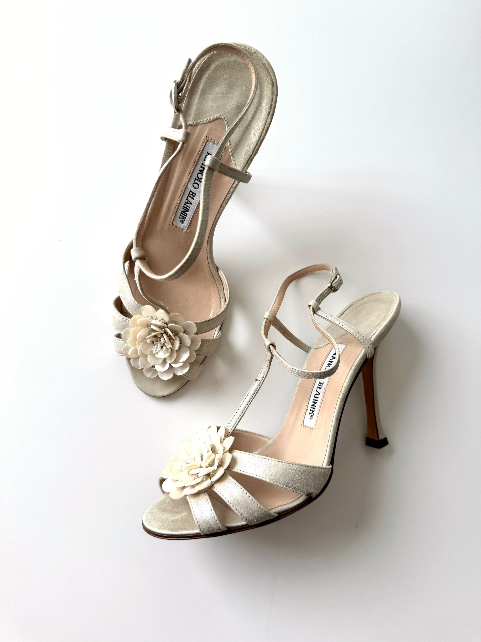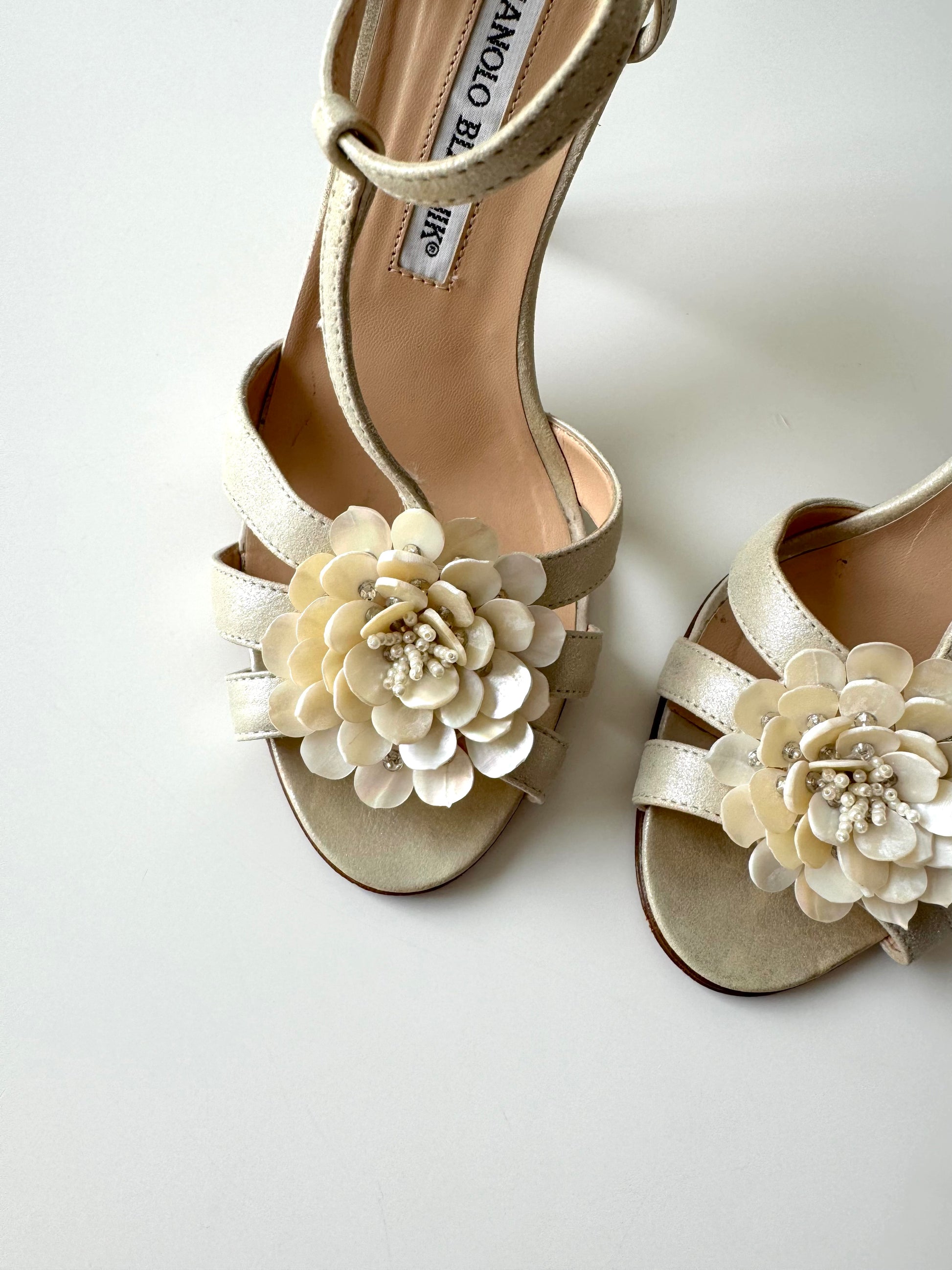 Stunning Manolo Blahnik heels with straps and pearl flower. So feminine and romantic - perfect for a summer date night in Capri or even as a bridal heels. Meant to be treasured forever!