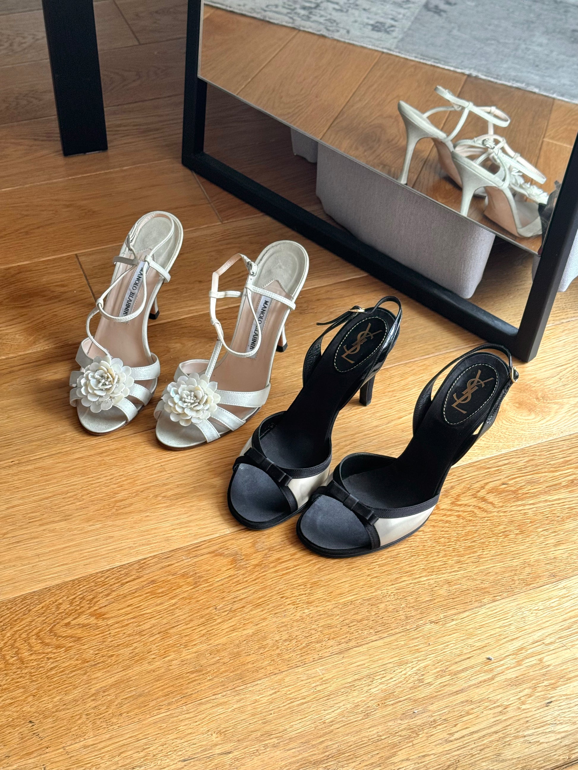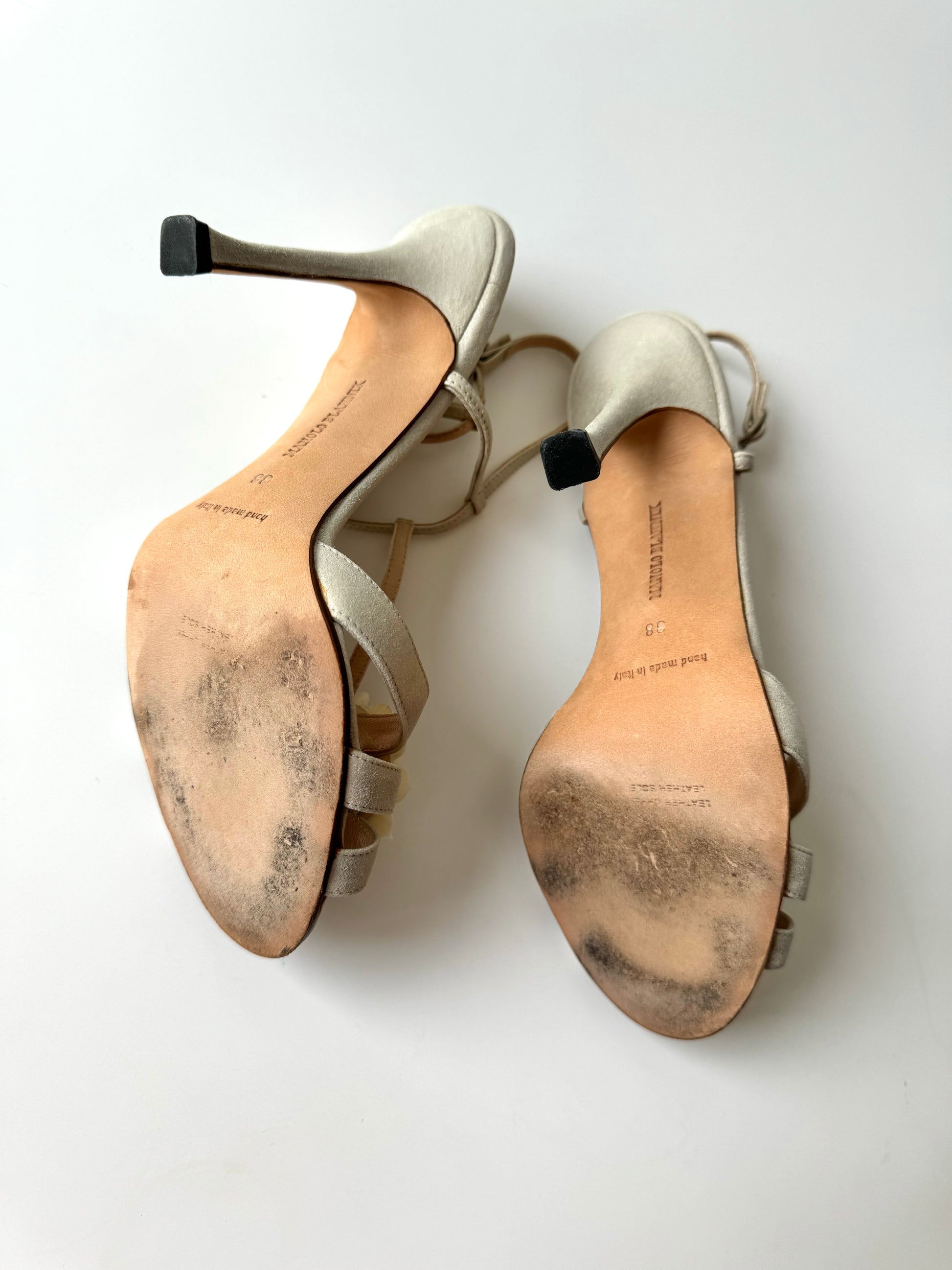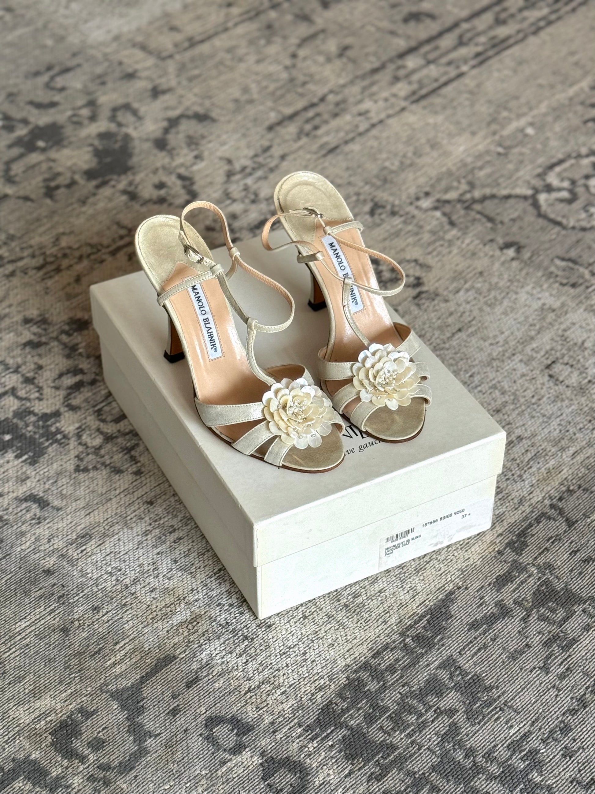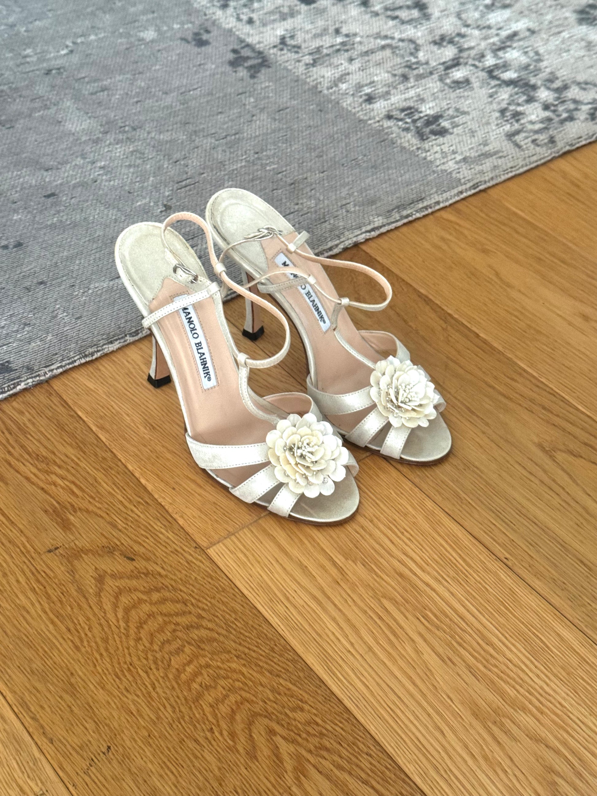 Stunning Manolo Blahnik heels with straps and pearl flower. So feminine and romantic - perfect for a summer date night in Capri or even as a bridal heels. Meant to be treasured forever!