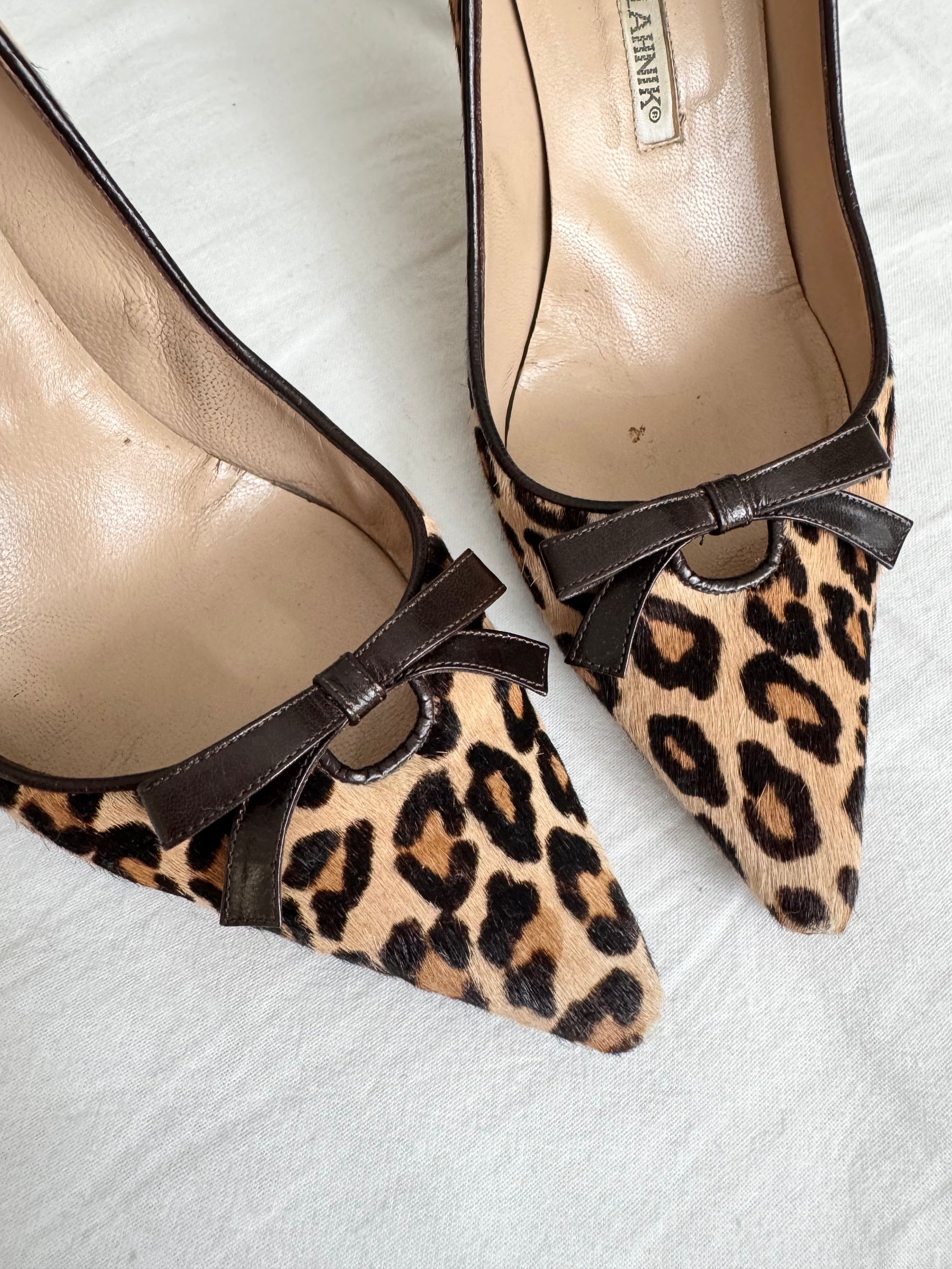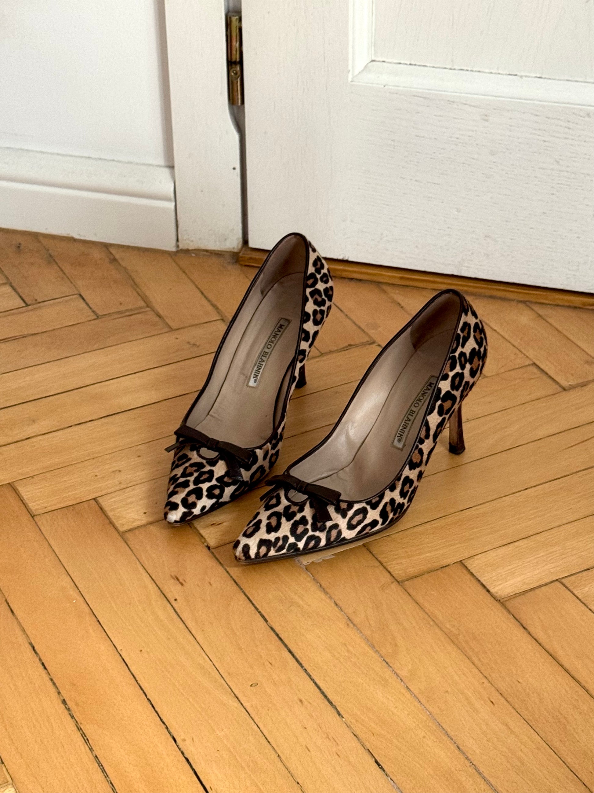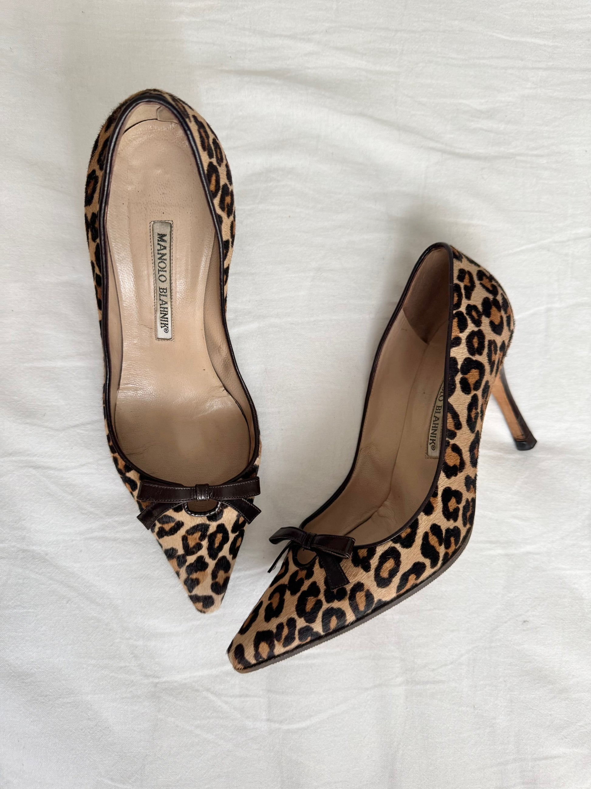 Beautiful Manolo Blahnik, a classic silhouette in an animal print, adorned with a leather bow. The decorative bow gives a touch of romanticism to a femme-fatale look. Perfect for both work and a romantic date with candle lights - a sample in everyone's closet!