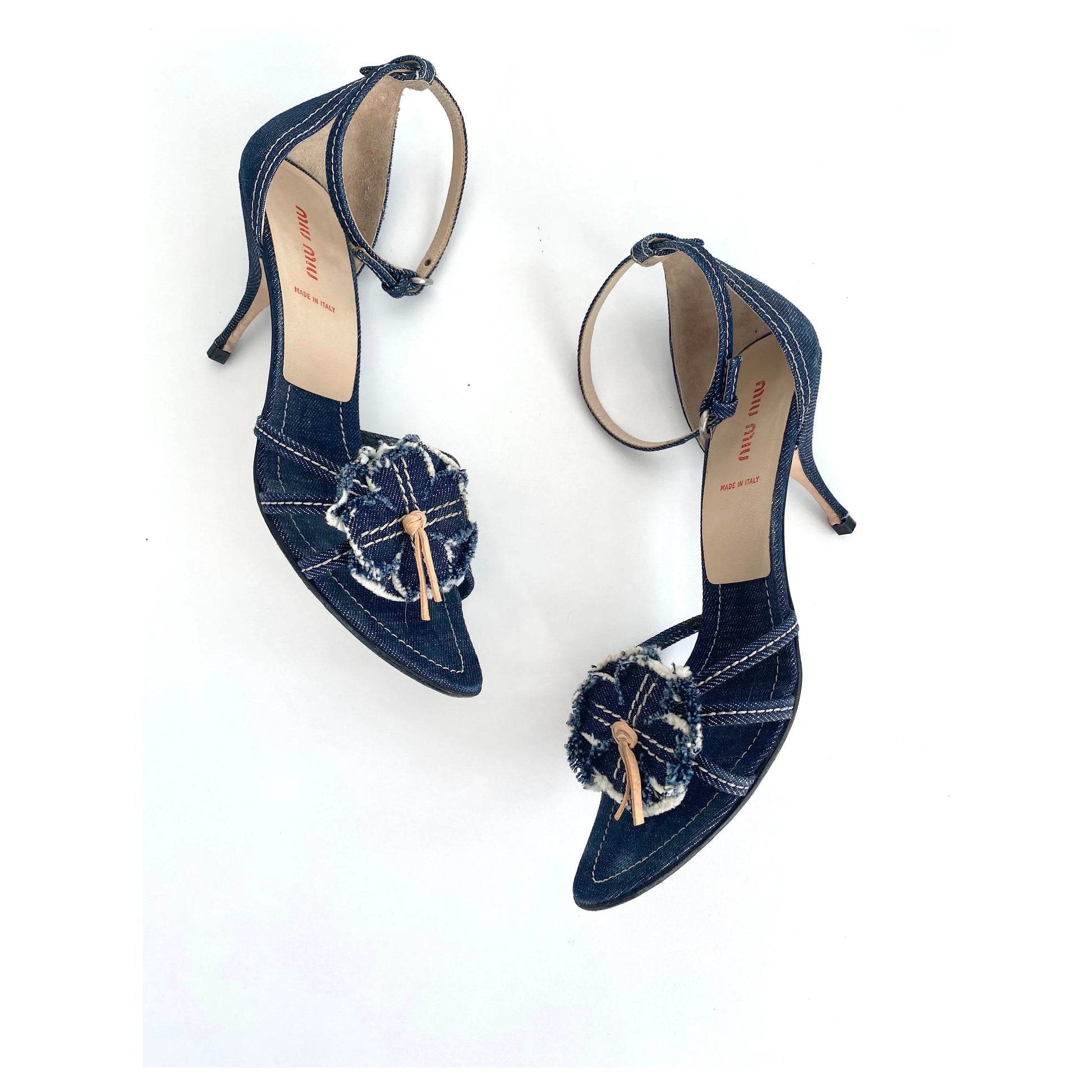 Stunning Miu Miu heels in denim adorned with flower detailing. A timeless statement accessory with a 2000s feel. Sold with the original box and a dust bag.