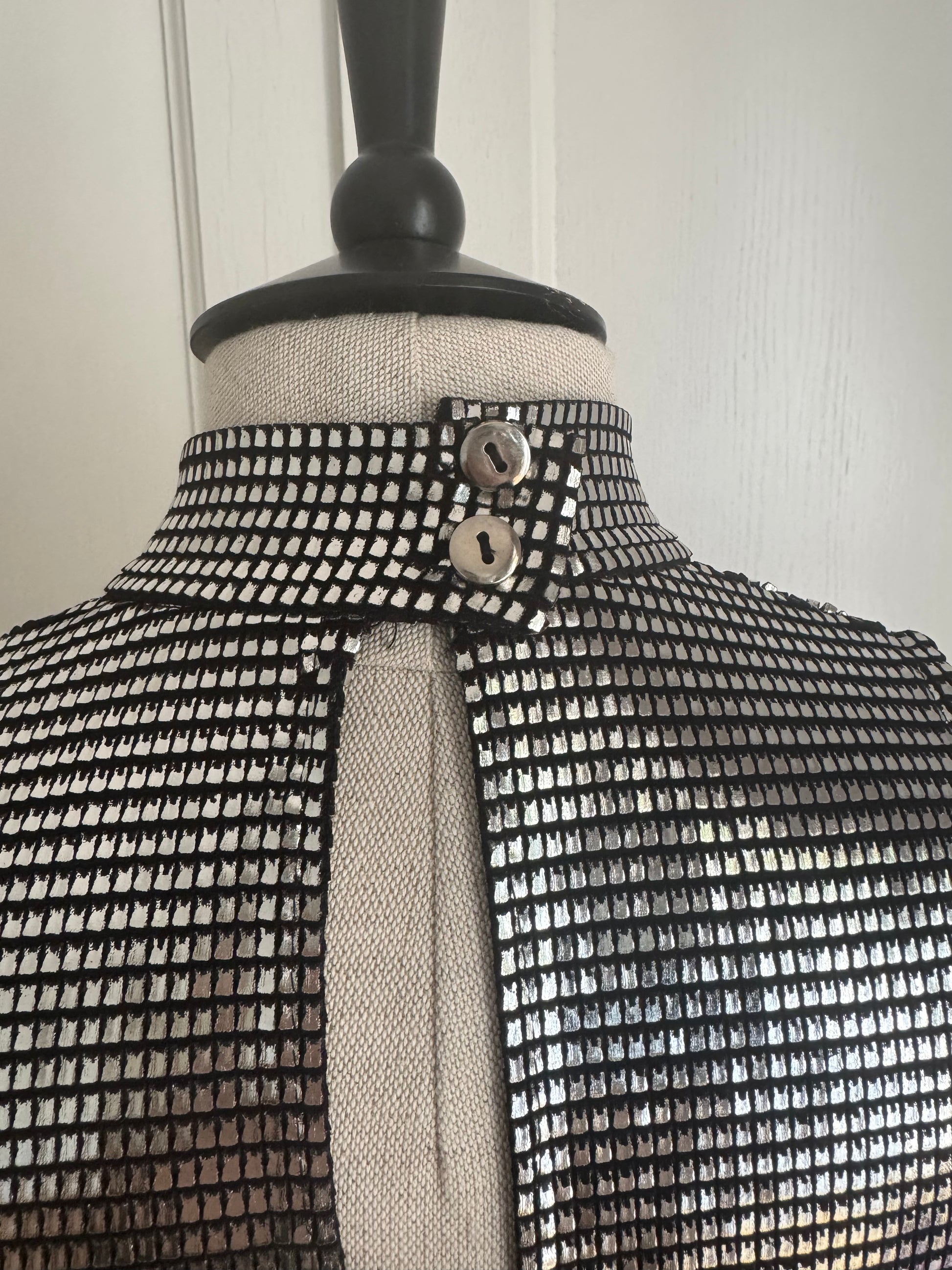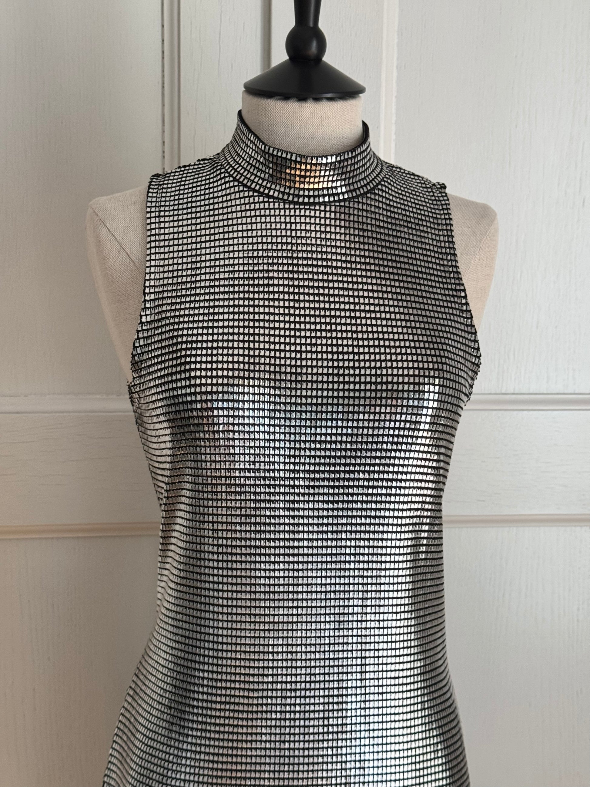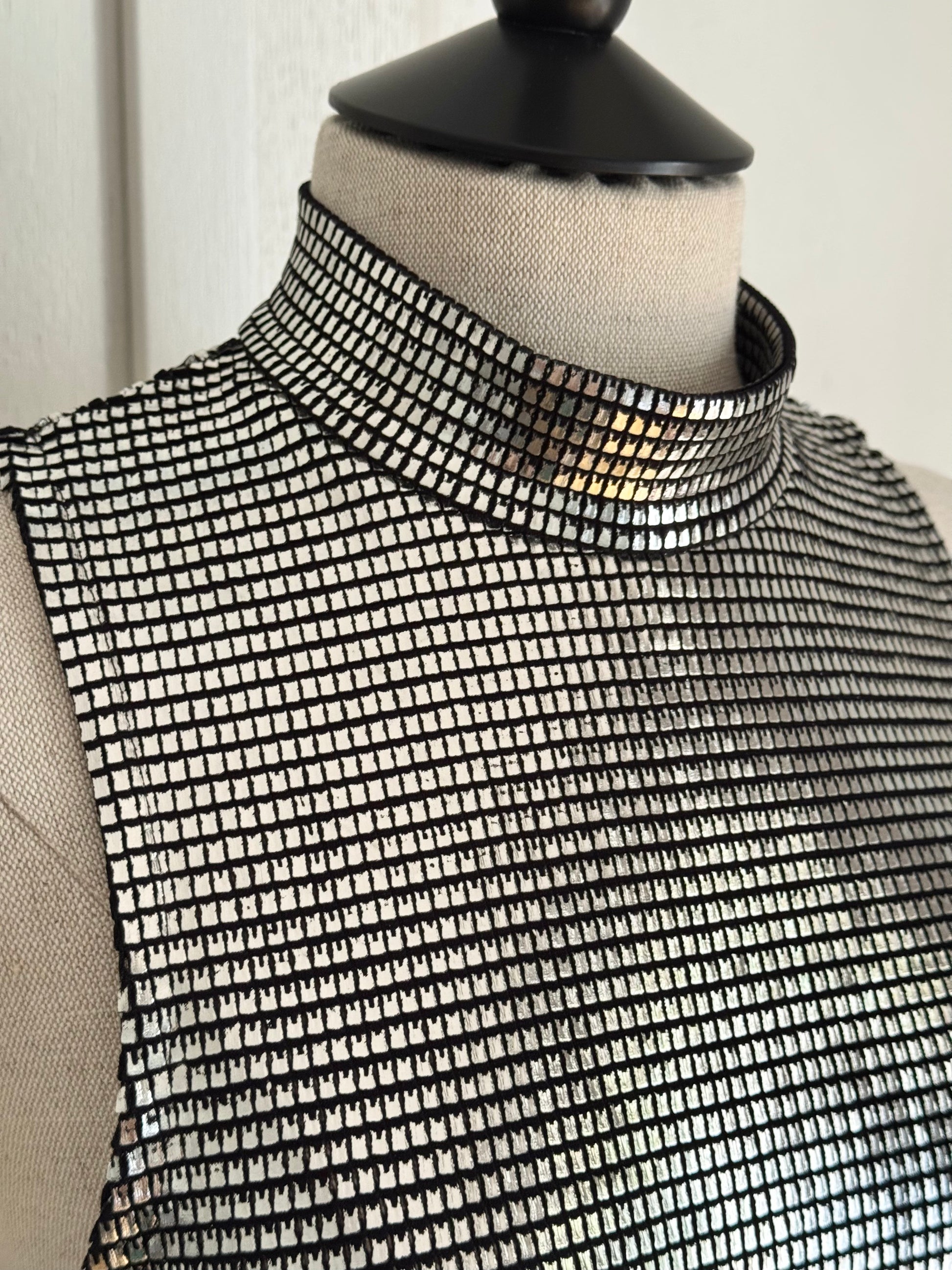 Iconic Paco Rabanne mini dress in silver, adorned with tiny metallic "plates" - the Paco Rabanne's staple. Pair it with boots for the ultimate 70s look or with black strappy heels for a night out.