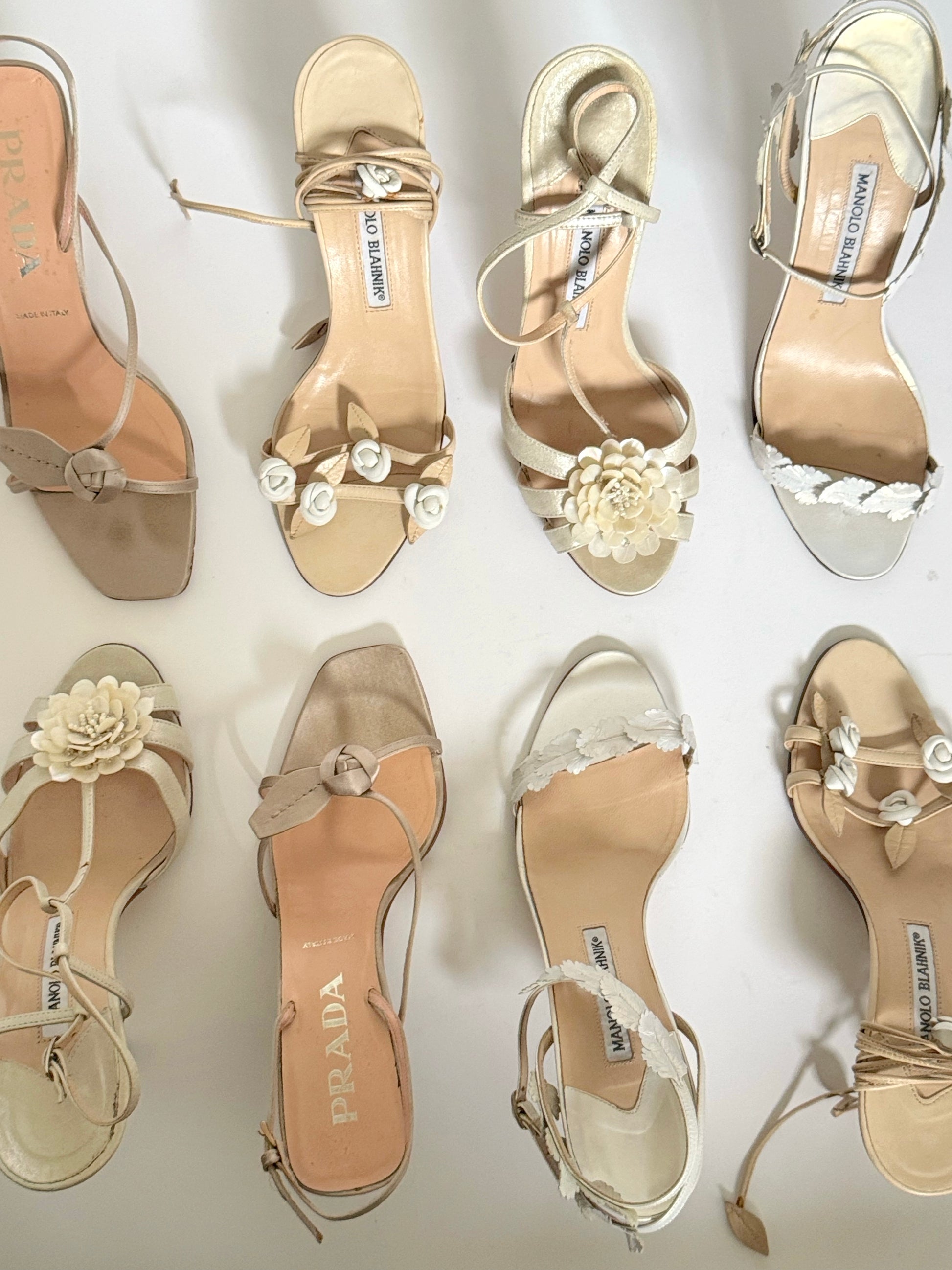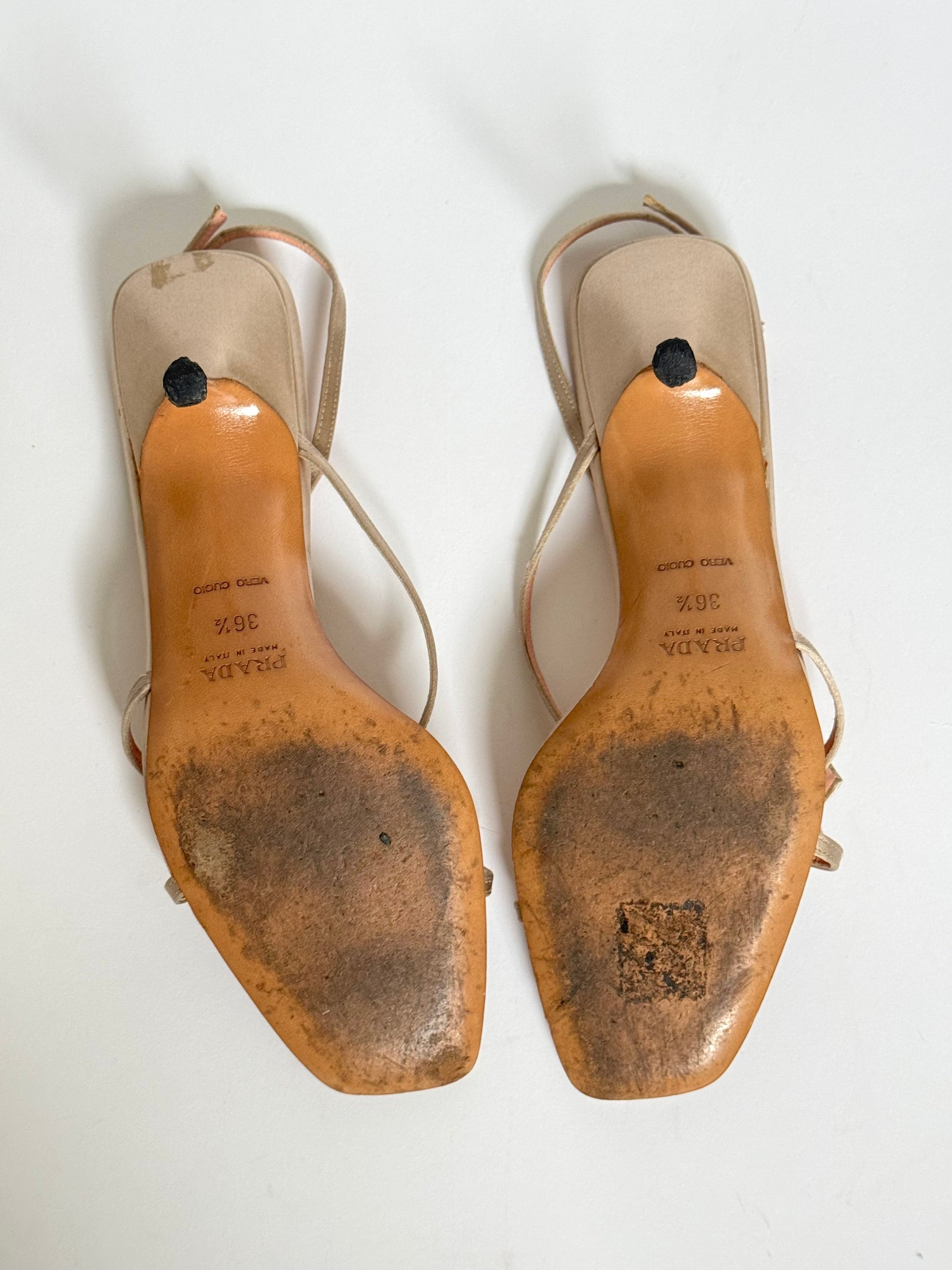 Gorgeous vintage Prada sandals, adorned with leaves and rose buds, in metallic, champagne satin. Absolutely stunning and feminine! Perfect for both a coffee date and a wedding!