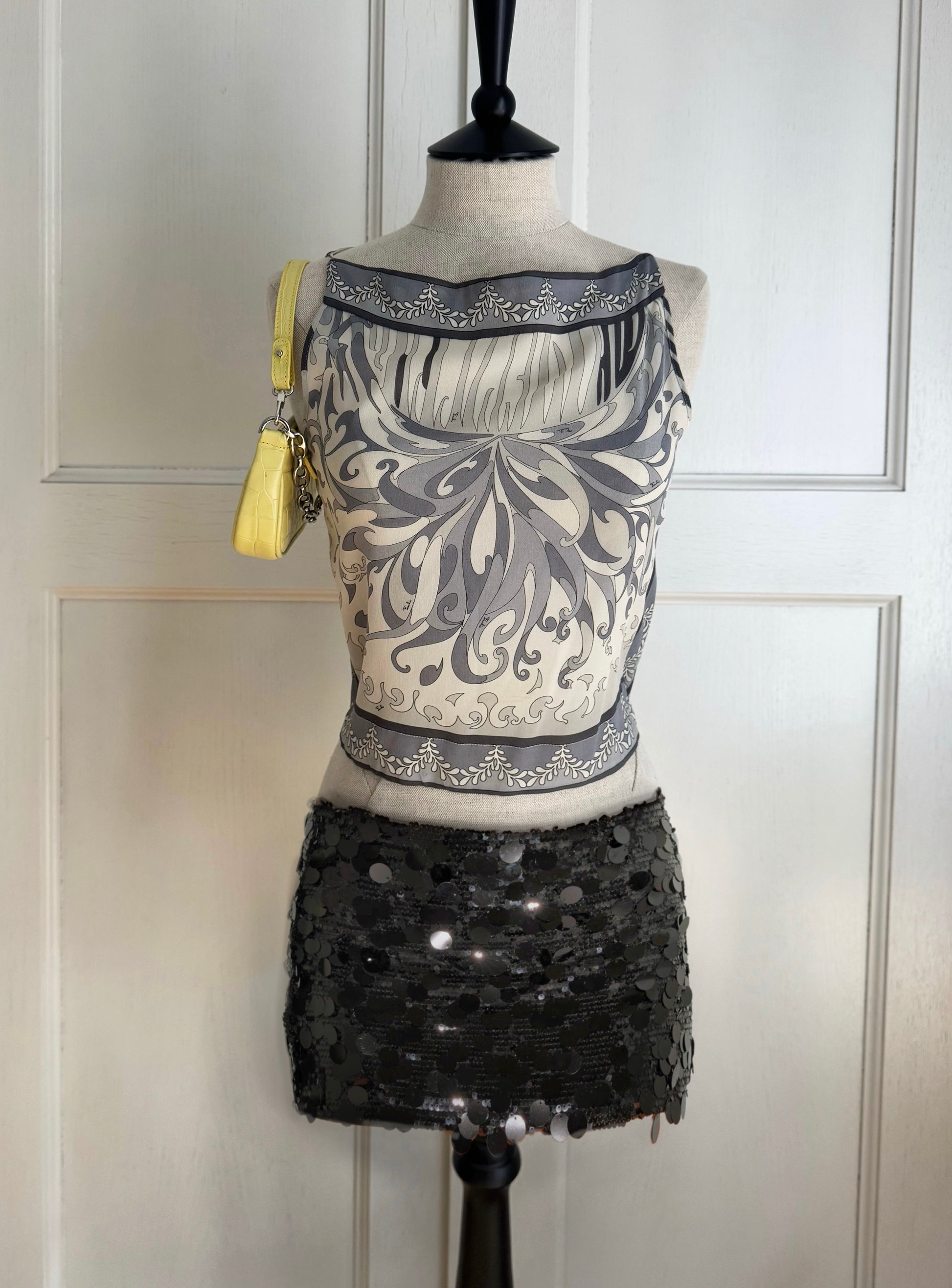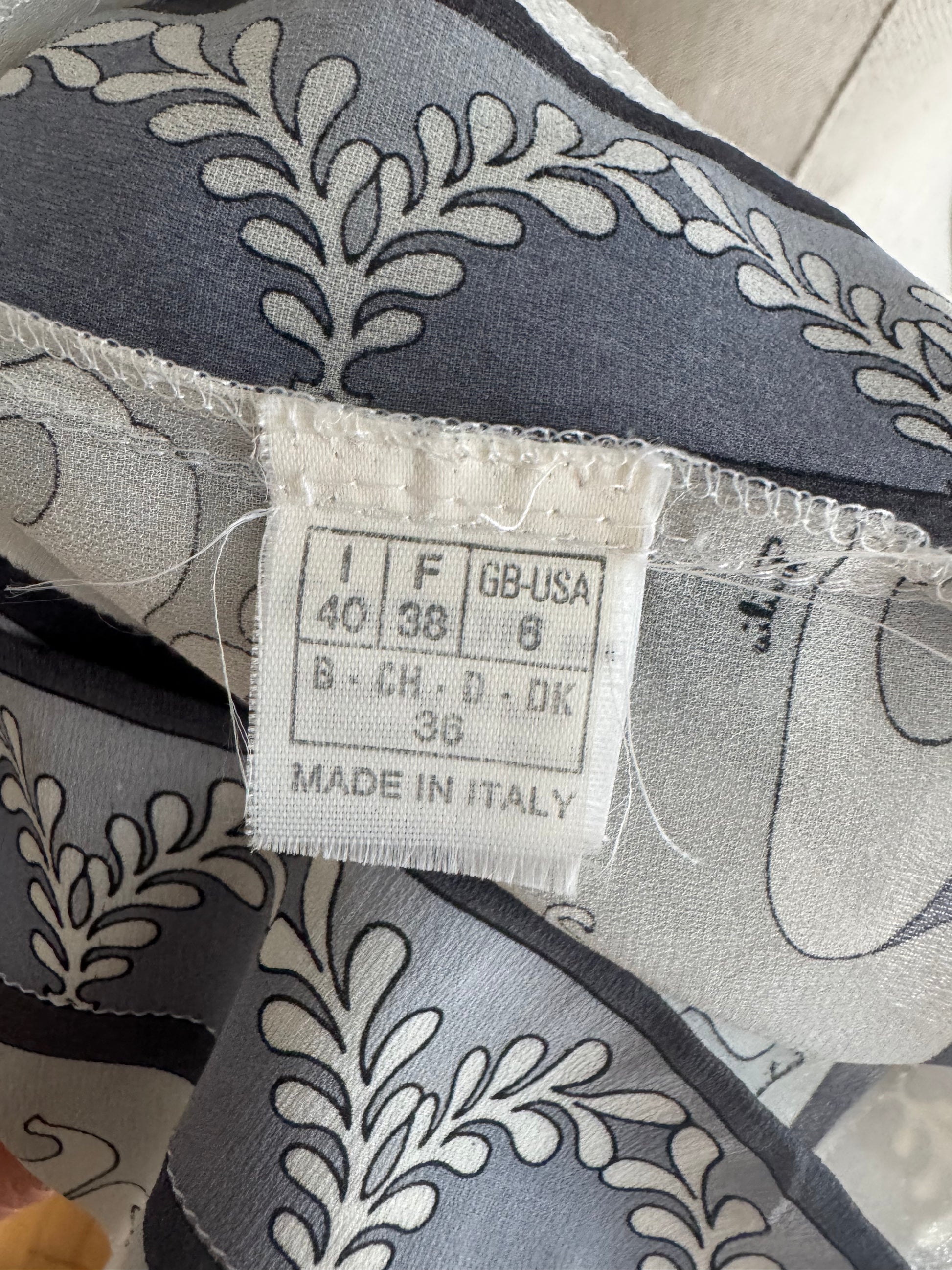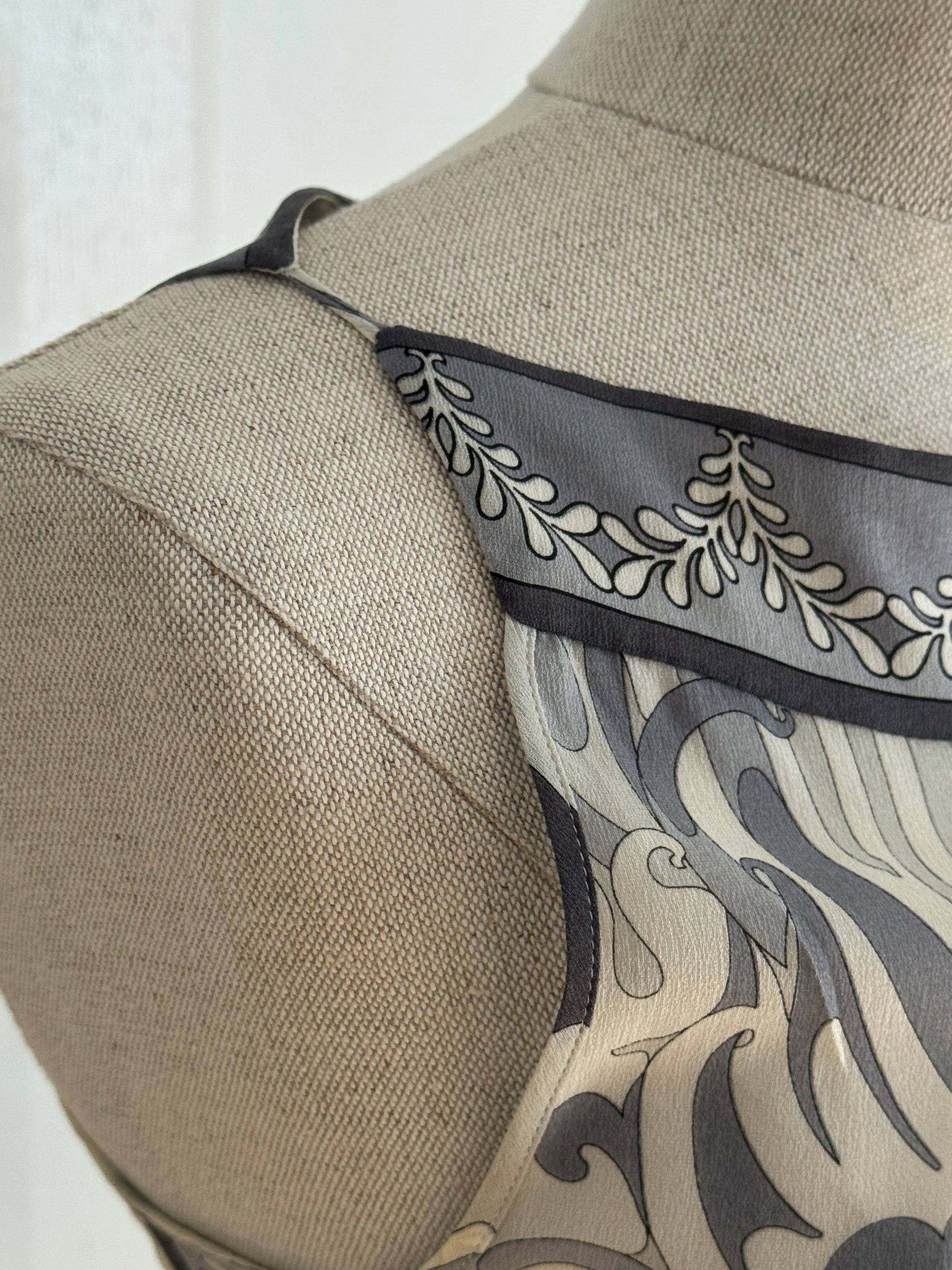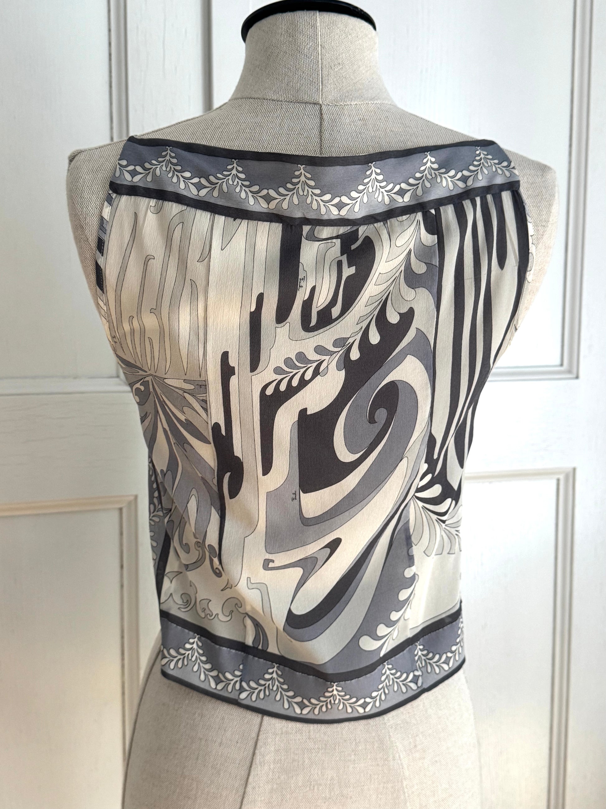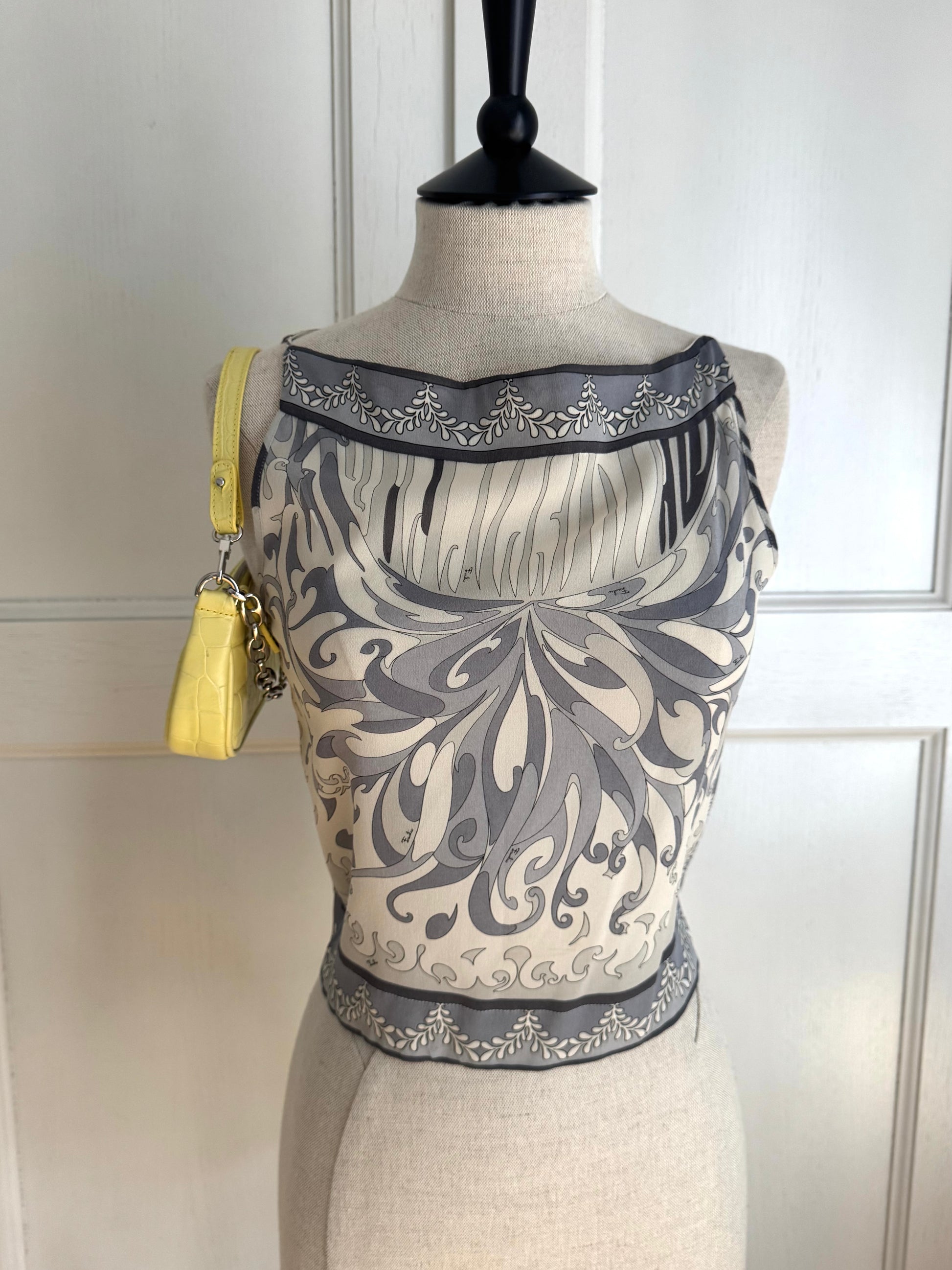 Beautiful silk top by Emilio Pucci circa 2010. Elegant but feminine - the crop top style accentuates the waist and creates an hourglass illusion. Brings to mind the sunny Amalfi Coast and evening Campari dates.