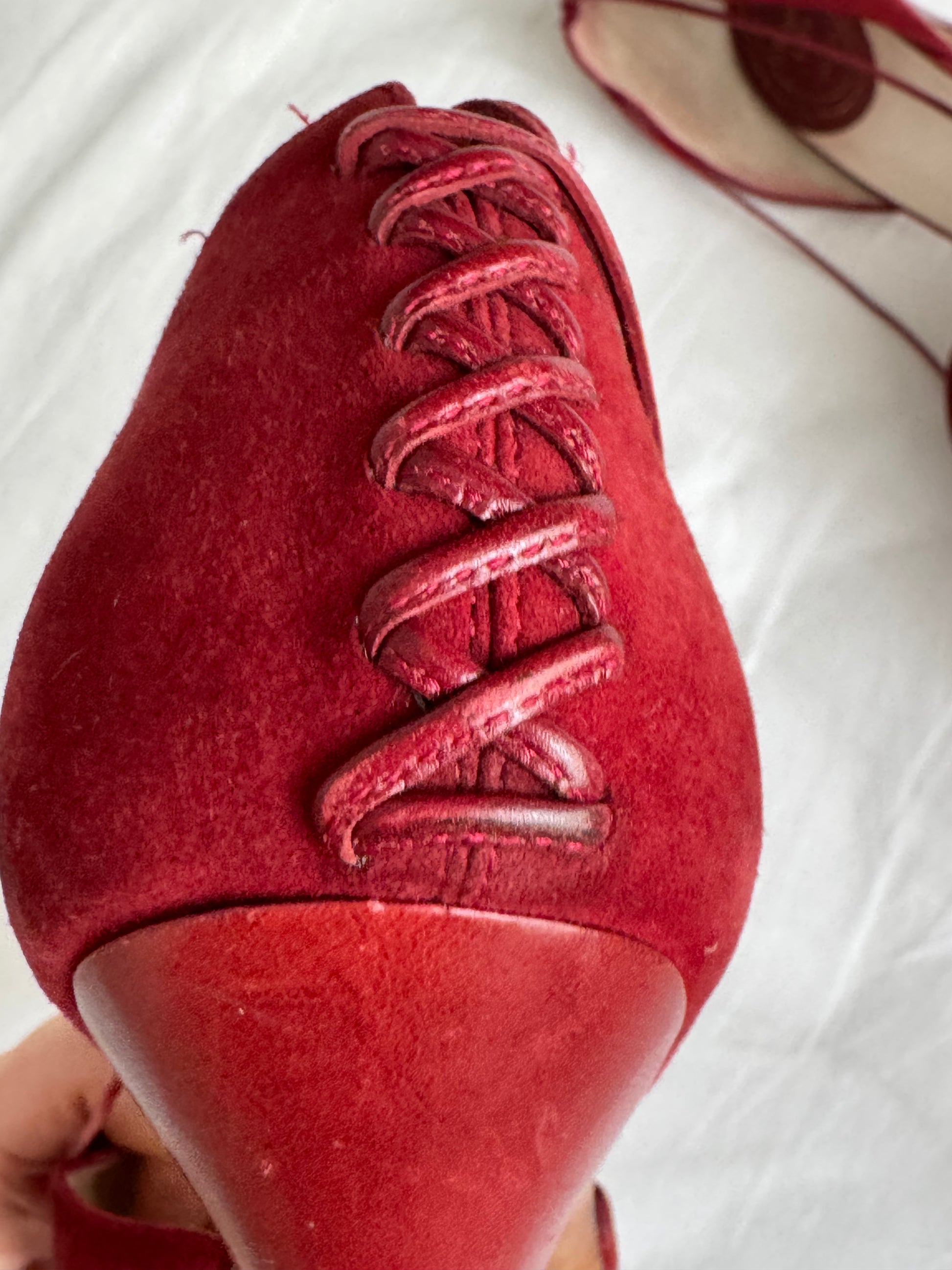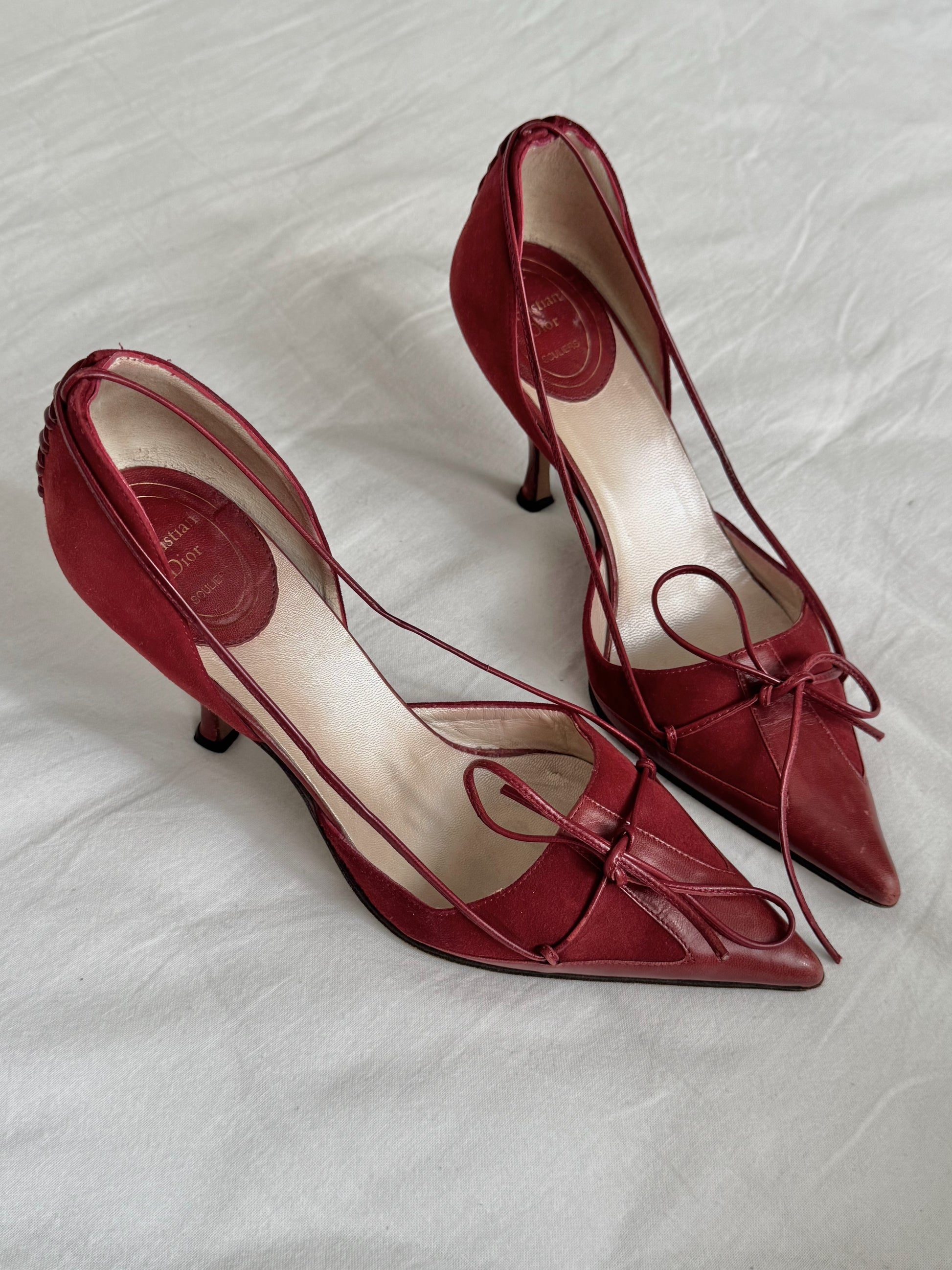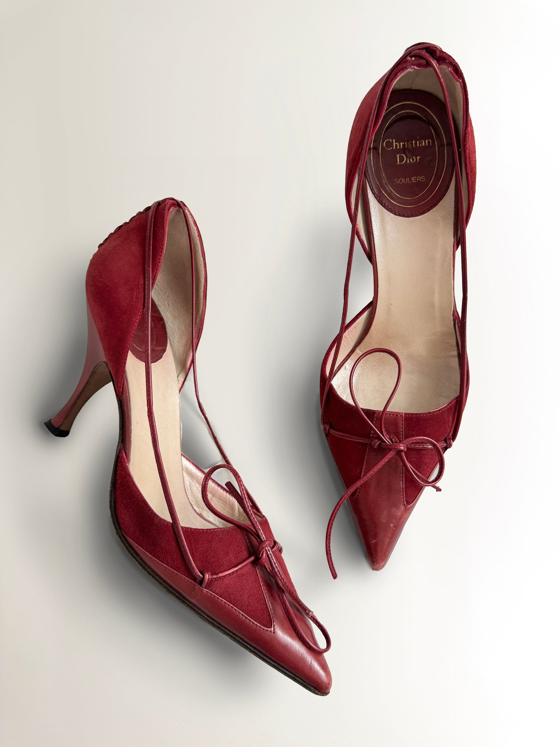 Stunning Christian Dior "Souliers" heels from the early 90s or late 80s, made from the burgundy suede and leather inserts, adorned with leather lacing and a front bow. A classic silhouette with a twist - very femme fatale! A staple in everyone's closet!