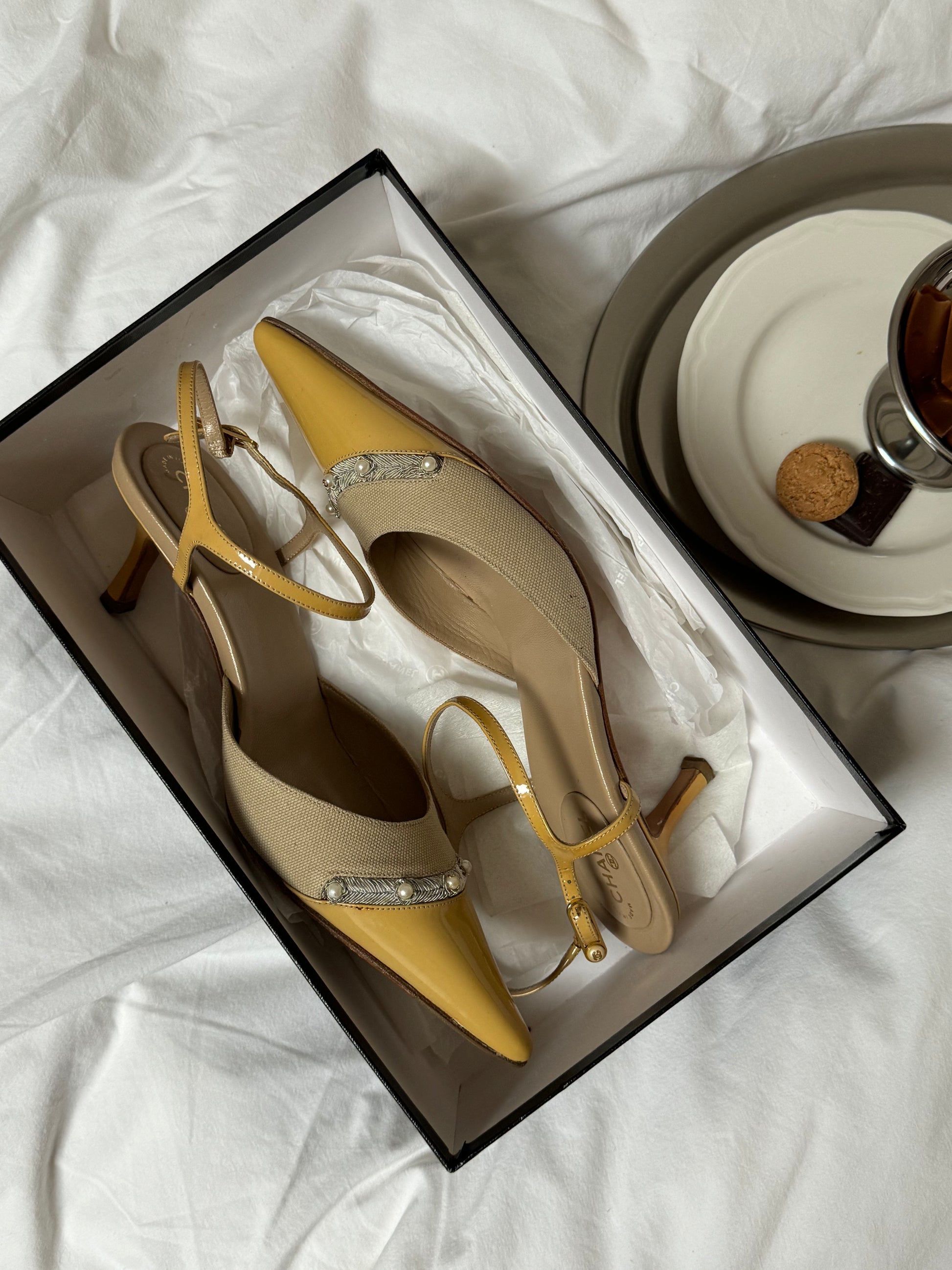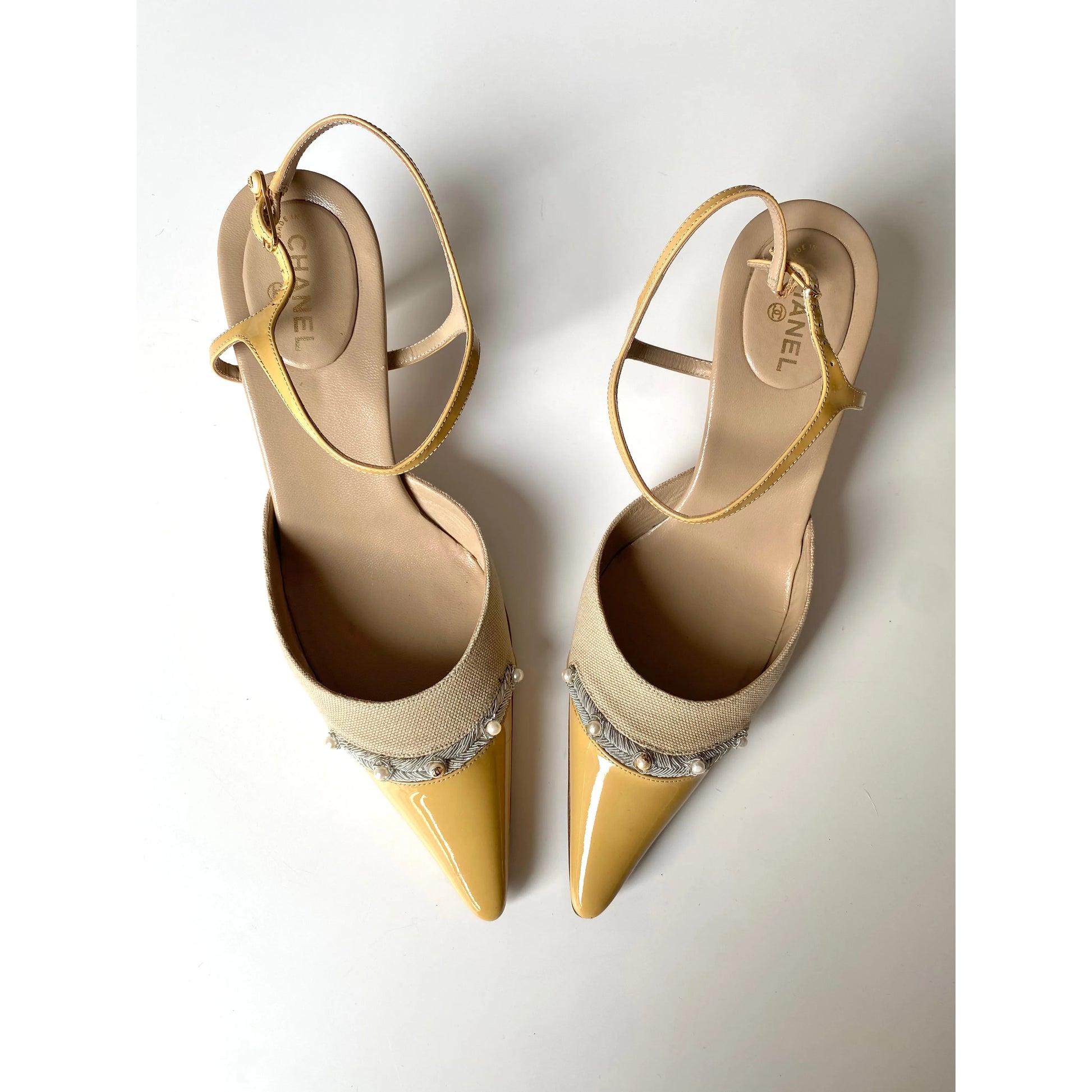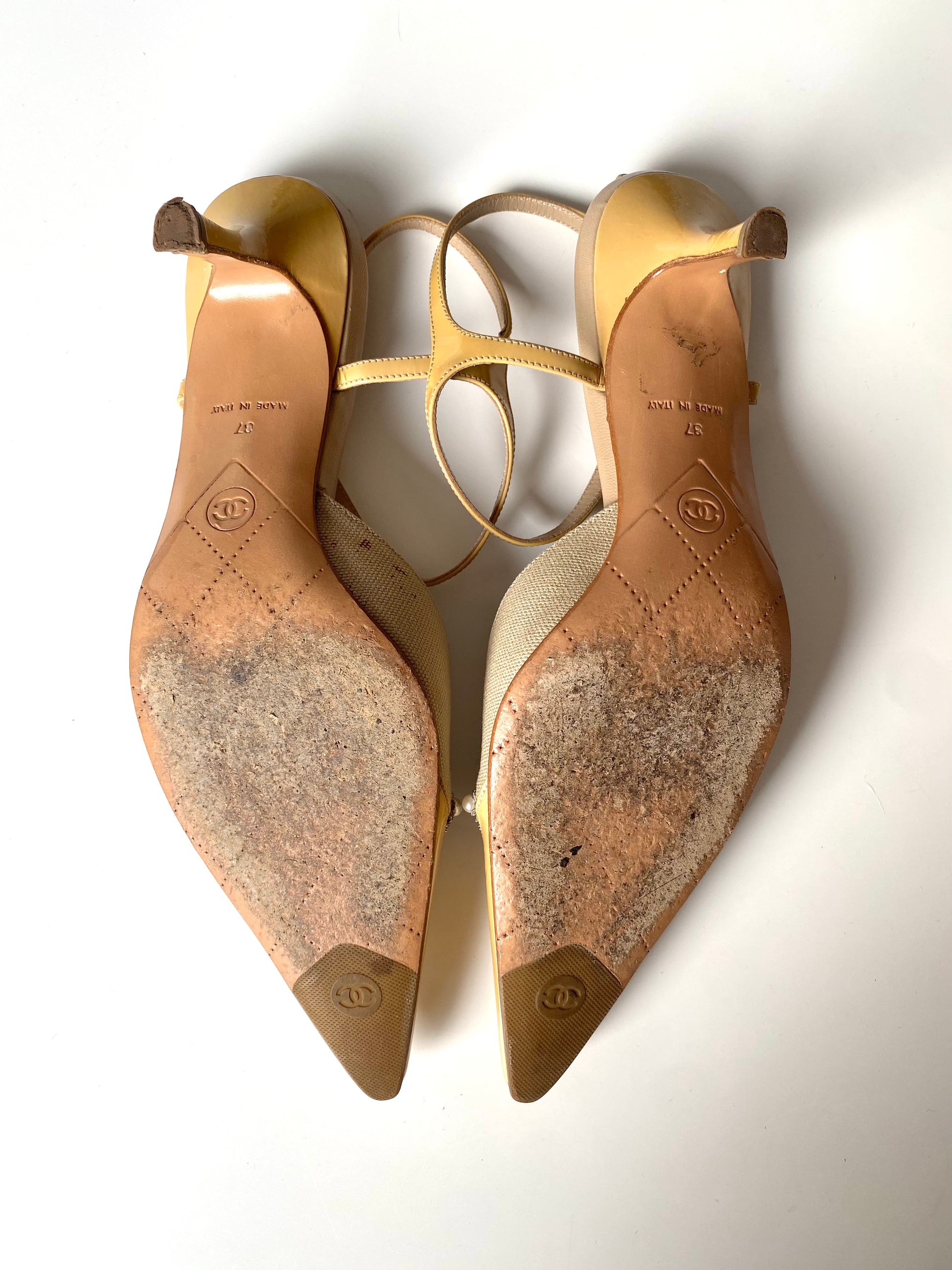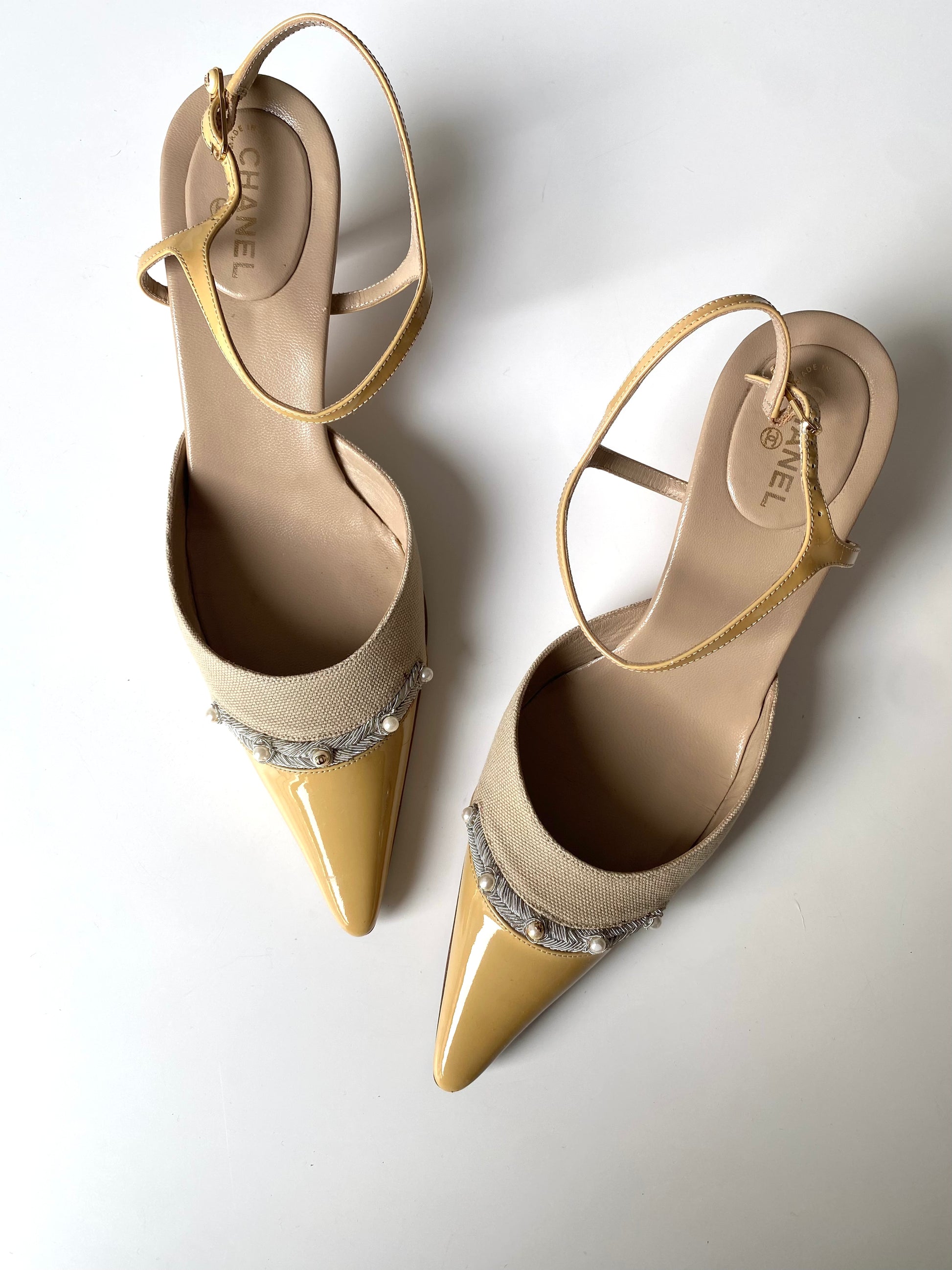 The most special double-colored Chanel slingback heels with pearl detailing. They were a part of Karl Lagerfeld's collection in the 90s. The yellow toned tip makes classic beige pumps even more special and is a nod to the timeless Chanel style. CC logo detailing on the central pearl and the strap. Sold with the complimentary Chanel box and tissue paper. Â
