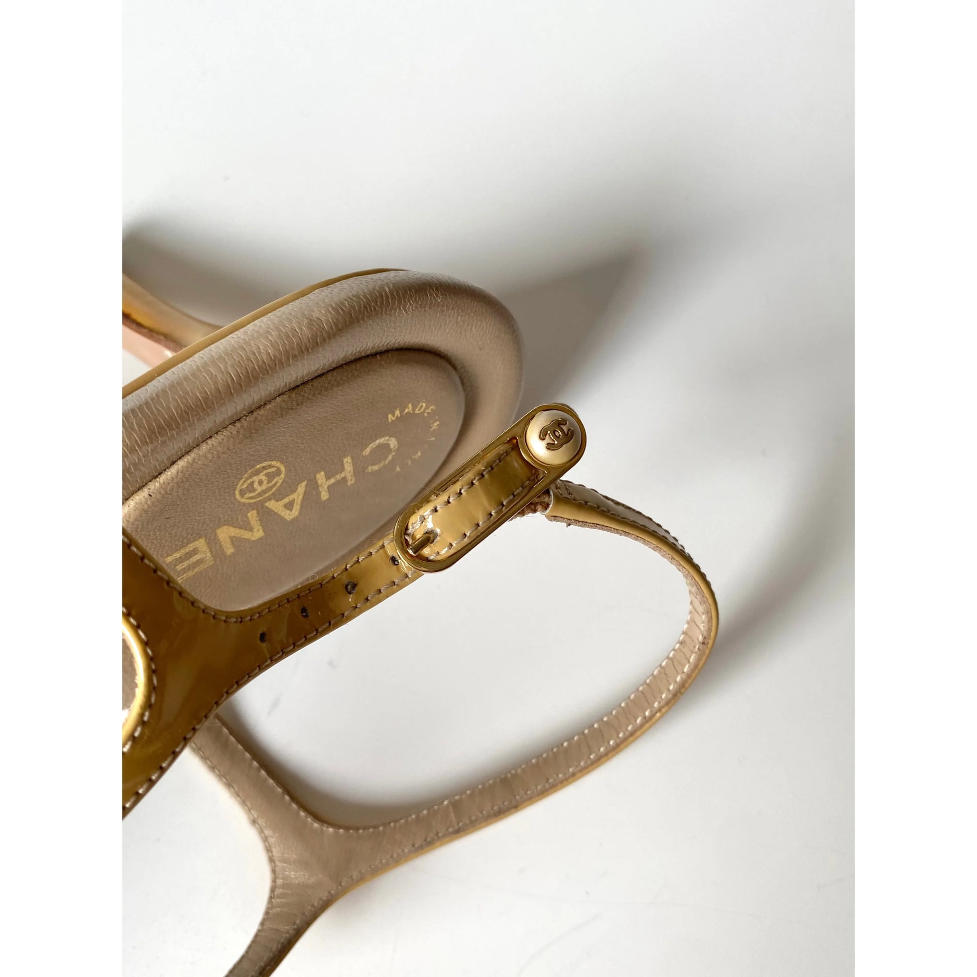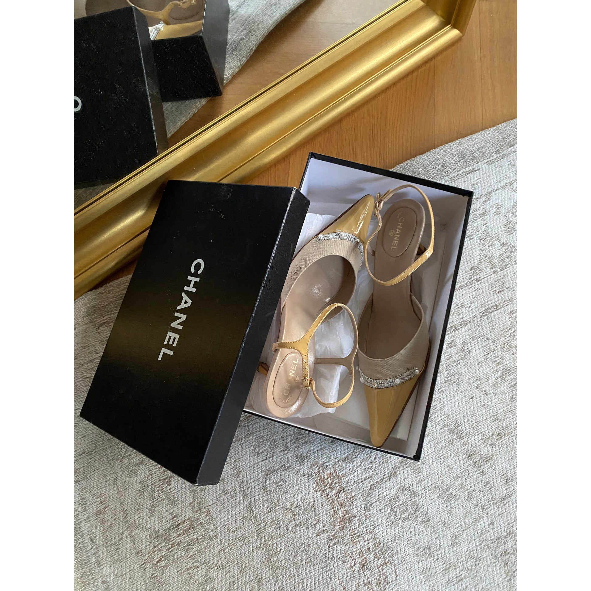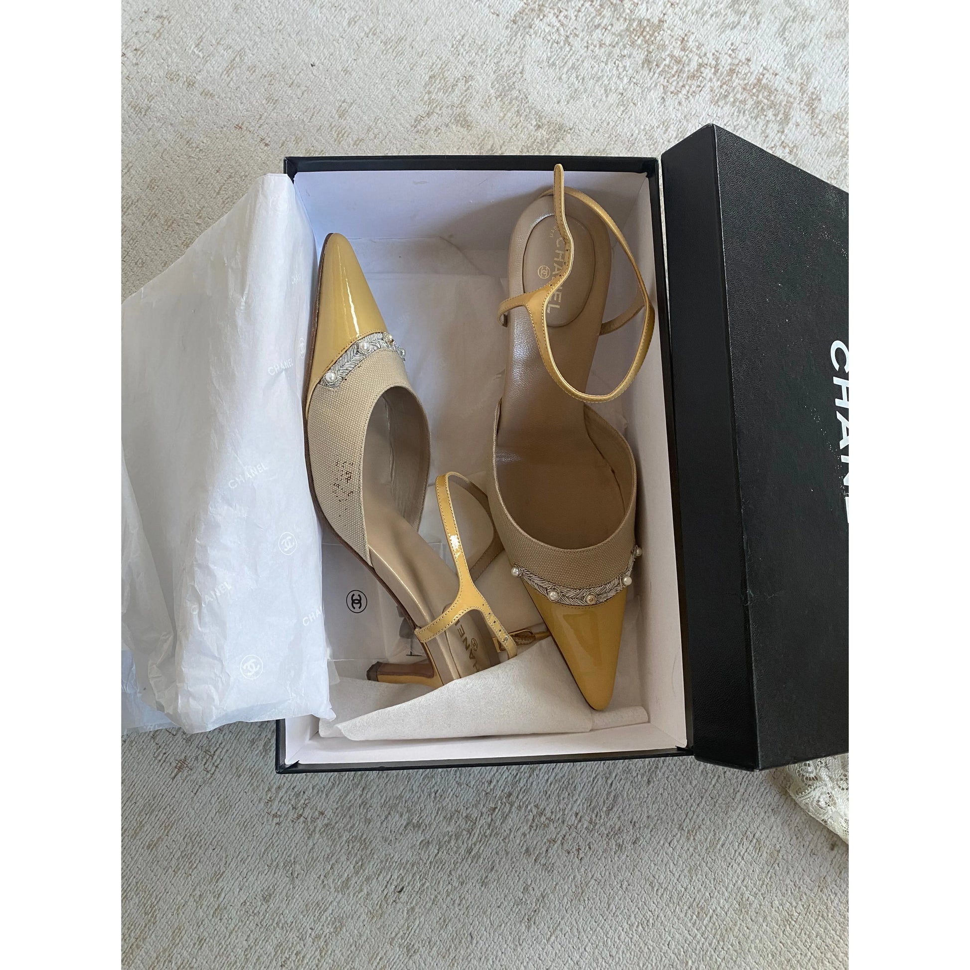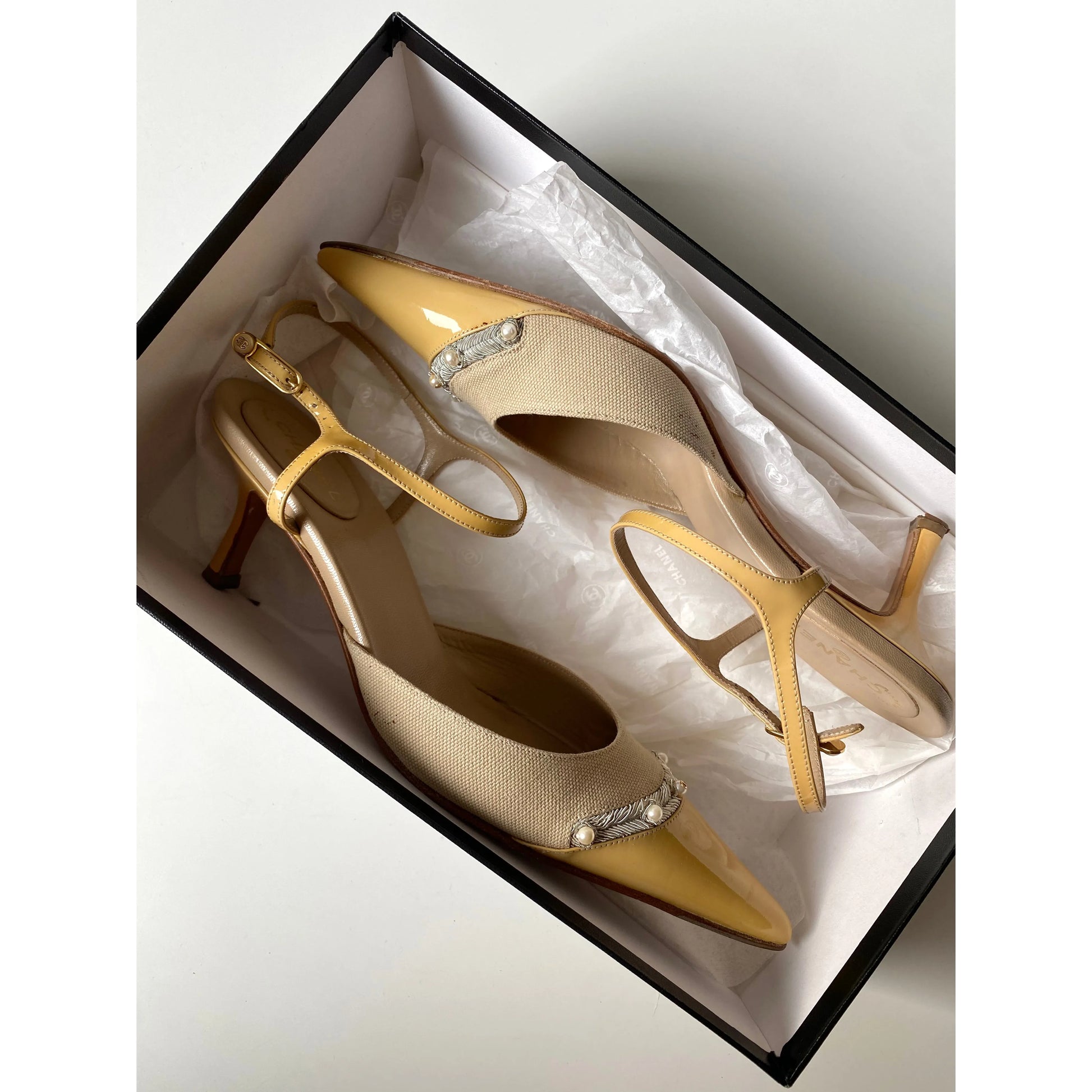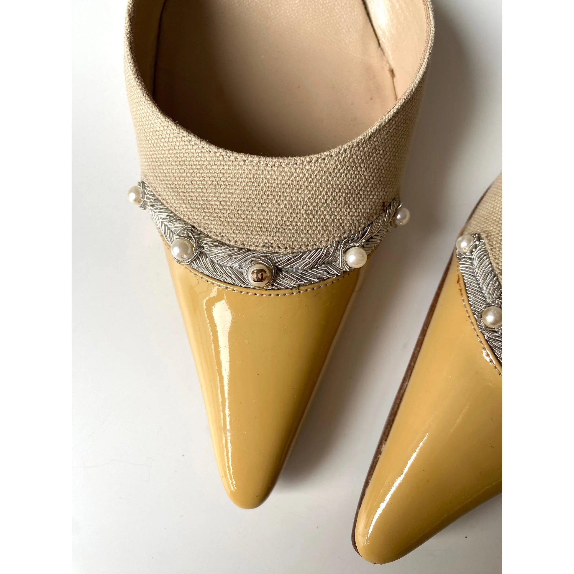 The most special double-colored Chanel slingback heels with pearl detailing. They were a part of Karl Lagerfeld's collection in the 90s. The yellow toned tip makes classic beige pumps even more special and is a nod to the timeless Chanel style. CC logo detailing on the central pearl and the strap. Sold with the complimentary Chanel box and tissue paper. Â
