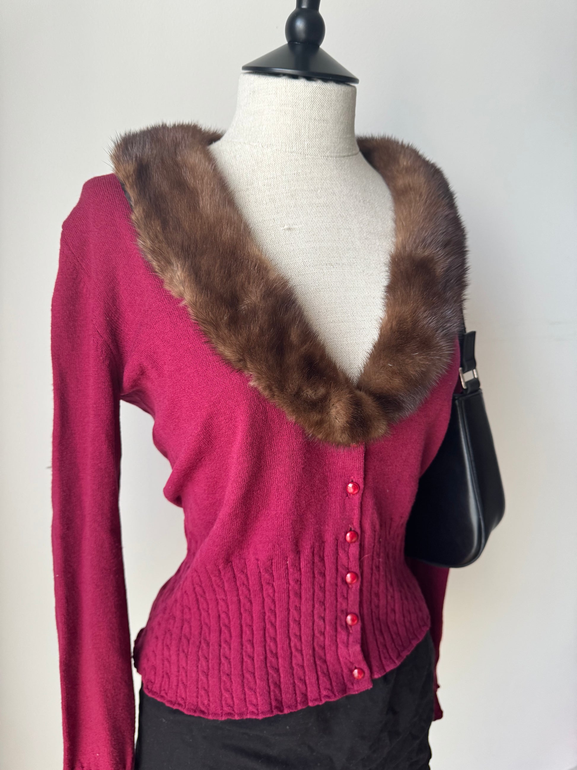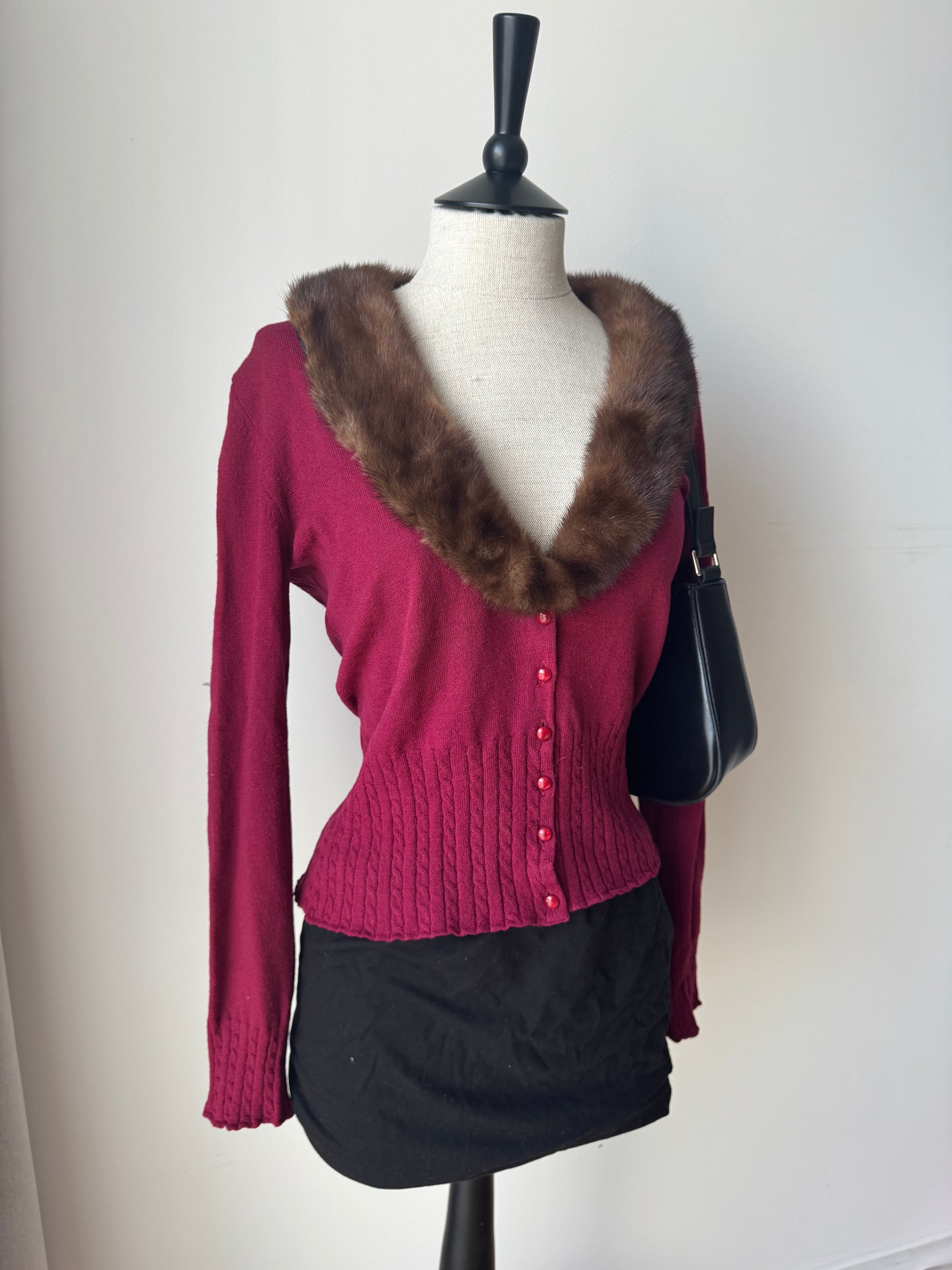 Iconic vintage Blumarine wool cardigan with a fur trim, introduced on the 1998 Fall / Winter runway. Adorned with a braid pattern and pearly buttons. Pair it with a micro skirt and a mini bag for the ultimate y2k look! A real gem for vintage lovers!