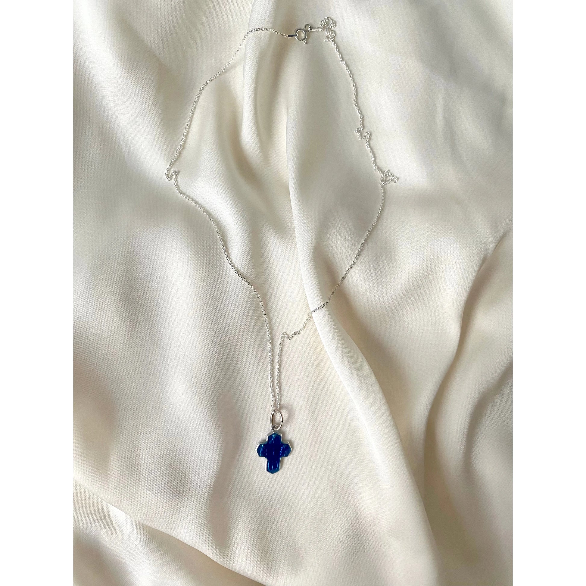 Beautiful necklace with small blue vintage cross from the 1950s. Jewelry for a gentle soul - would look adorable paired with a white cotton slip dress. Renewed with solid silver chain (925 AG). Made in France.