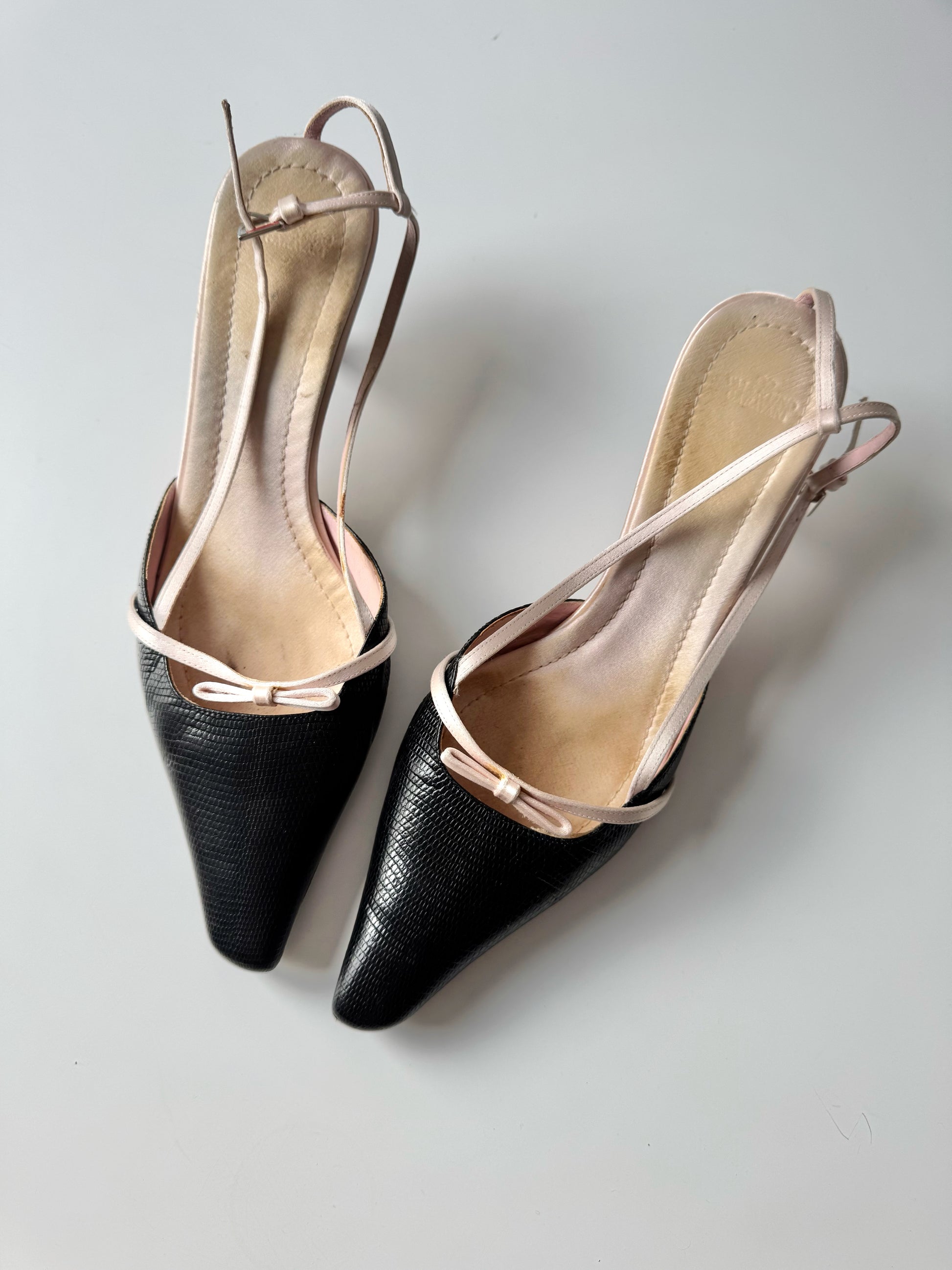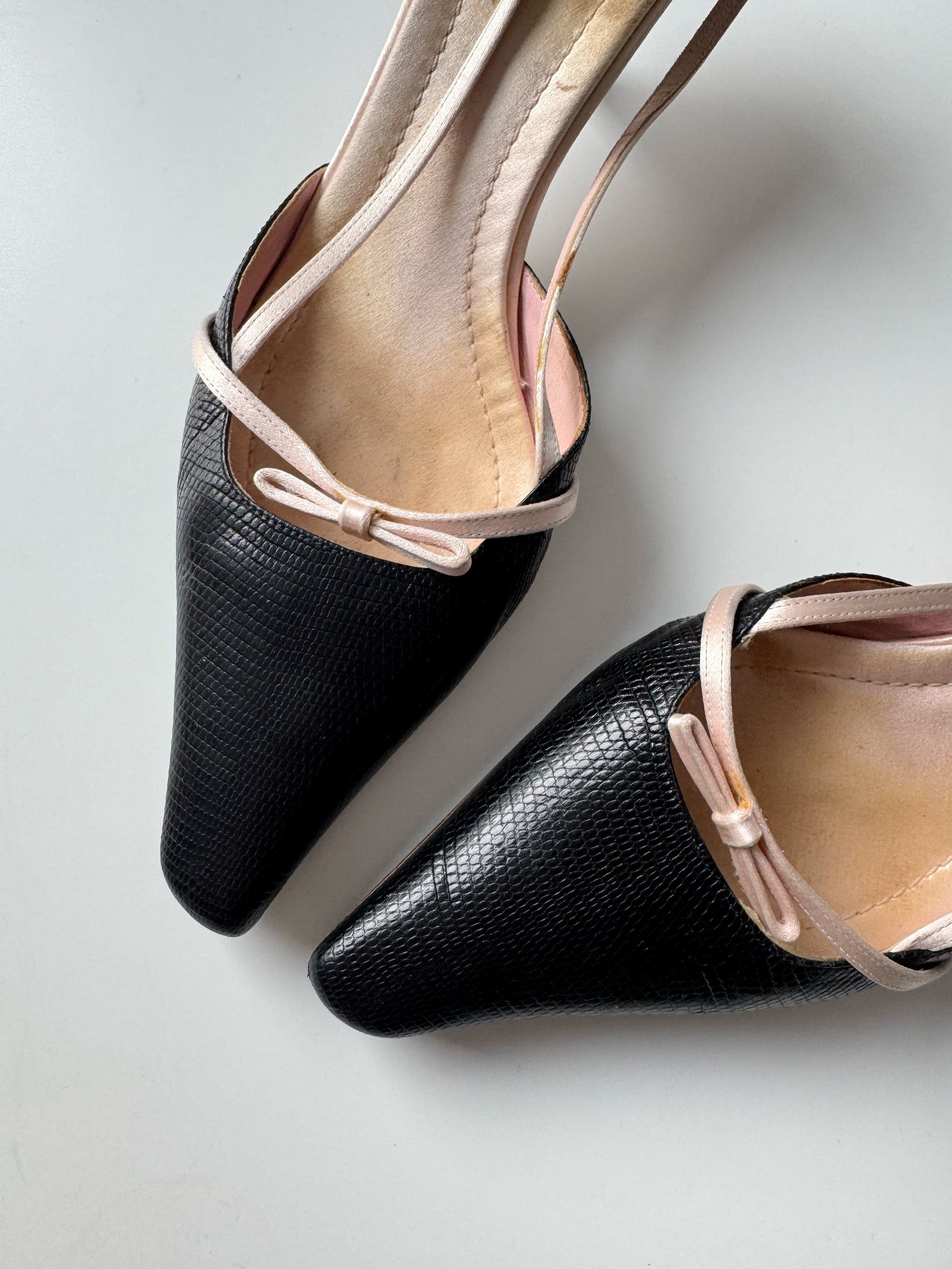 Stunning Valentino satin & croc-like leather heels with bow detailing. Beautiful combination of cream and black gives a little twist to a classic silhouette. A romantic design that brings to mind ballet and icons like Brigitte Bargot. Perfect for both a business meeting and a romantic date with candlelights.Â