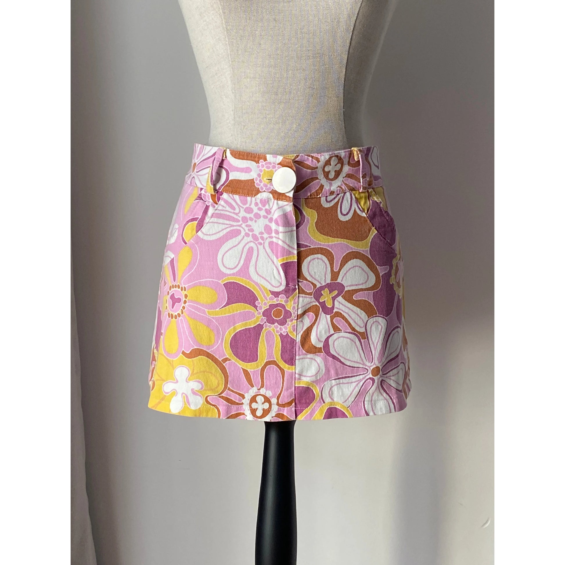 Beautiful denim mini skirt with classic 70s groovy print. Cute and fun. Pair it with your favorite vintage-style sneakers and a simple white tank top for the perfect everyday look! Sourced from Italy.