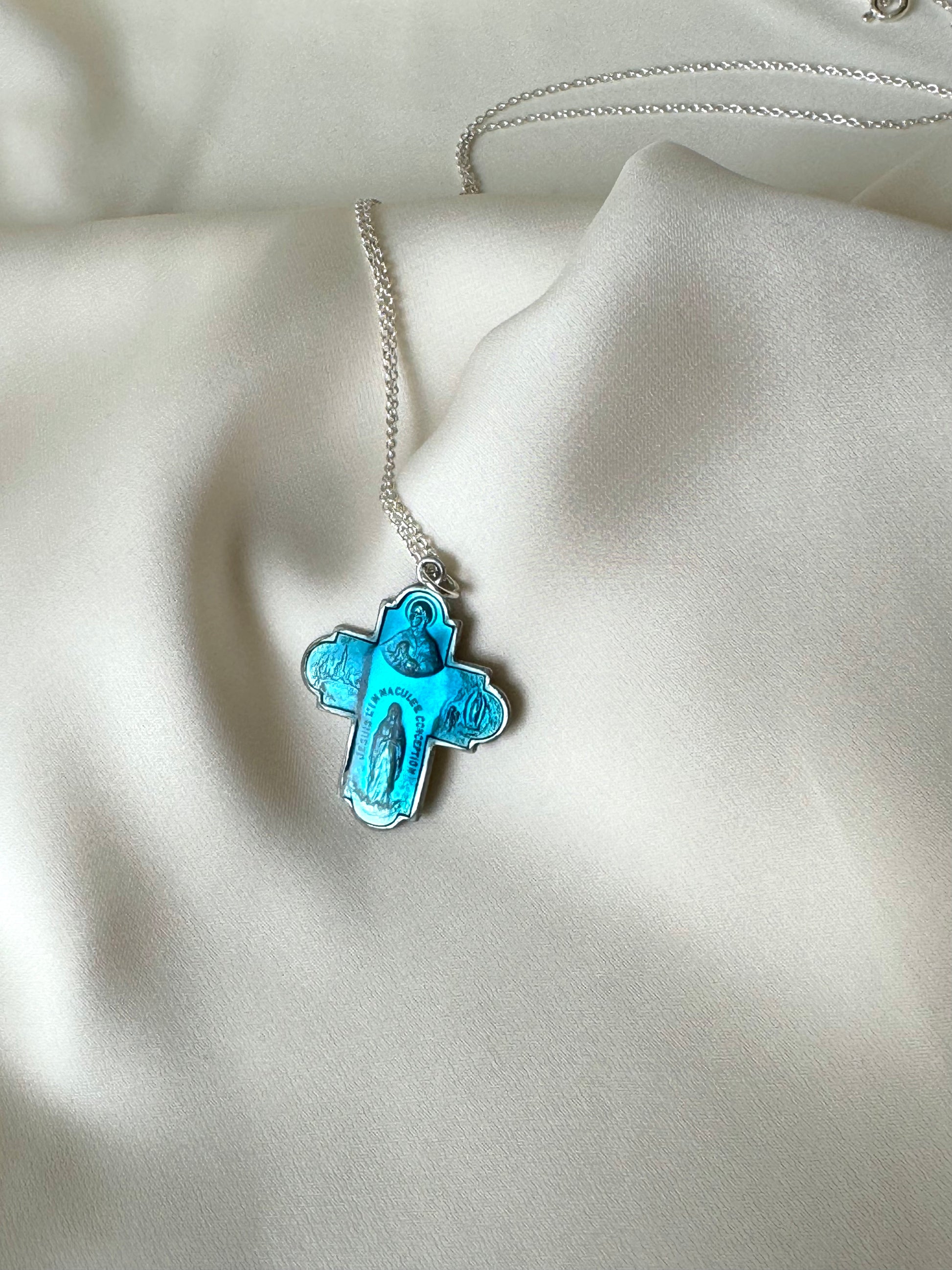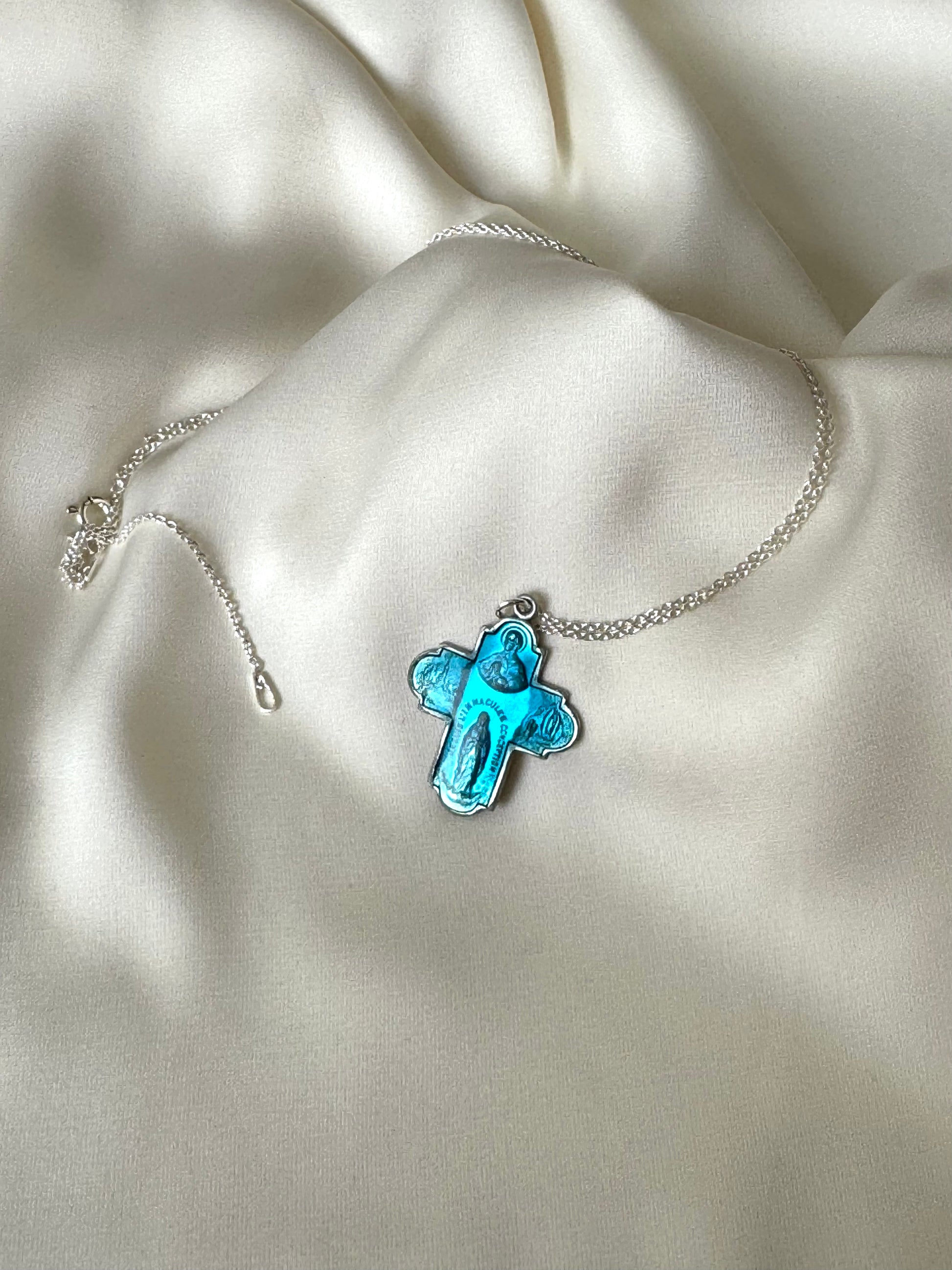 Stunning vintage cross circa 1950 in blue paired with 925 AG solid silver chain. This subtle yet unique piece is something for a romantic soul. Should be treasured forever.