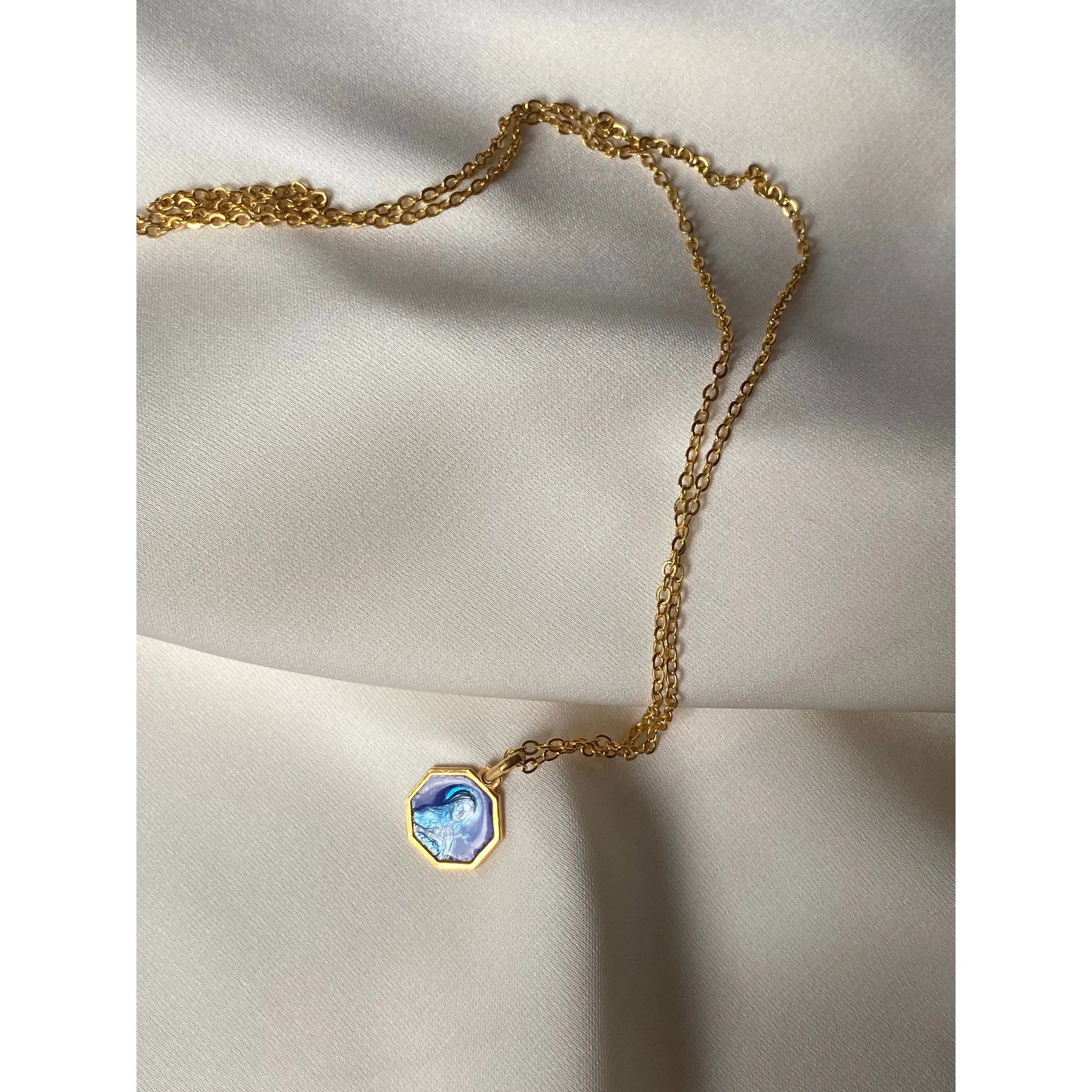 Stunning vintage pendant paired with a new gold-plated chain, sourced from France. Delicate jewelry for a romantic soul. Probably depicts a saint holding a branch.
