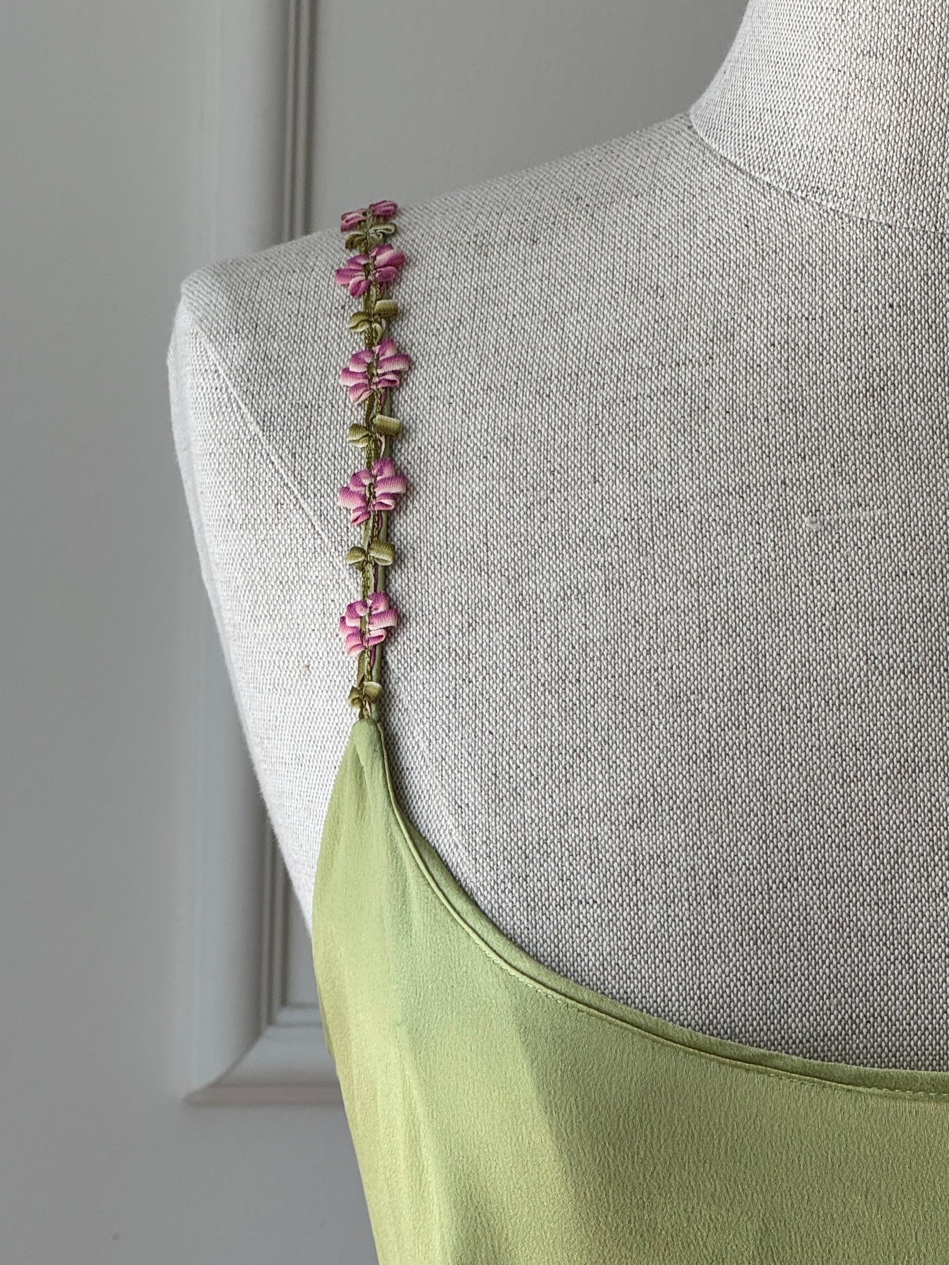 Ethereal Blumarine Blugirl dress circa 90s in green satin, adorned with tiny pink flowers and decorative ruffles. Absolutely whimsical and romantic - it evokes magical fairy tales and enchanted forests. An absolute gem for a vintage lover!