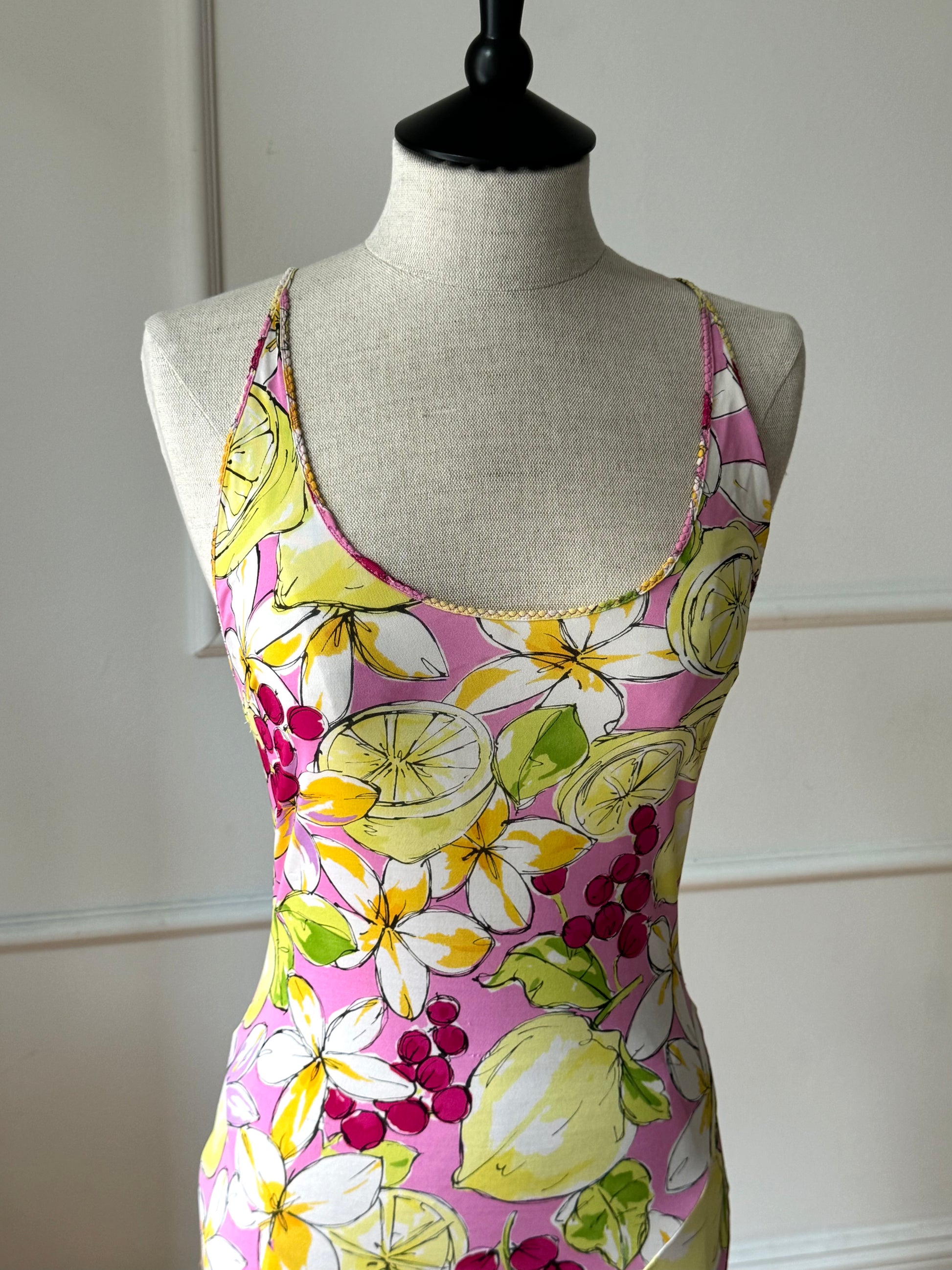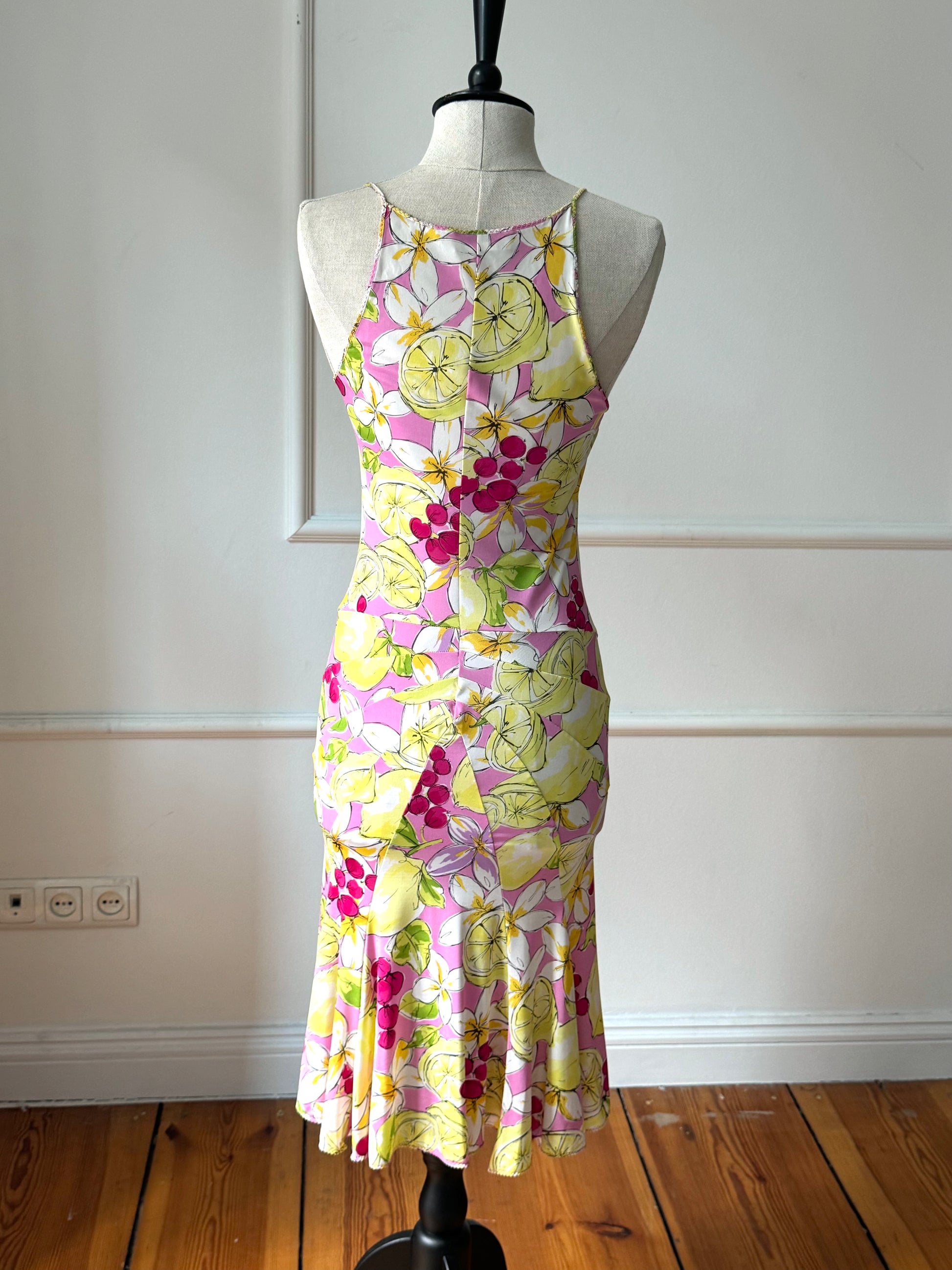 The most stunning vintage Blumarine dress with lemon and cherry print. It's made of the silkiest lightweight fabric you have ever touched and is adorned with decorative hem. The craftsmanship of this dress is impeccable: very unique construction allows it to be both body-hugging and flowy, creating an illusion of an hourglass figure. An absolute gem!