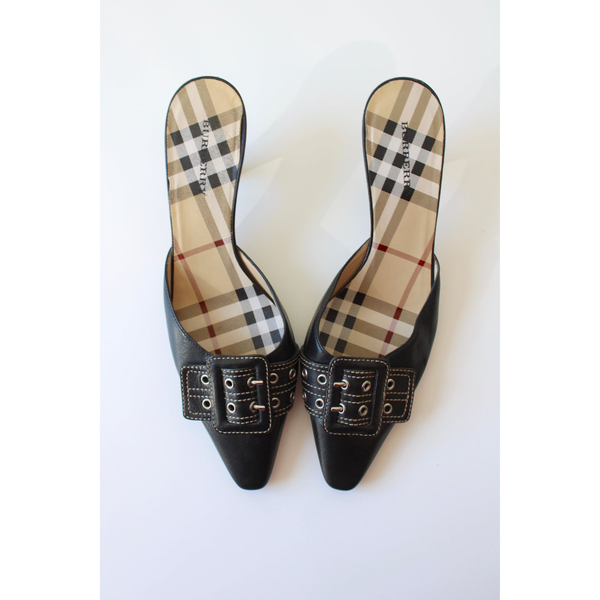Stunning vintage Burberry mules with buckle detailing and iconic Nova check on the insole. The oversized buckle and contrasting stitching add modernity to the classic kitten heels. Meant to be treasured forever.