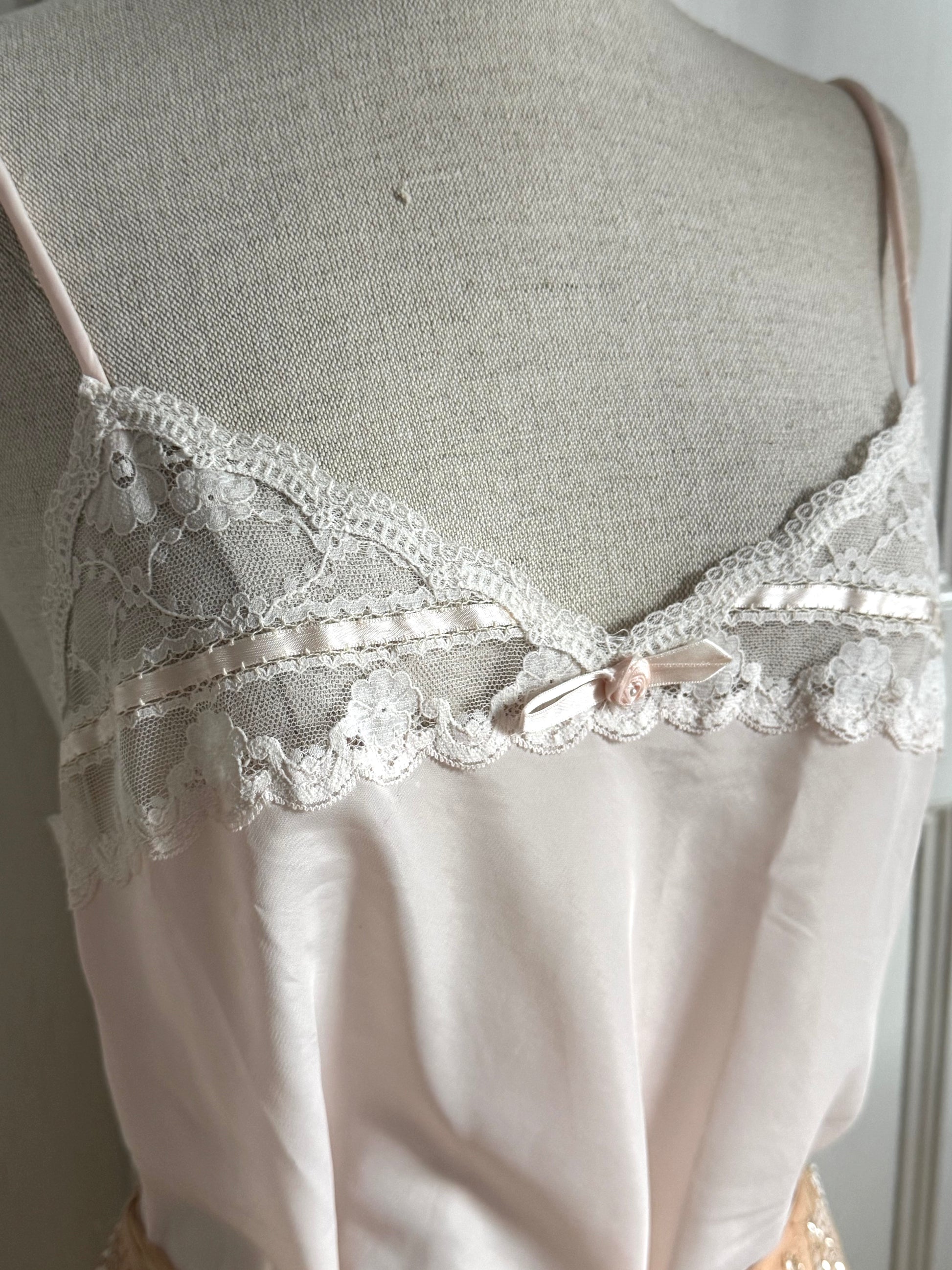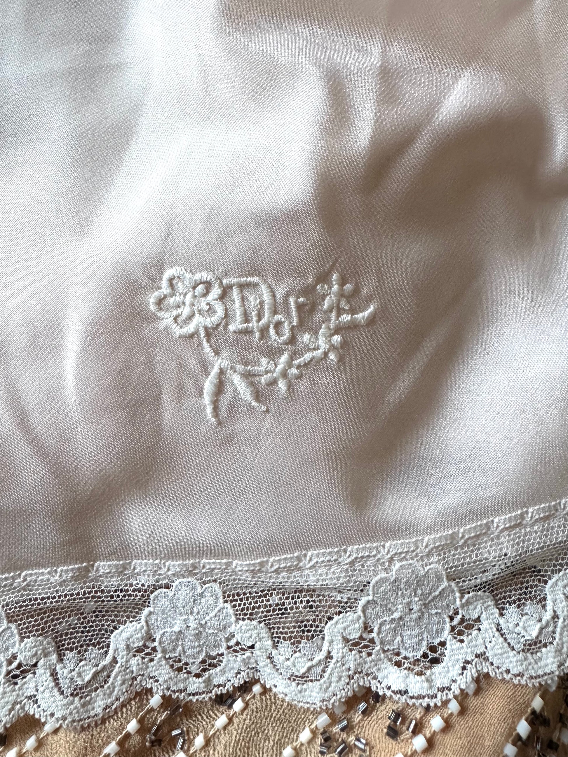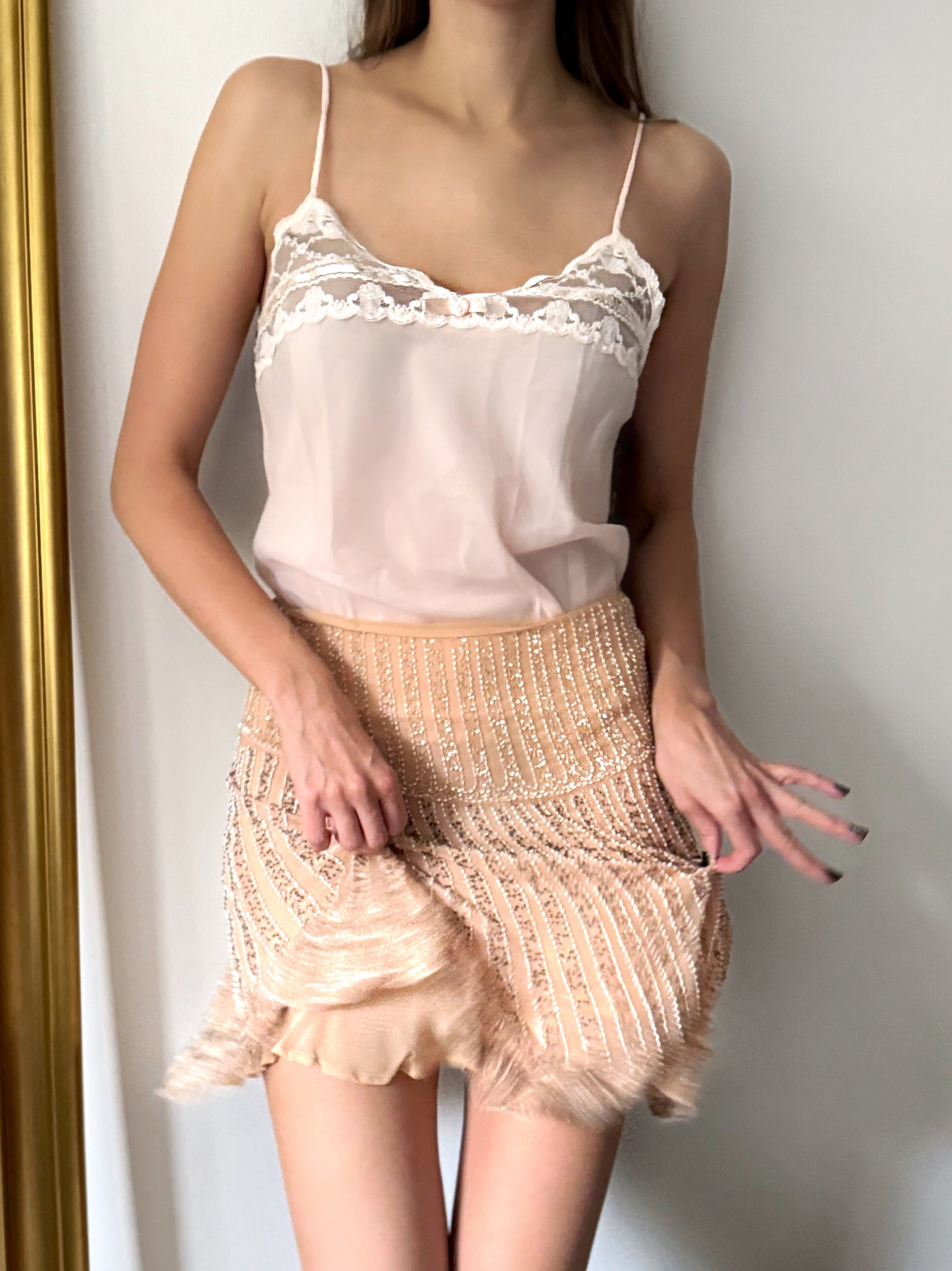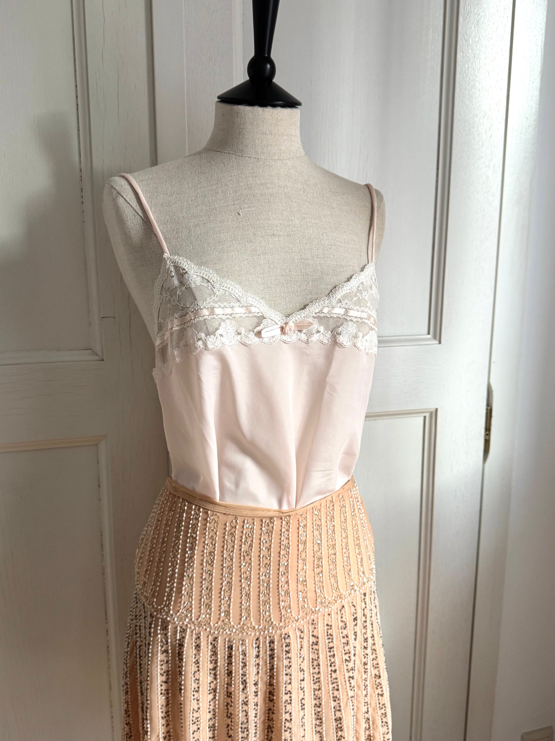 Gorgeous Christian Dior lingerie top in baby pink paired with the Blumarine beaded skirt. The top is adorned with a delicate white lace, pink ribbons and a bow, and "Dior" embroidery at the bottom. The skirt is made of silk and decorated with hand-sewn beads and sequins. Absolutely stunning, feminine set that you can mix and match.