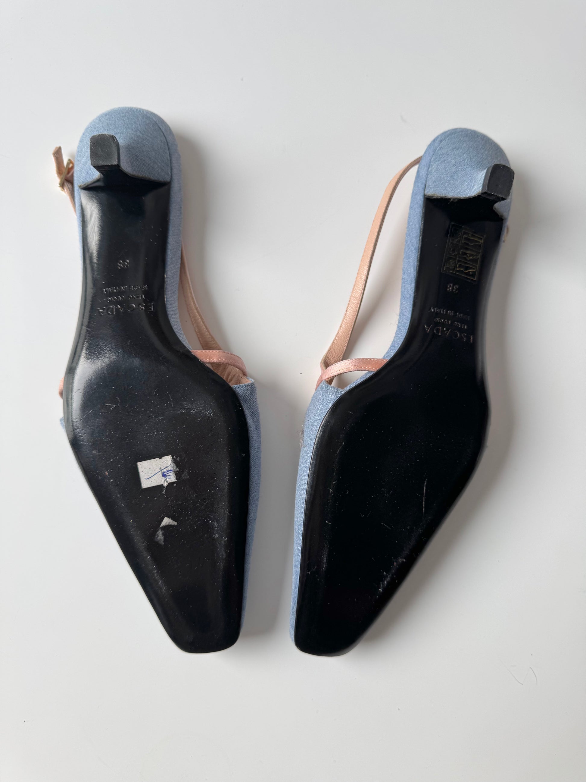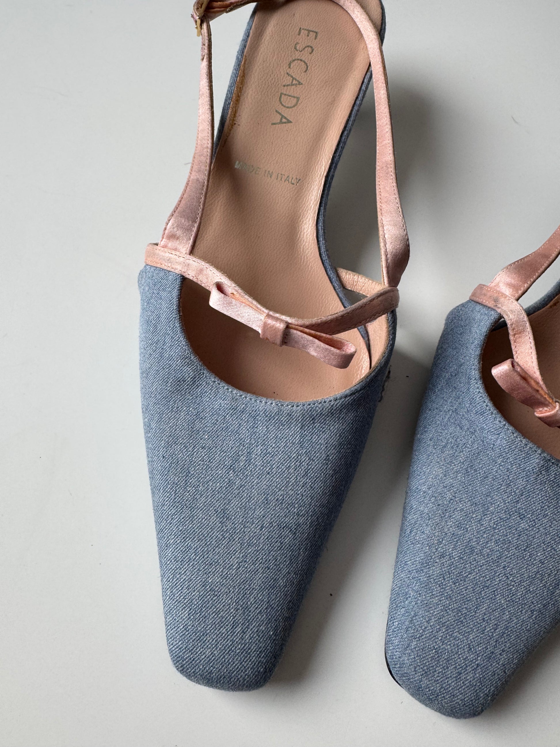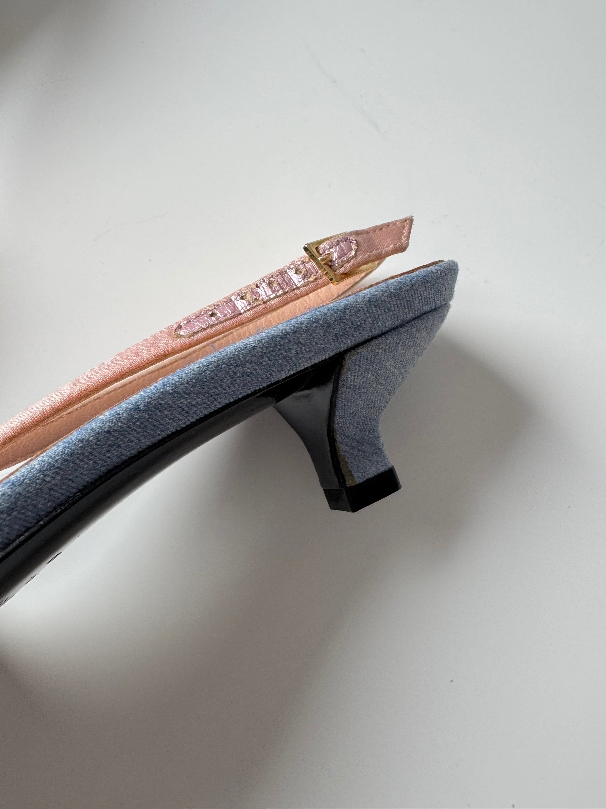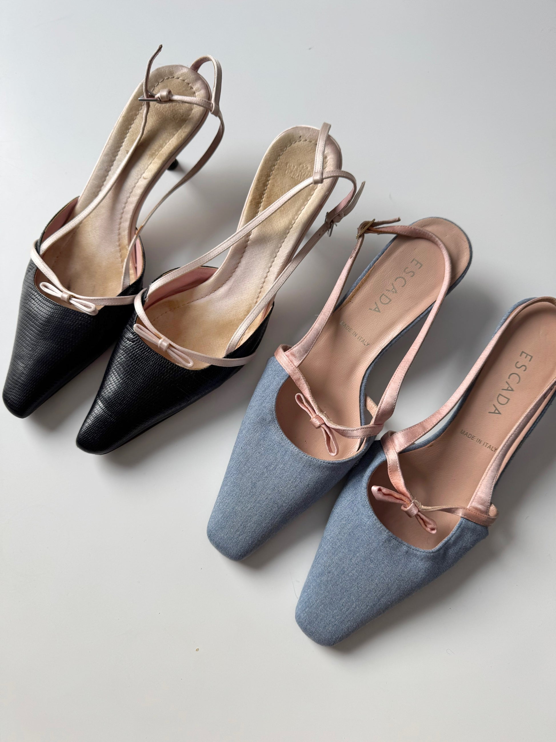 Stunning denim kitten heels by the Italian fashion house, adorned with a satin ribbon. A classic design with a twist that brings to mind ballet and icons like Brigitte Bargot. Perfect for both a business meeting and a romantic date.