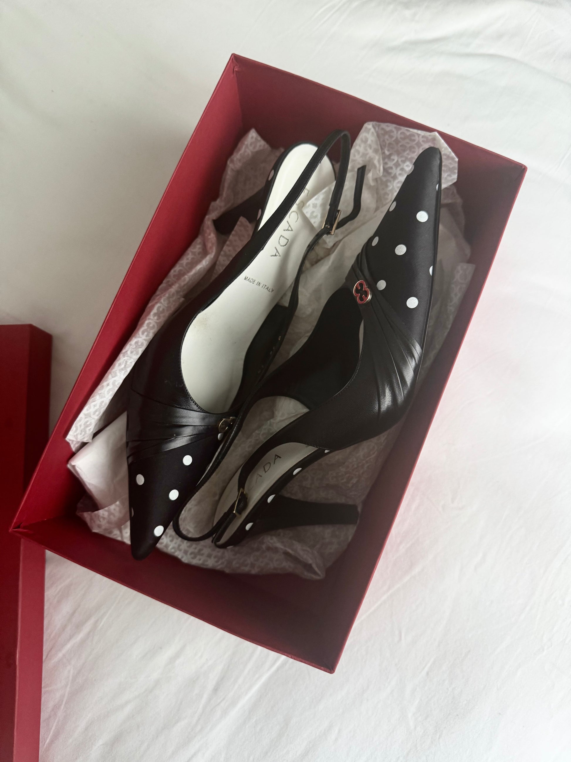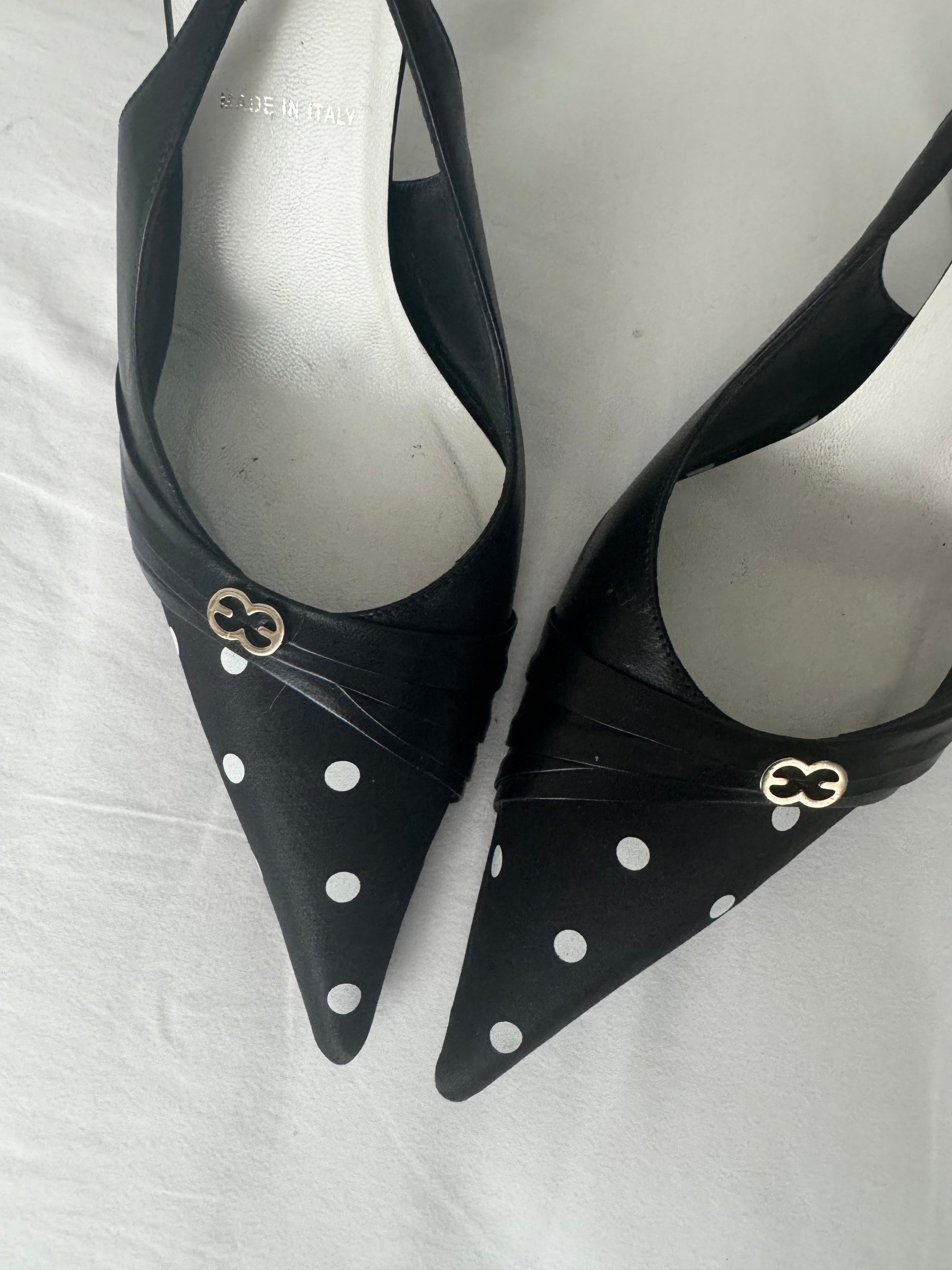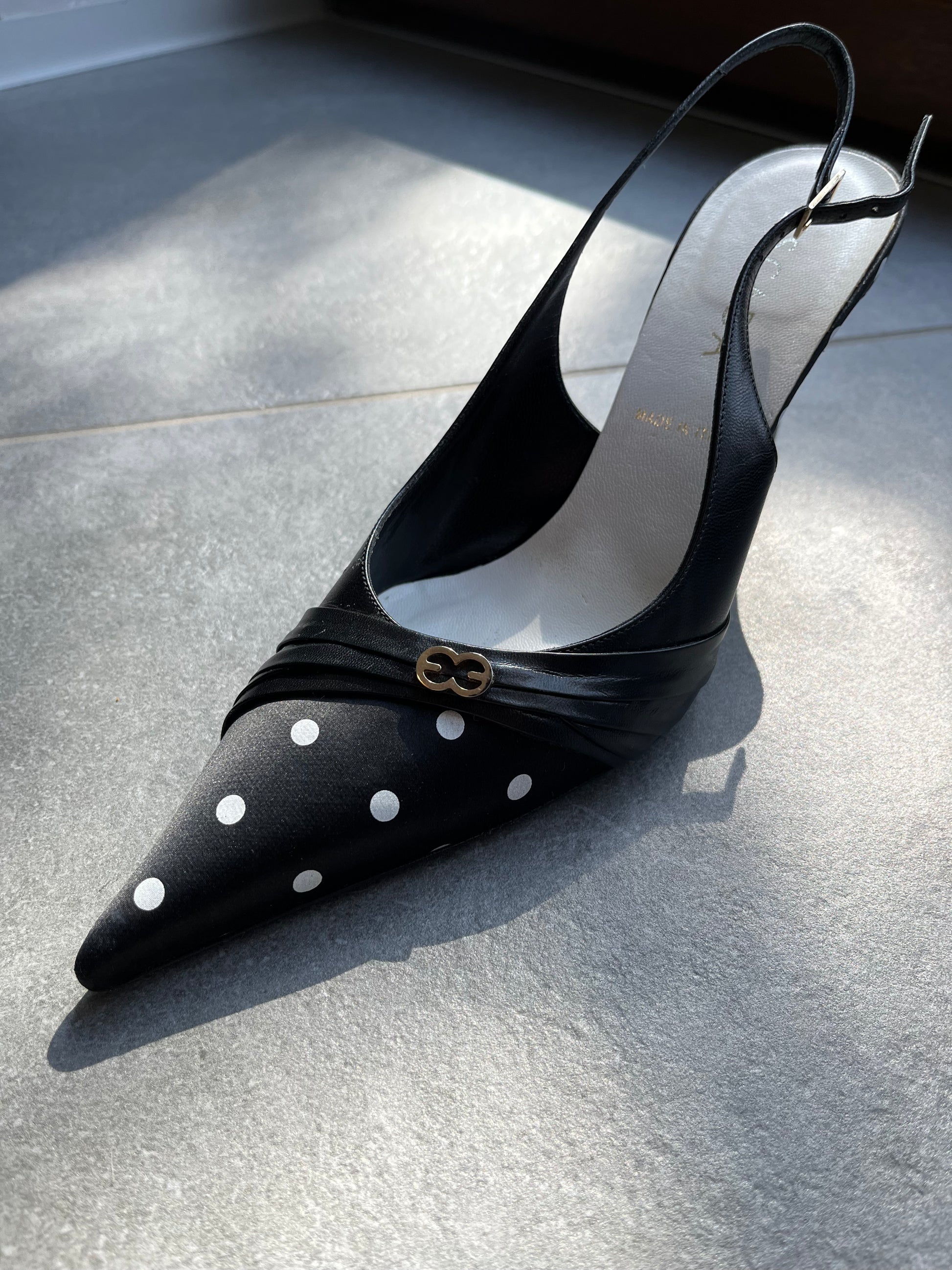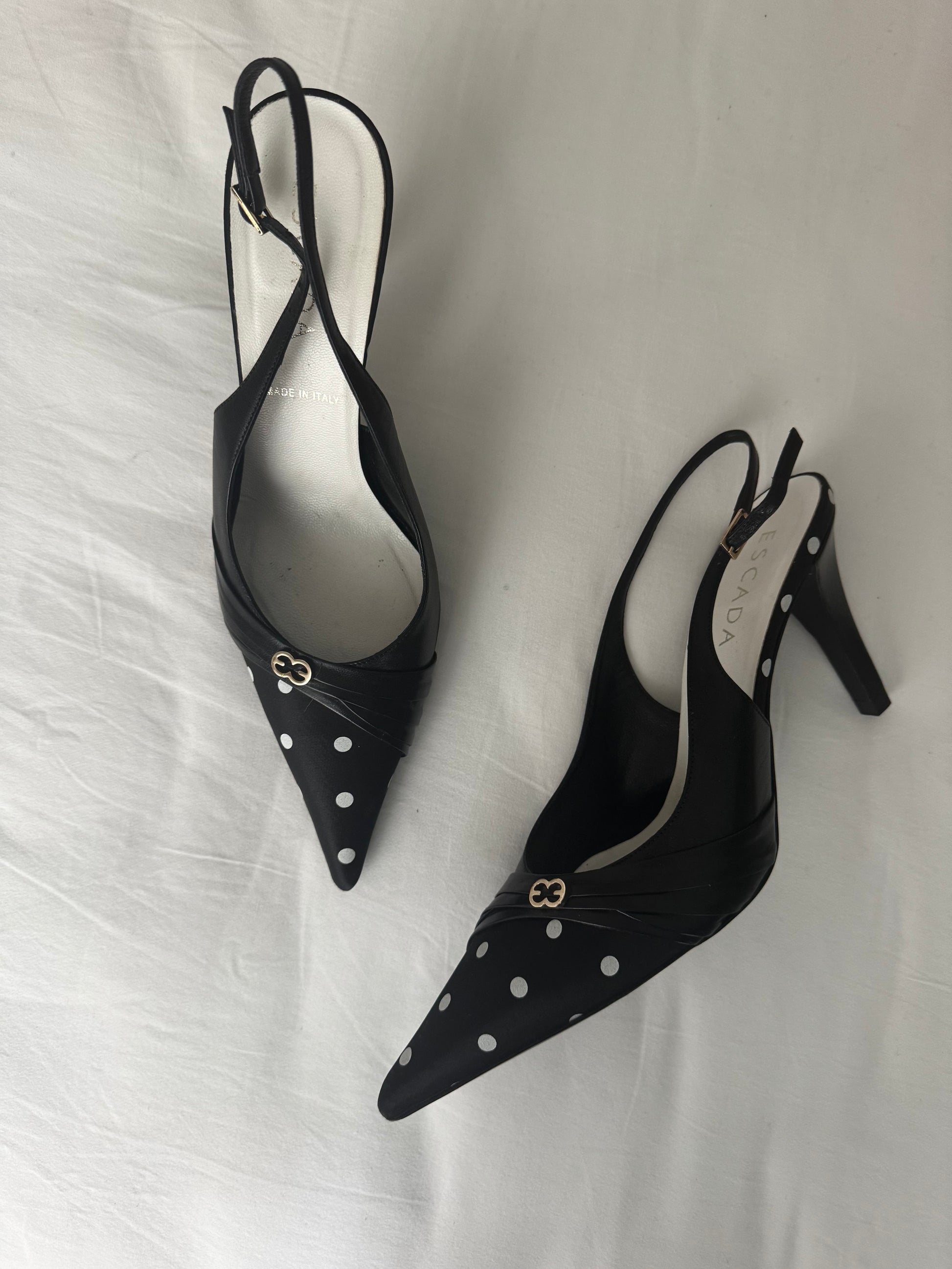 Gorgeous Escada vintage slingback heels, made of leather, layered beautifully like a ribbon, and a silky polka dot fabric adorned with golden Escada logo. Absolutely feminine and elegant - classic silhouette with a twist. Heels look stunning on feet and elevate even the simplest outfit. Very Dolce Vita! Sold with the complimentary box.