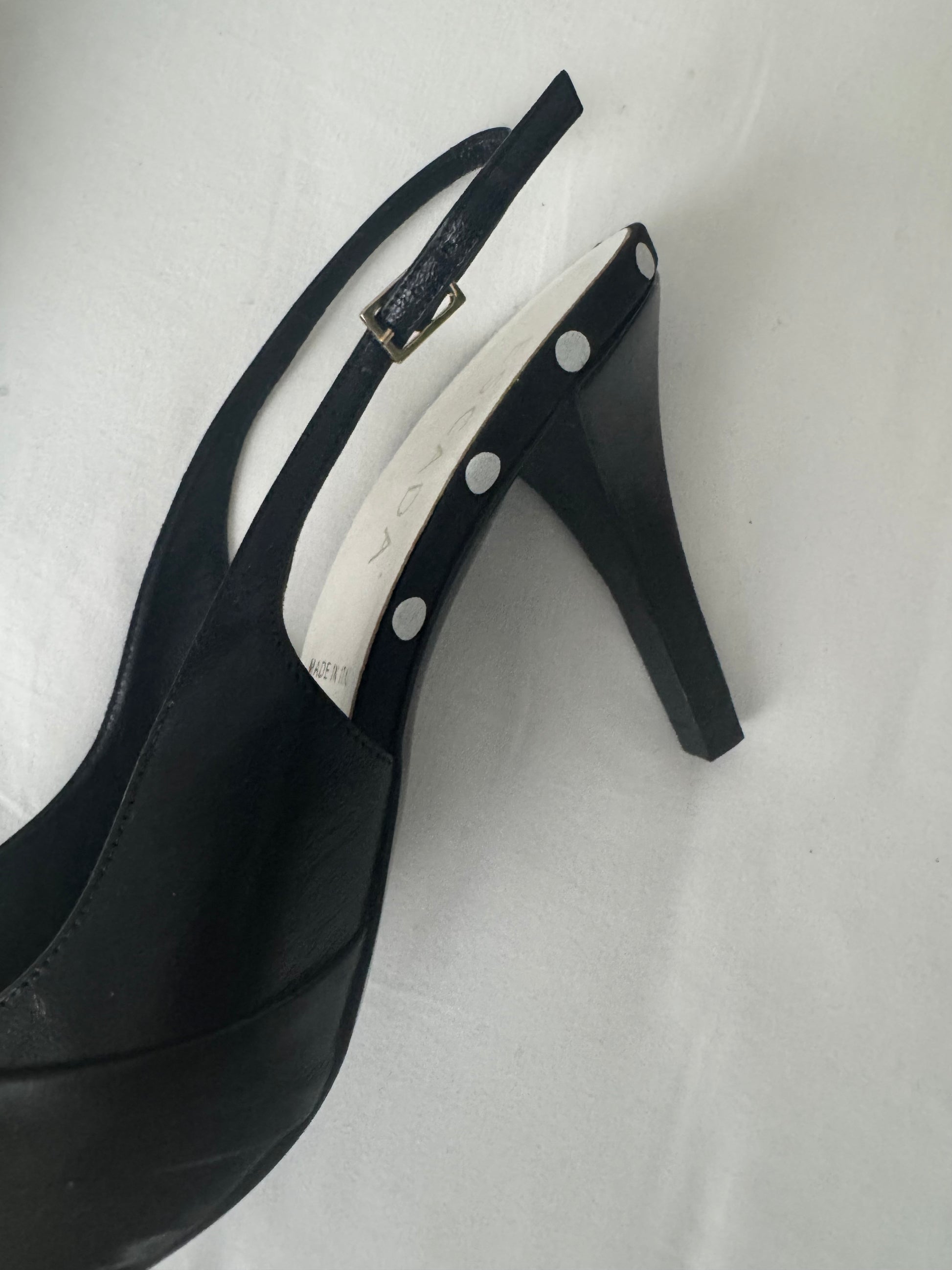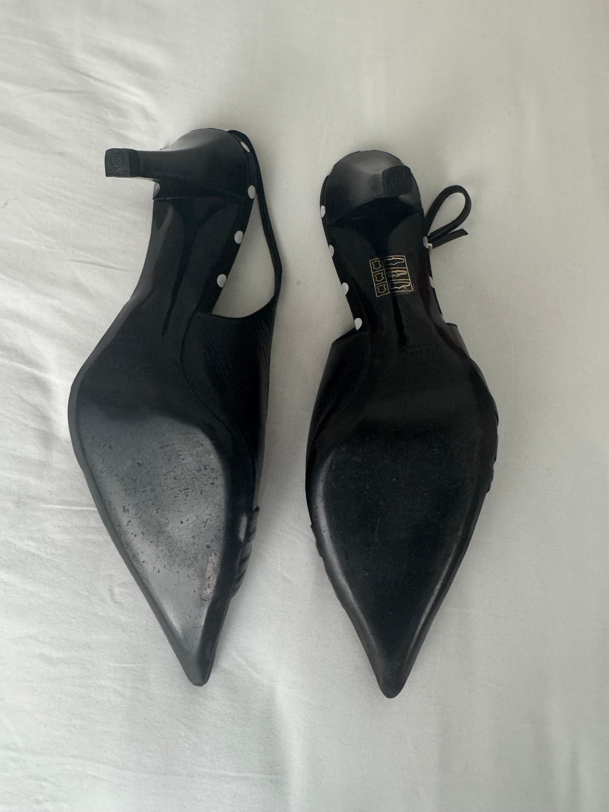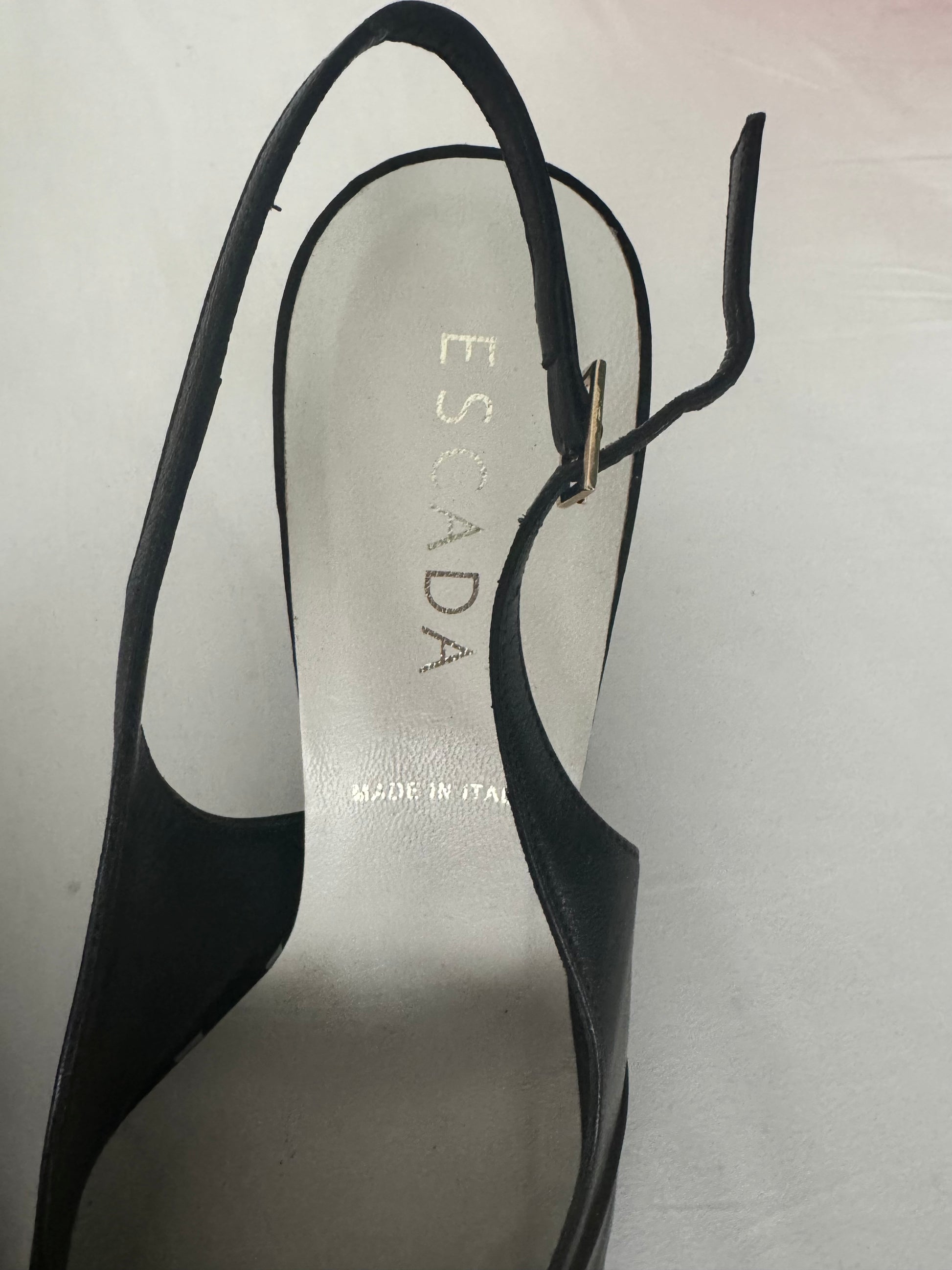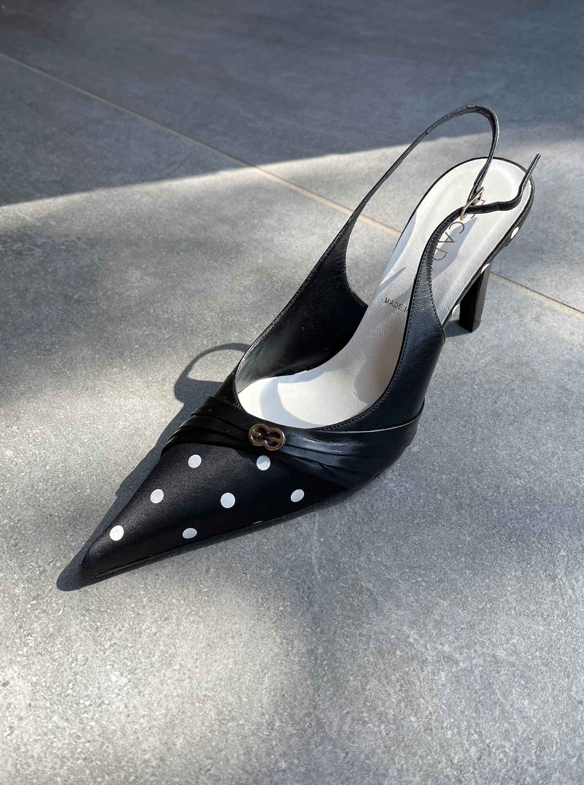 Gorgeous Escada vintage slingback heels, made of leather, layered beautifully like a ribbon, and a silky polka dot fabric adorned with golden Escada logo. Absolutely feminine and elegant - classic silhouette with a twist. Heels look stunning on feet and elevate even the simplest outfit. Very Dolce Vita! Sold with the complimentary box.