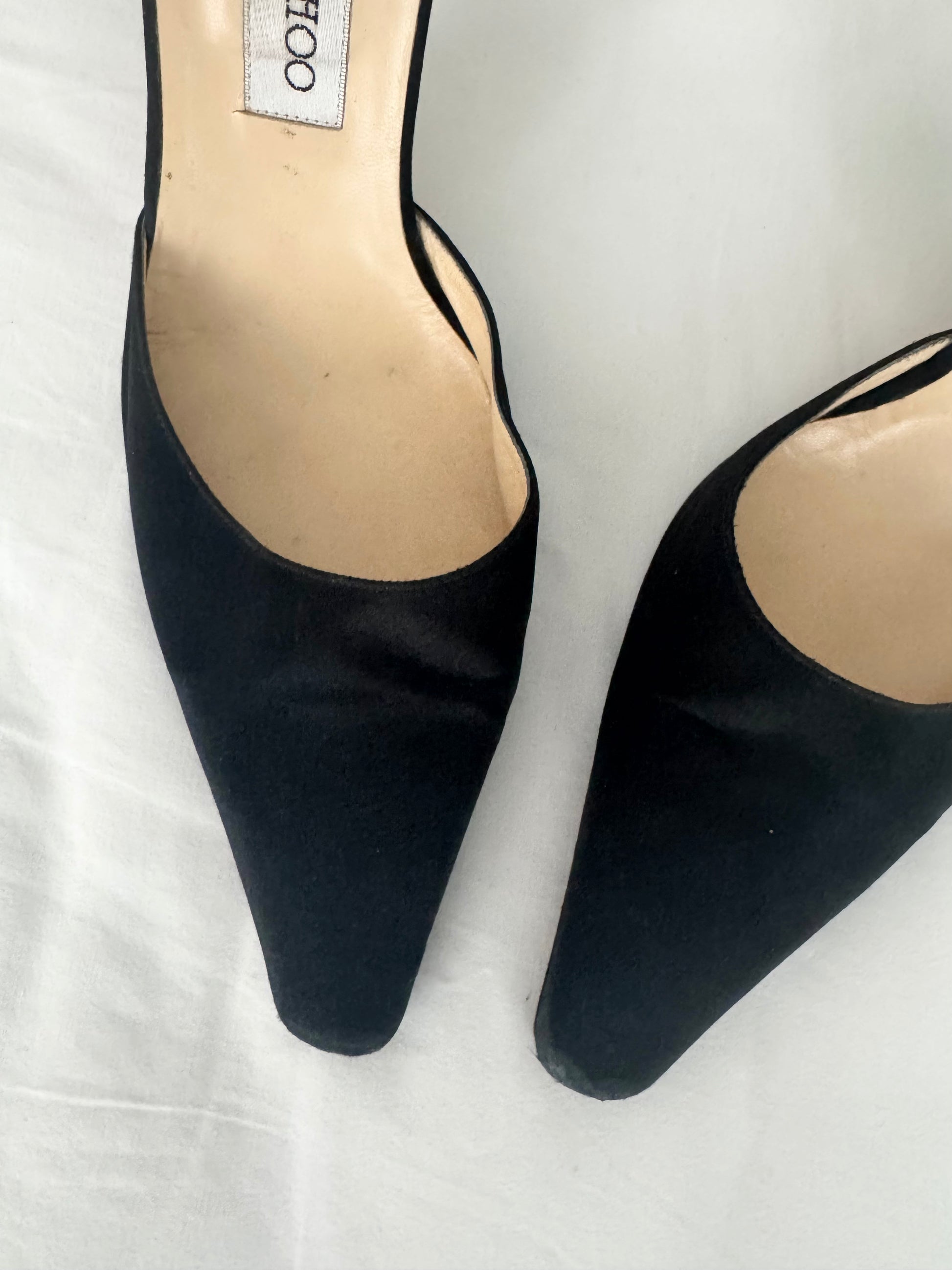 Stunning vintage Jimmy Choo slingback heels made of smooth, satiny fabric and adorned with a fabric-and-sequins rose. Absolutely beautiful classic silhouette with a twist. Very feminine and Dolce Vita - perfect both for dates and your ex's funeral ;)
