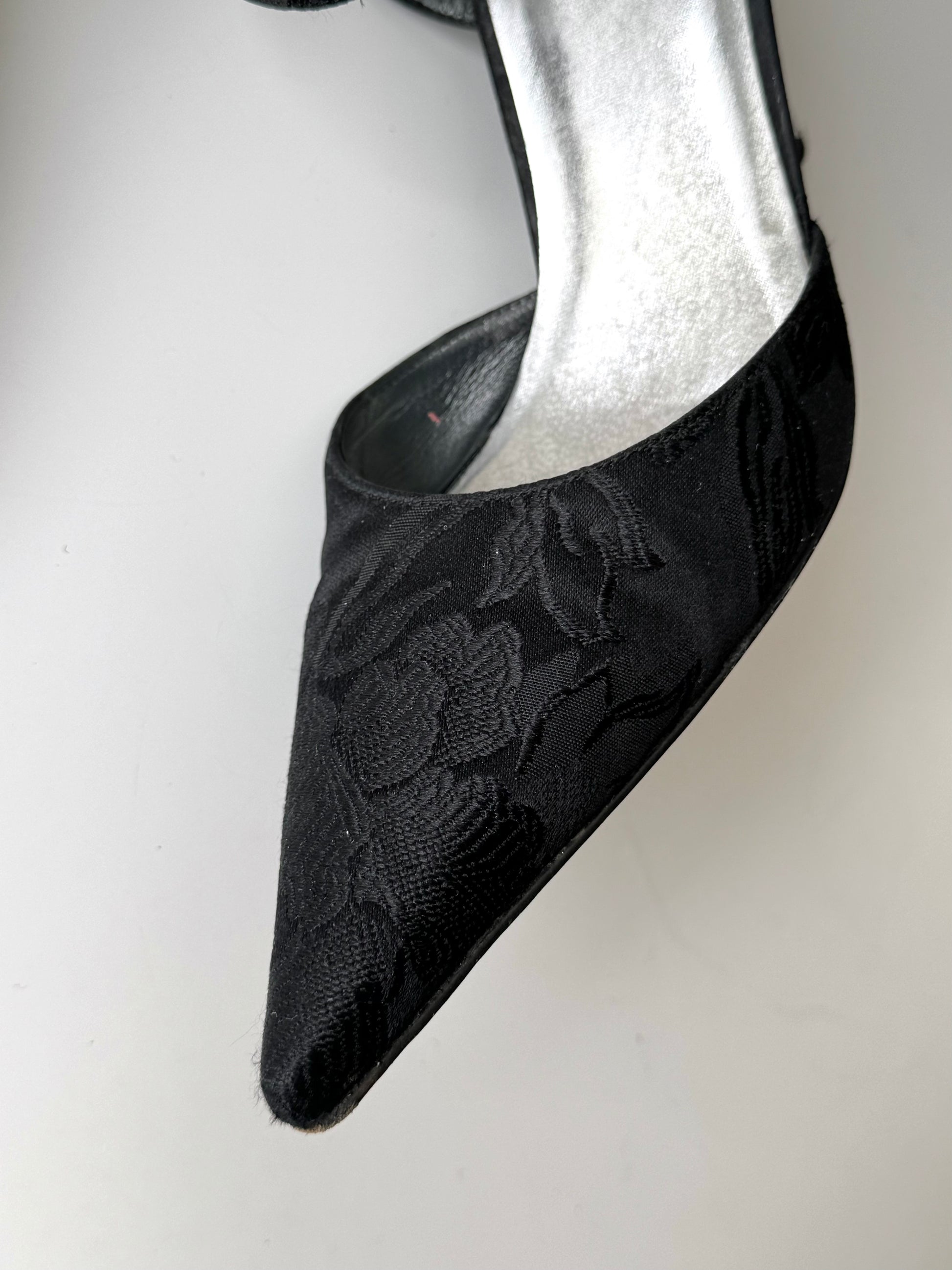 Femme Fatale ankle strap pumps adorned with a silver jewel and a floral jacquard detailing. An absolute staple in your closet if you like to have everyone's eyes on you. Sold with a complimentary box.