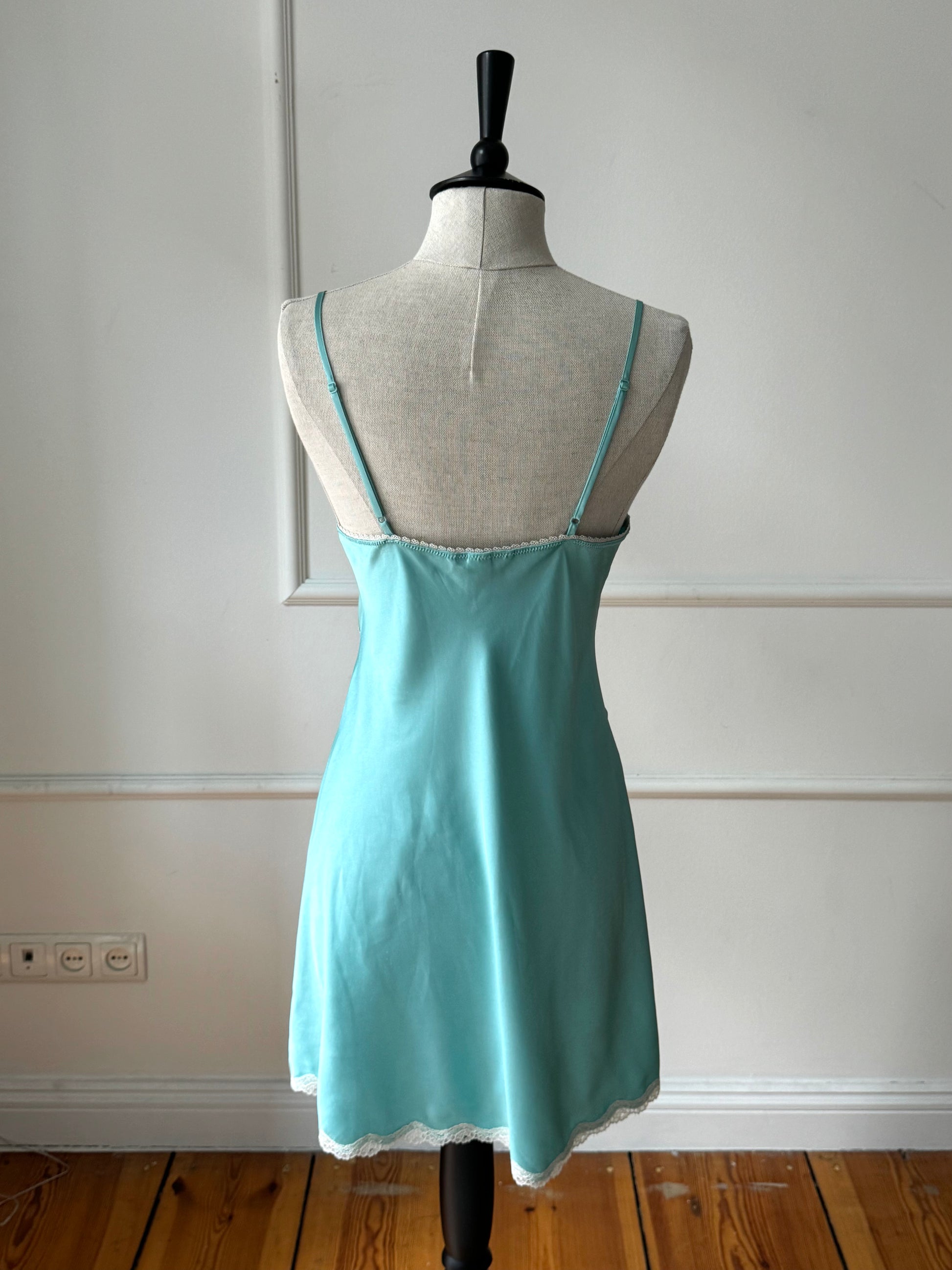 Beautiful Victoria's Secret slip dress adorned with ribbon and lace detailing. Vibrant turquoise color will look stunning against tanned skin. A beautiful piece you want to drink your morning coffee in!